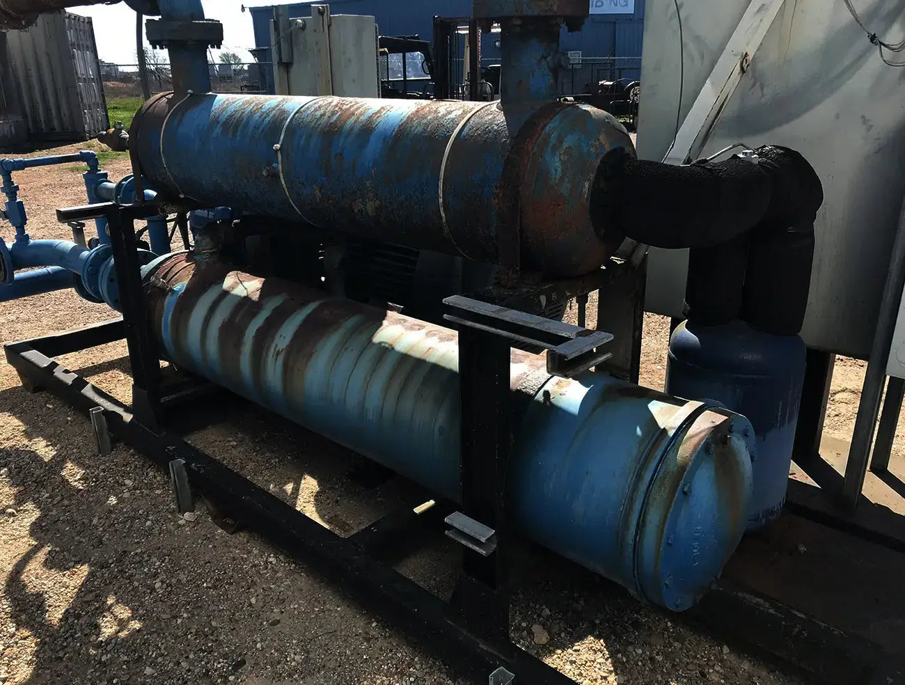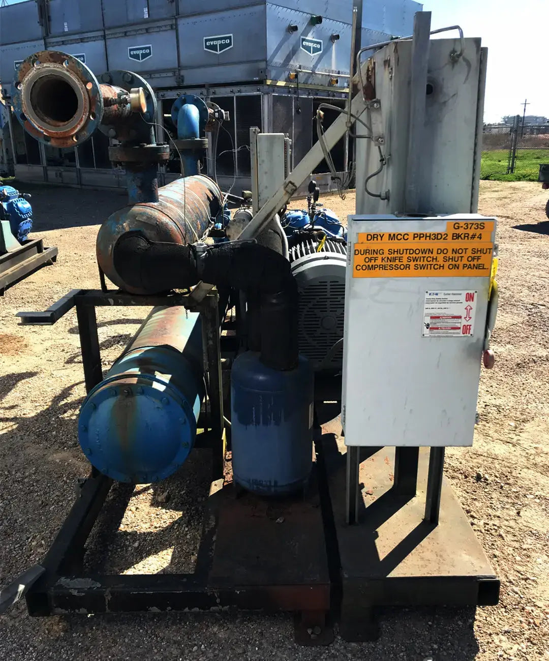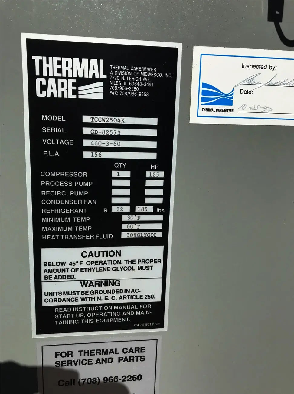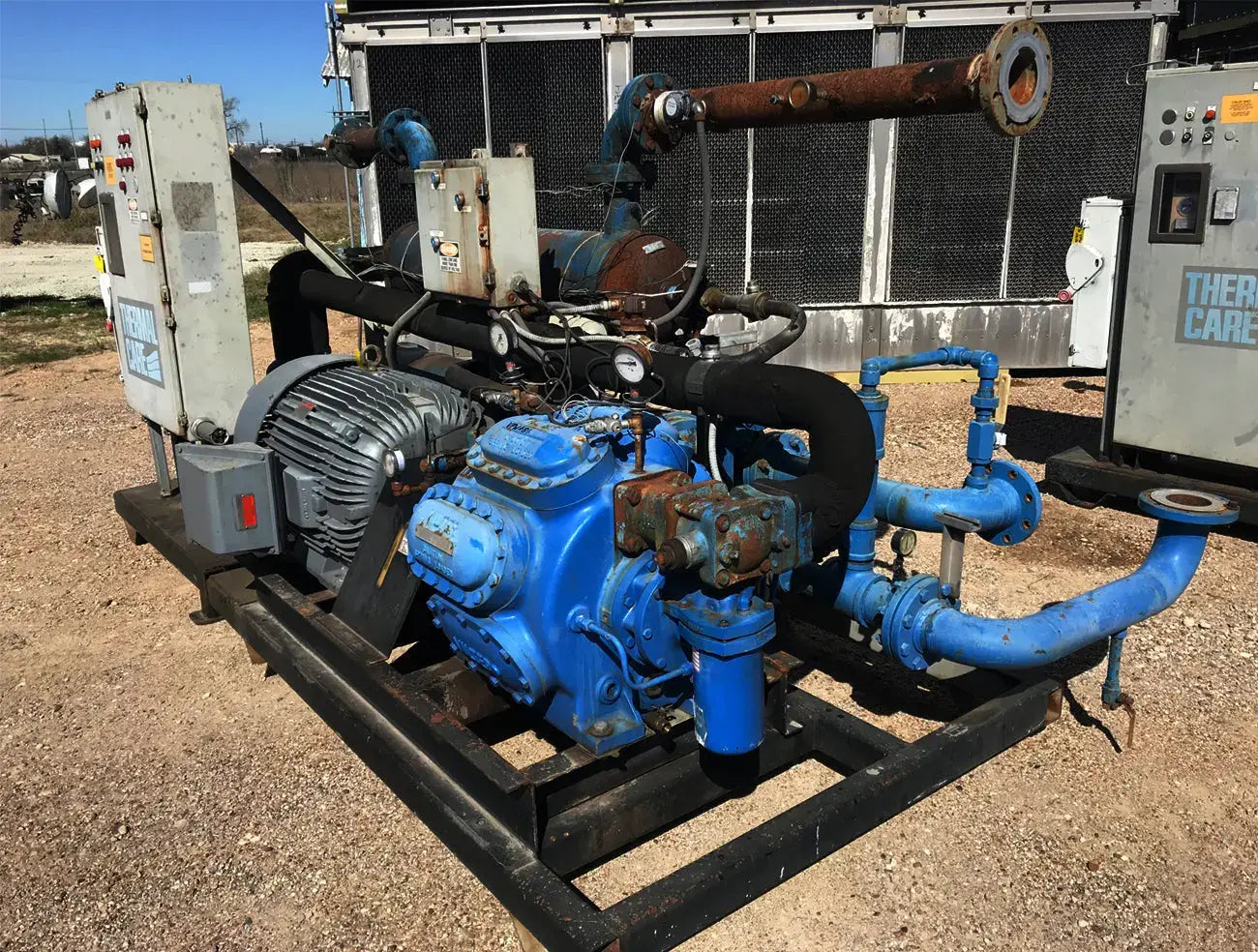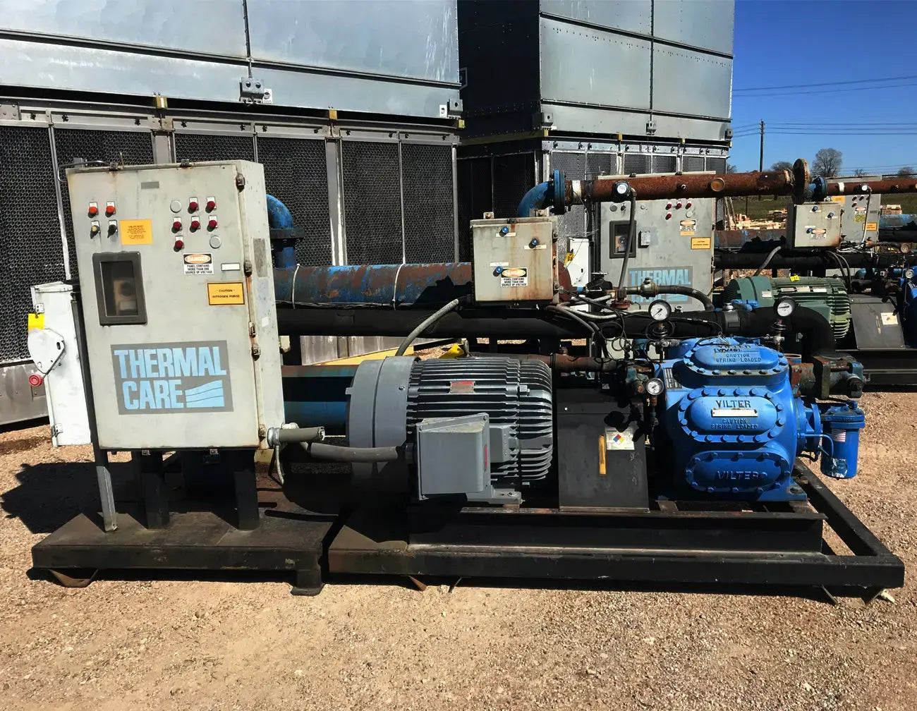 Patín enfriador enfriado por agua de cuidado térmico. Modelo: TCCW2504X. Serie: CD-82573 Patín G-373N. Fluido caloportador: 30% glicol. Temperatura mínima: +30F, temperatura máxima: 60F. Refrigerante: freón. Cuenta con compresor alternativo Vilter, condensador de carcasa y tubos, barril enfriador de carcasa y tubos y panel de control. La aplicación anterior fue 1100 GPM de glicol de 49F a 38F y agua de torre de enfriamiento de 74F. Compresor alternativo Vilter serie 350, tamaño M17K357ESD, serie 75905, pedido S153677, refrigerante R-22. Número de cilindros: 7. Motor Reliance: 125 HP, 1785 RPM, 460 V, trifásico, 60 Hz, TEFC, bastidor 444T. Peso: 8,650 libras. Dimensiones totales: 13,5 pies de largo x 7 pies de ancho x 6 pies de alto.