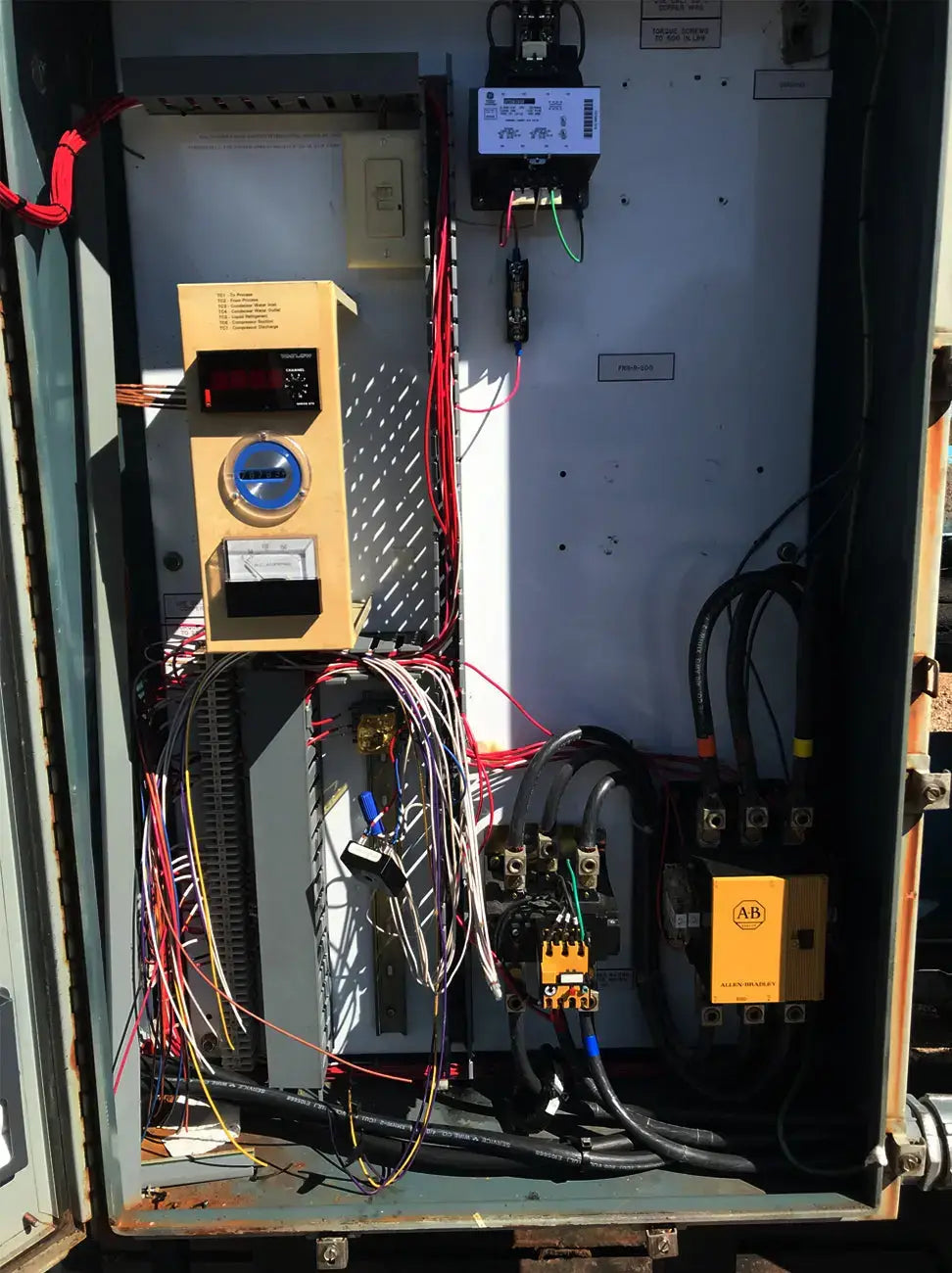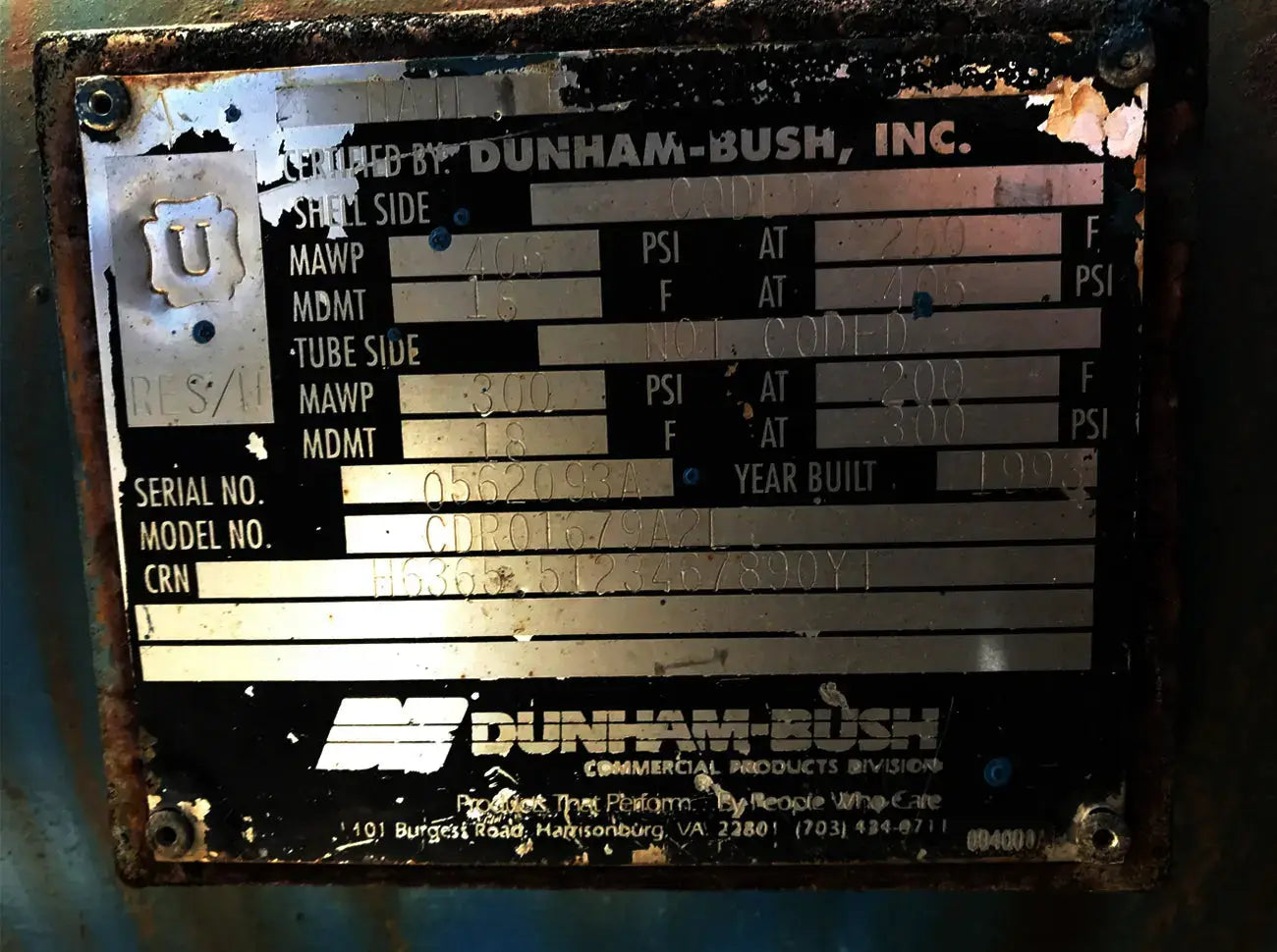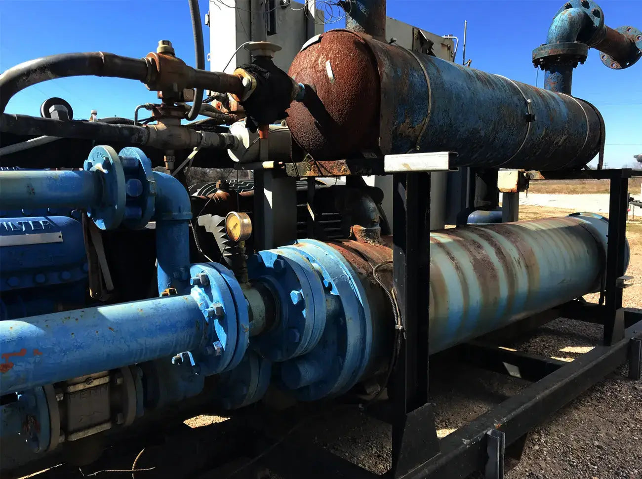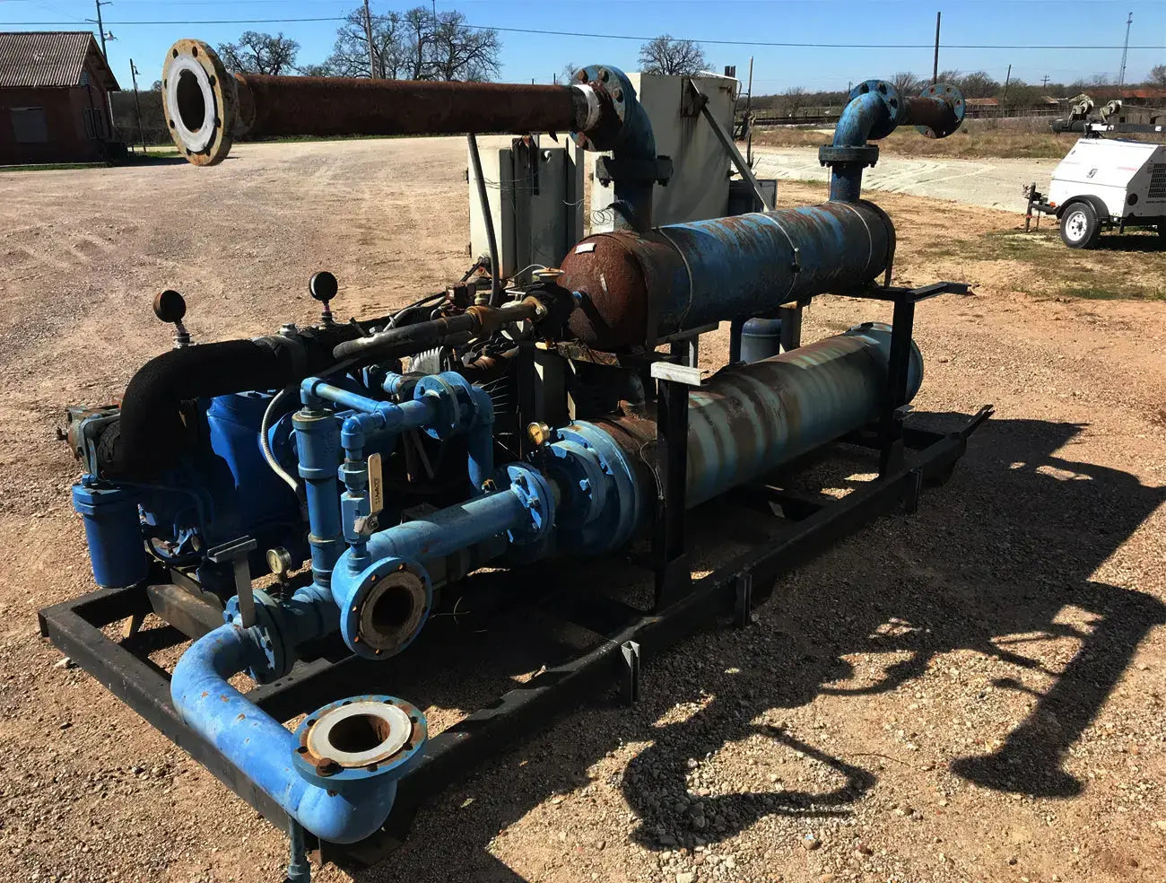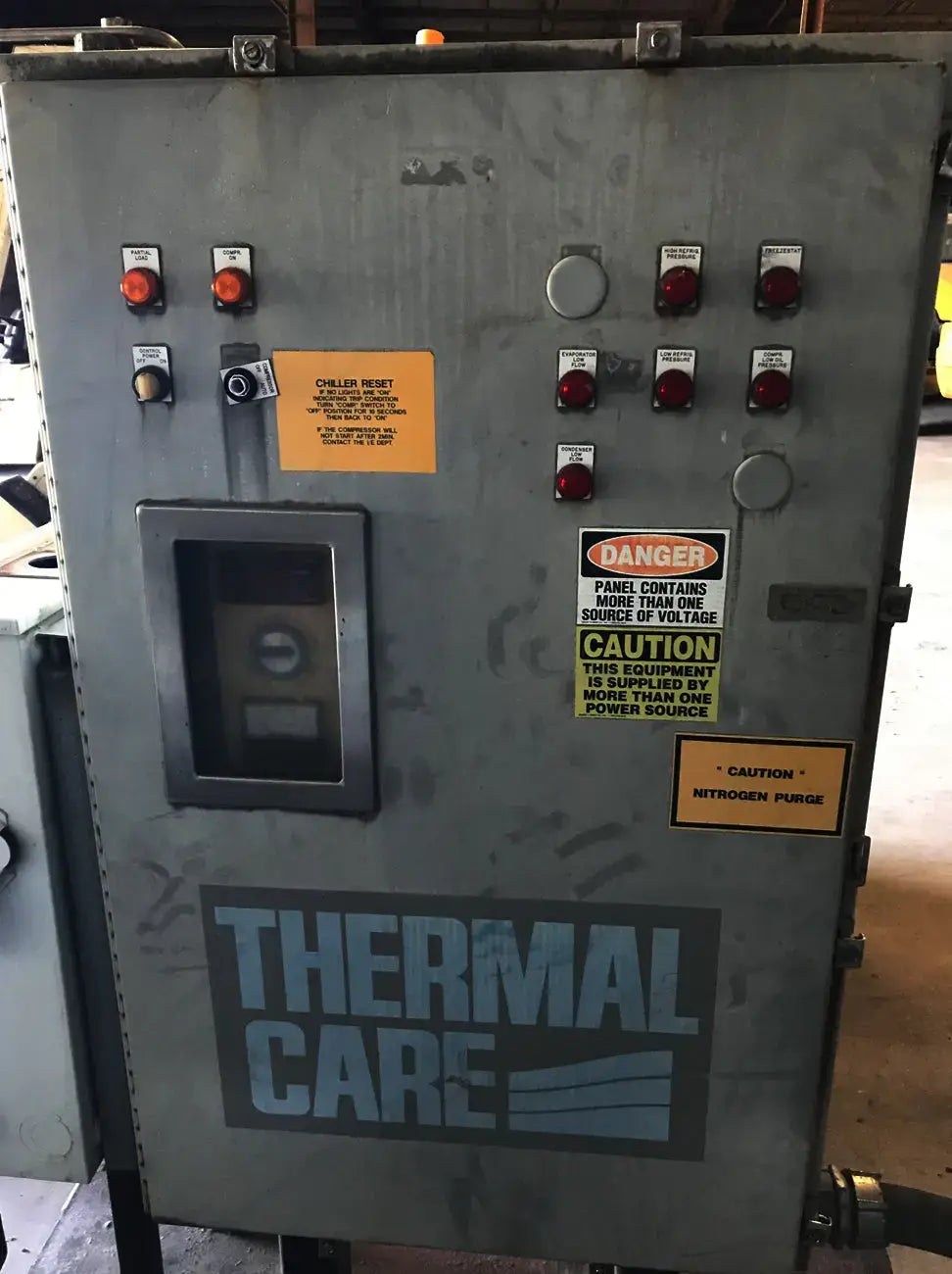Patín enfriador enfriado por agua de cuidado térmico. Modelo: TCCW2504X. Serie: CD-82573 Patín G-373N. Fluido caloportador: 30% glicol. Temperatura mínima: +30F, temperatura máxima: 60F. Refrigerante: freón. Cuenta con compresor alternativo Vilter, condensador de carcasa y tubos, barril enfriador de carcasa y tubos y panel de control. La aplicación anterior fue 1100 GPM de glicol de 49F a 38F y agua de torre de enfriamiento de 74F. Compresor alternativo Vilter serie 350, tamaño M17K357ESD, serie 75905, pedido S153677, refrigerante R-22. Número de cilindros: 7. Motor Reliance: 125 HP, 1785 RPM, 460 V, trifásico, 60 Hz, TEFC, bastidor 444T. Peso: 8,650 libras. Dimensiones totales: 13,5 pies de largo x 7 pies de ancho x 6 pies de alto.