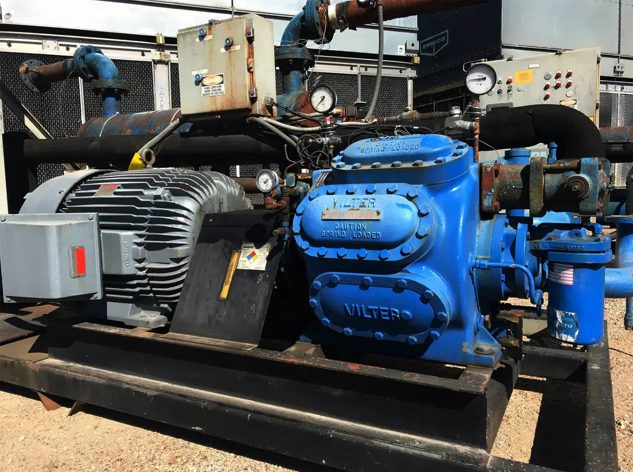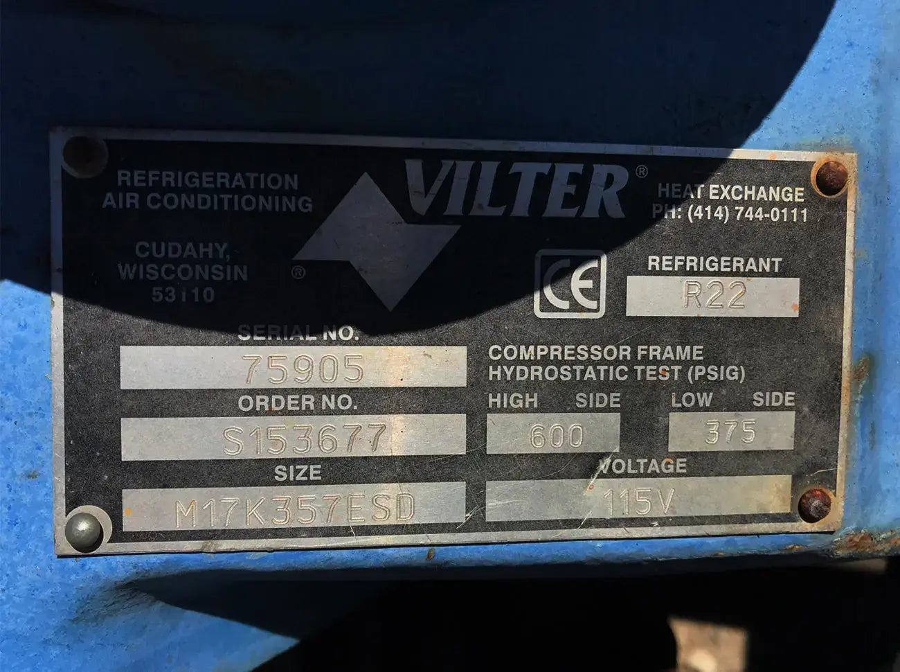 - Descripciones de compresores: Vilter 350 Series Reciprocating Compressor, size M17K357ESD, serial 75905, order S153677, refrigerant R-22. Number of cylinders: 7