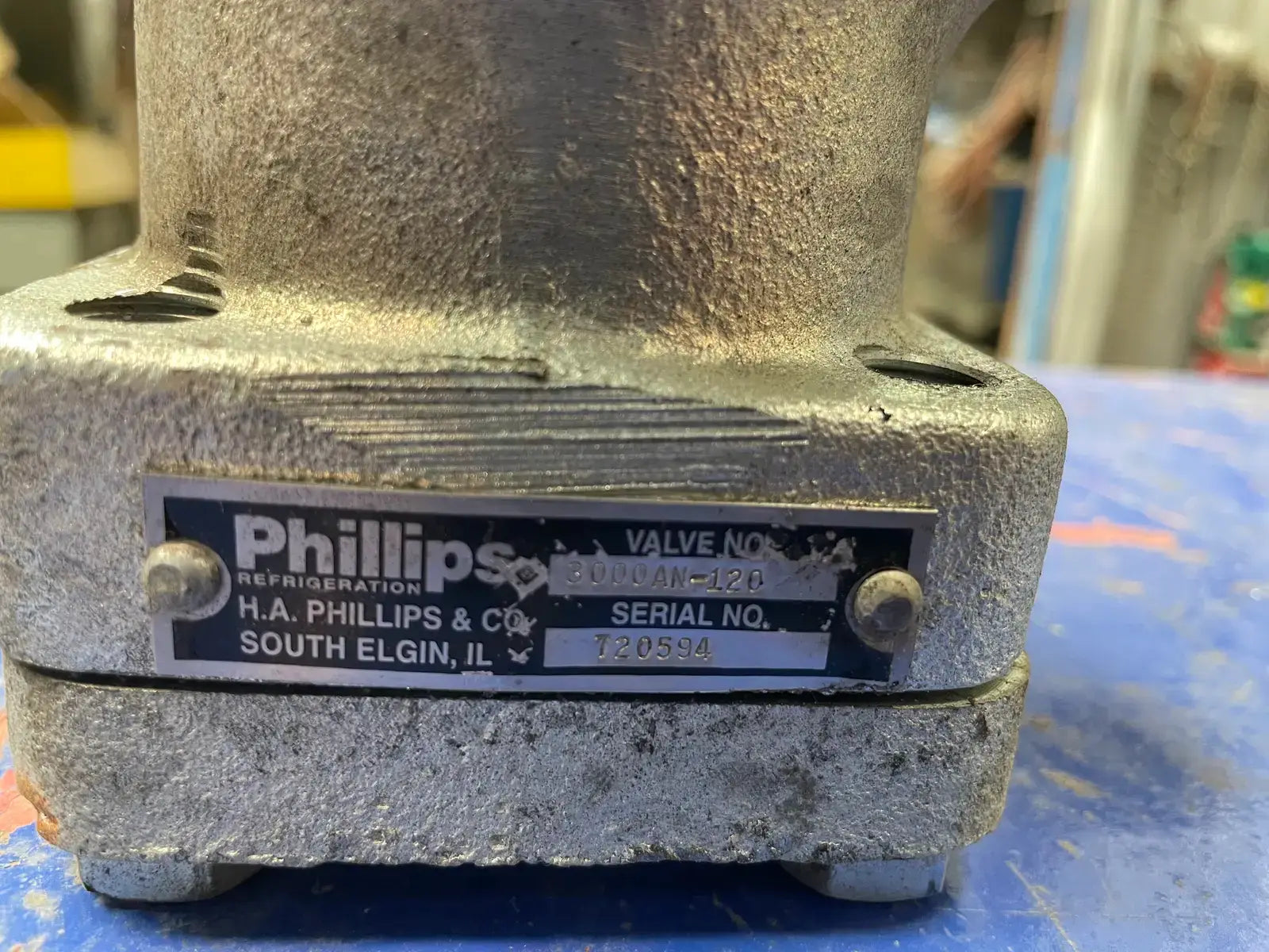 Válvula automática de 3 vías Phillips Refrigeration serie 3000N. Tipo: 3000AN-120. N.º de serie: 720594. Presión nominal: 300 PSIG. Temperatura nominal: -20 °F a 240 °F.