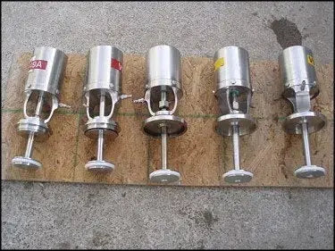 (5) Piezas de válvula neumática de acero inoxidable Waukesha Cherry-Burrell. Modelo: WVALVE00117. Dimensiones totales: 5-1/2 pulgadas de largo x 5-1/2 pulgadas de ancho x 1 pie 4-1/2 pulgadas de alto.
