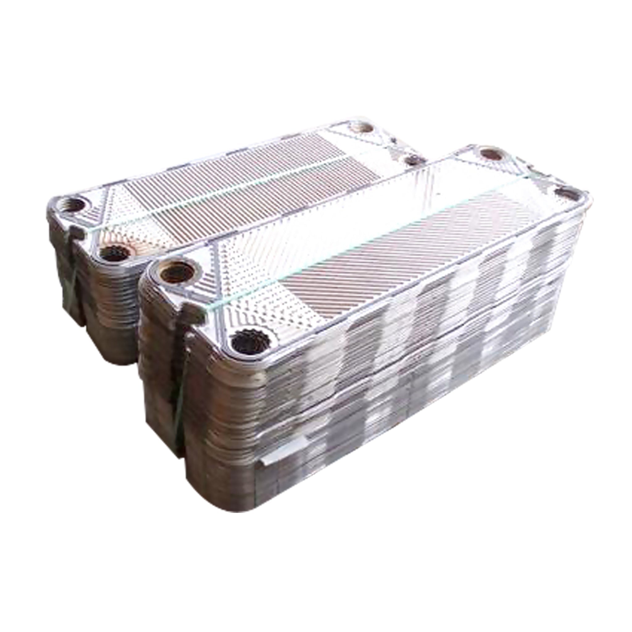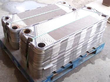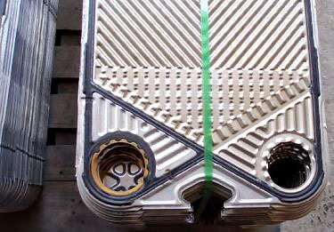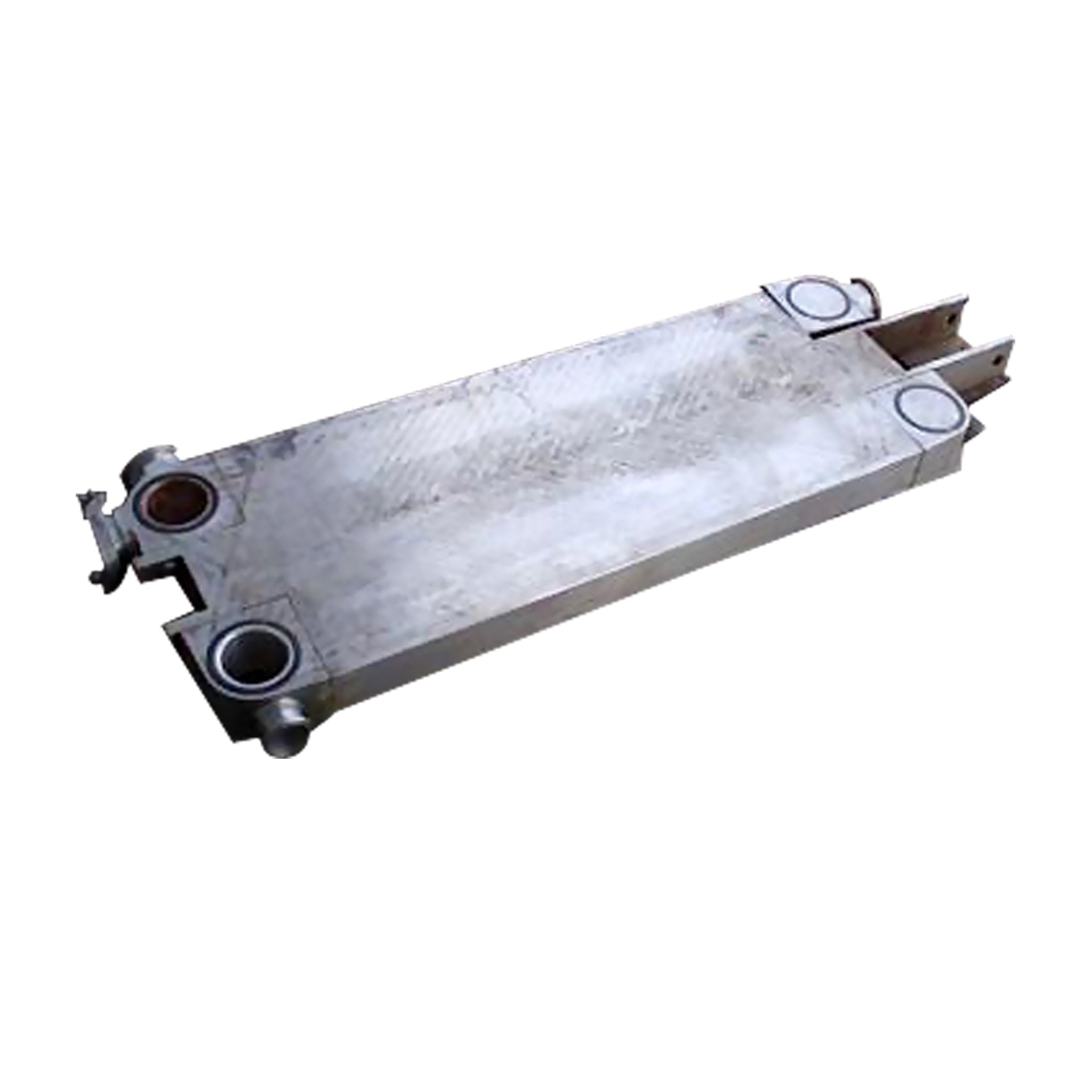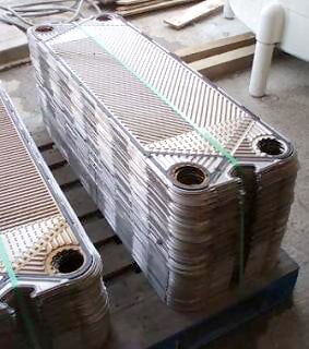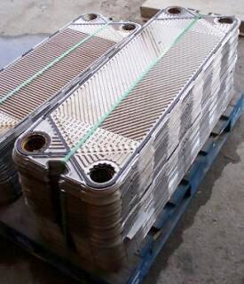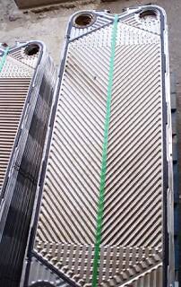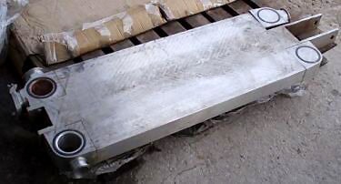 (116) Placas de prensa APV de acero inoxidable con placa divisoria. Placas divisorias: (1). Entradas/salidas: (4) 3 pulg. de diámetro. puertos. Dimensiones totales: 45 pulgadas de largo x 15 pulgadas de ancho.