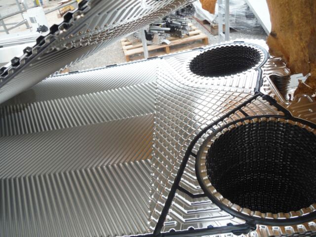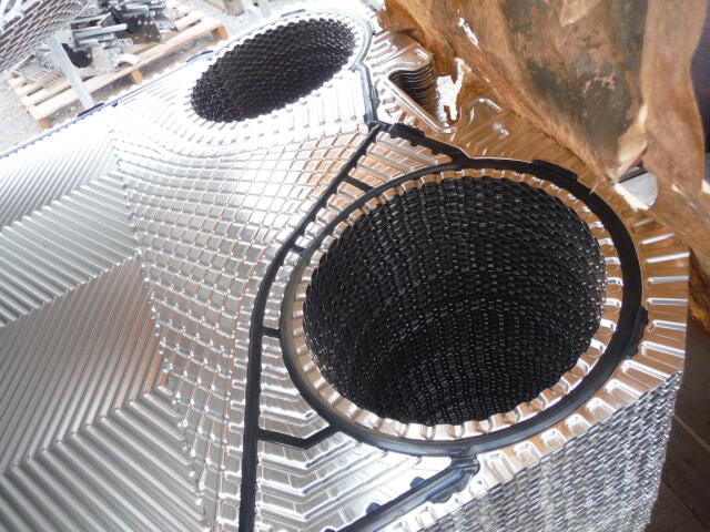 Placas de repuesto del intercambiador de calor AGC ProFlow de acero inoxidable para el modelo A65 Frame. Cantidad disponible: 61 platos.