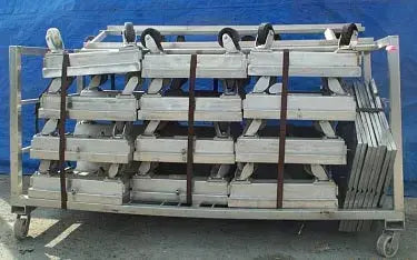 (12) Plataformas rodantes de acero inoxidable de 30 pulgadas de largo x 24 pulgadas de ancho x 12 pulgadas de alto con salida de 1/2 pulgada en el costado de la plataforma rodante, con (8) cubiertas de 28 pulgadas de largo x 23 pulgadas de ancho x 1 pulgada Alto. Mesa con plataforma rodante grande de acero inoxidable de 87 pulgadas de largo x 36 pulgadas de ancho x 46-1/2 pulgadas de alto.