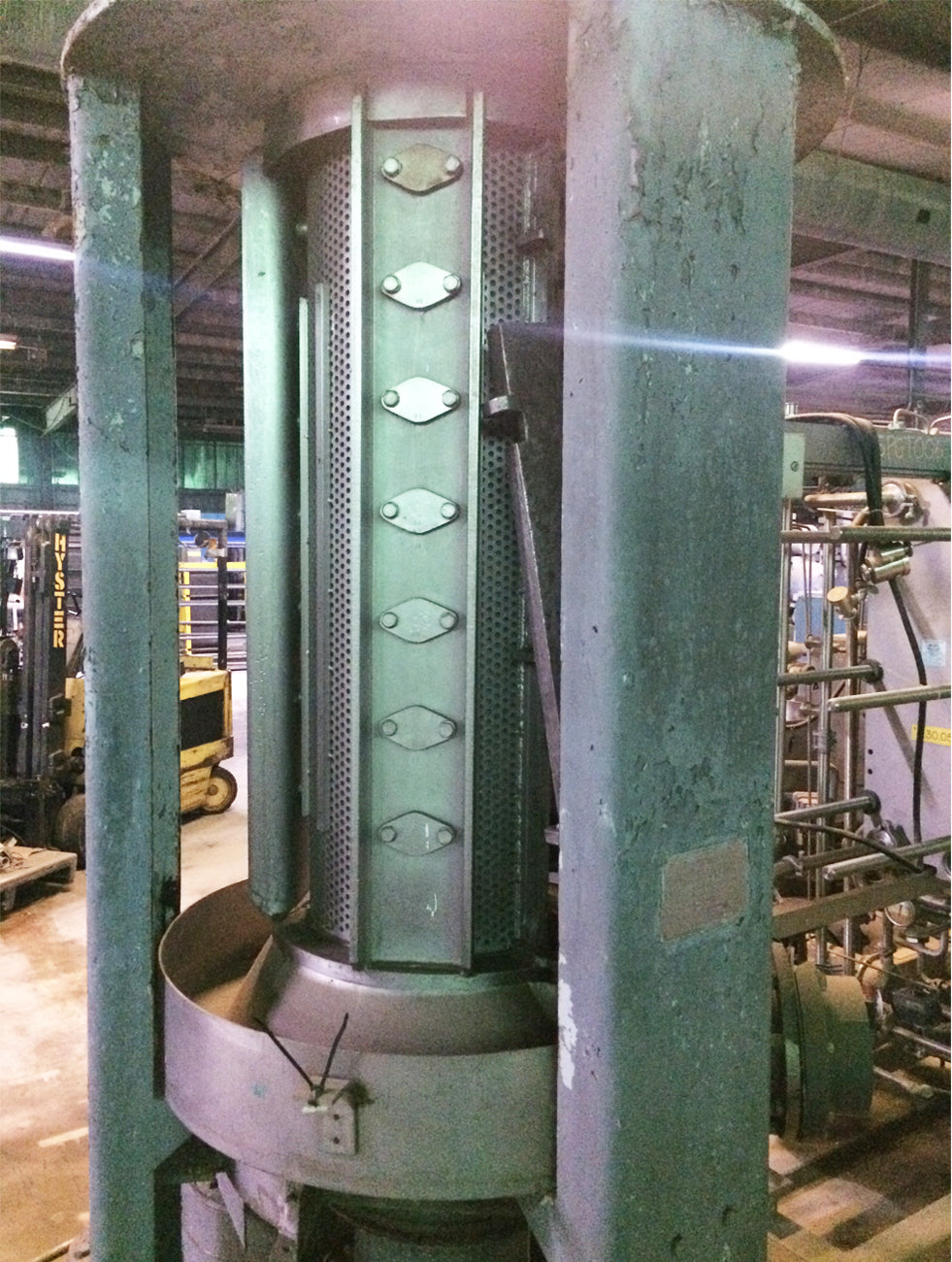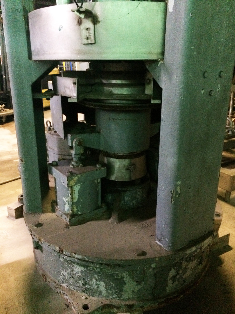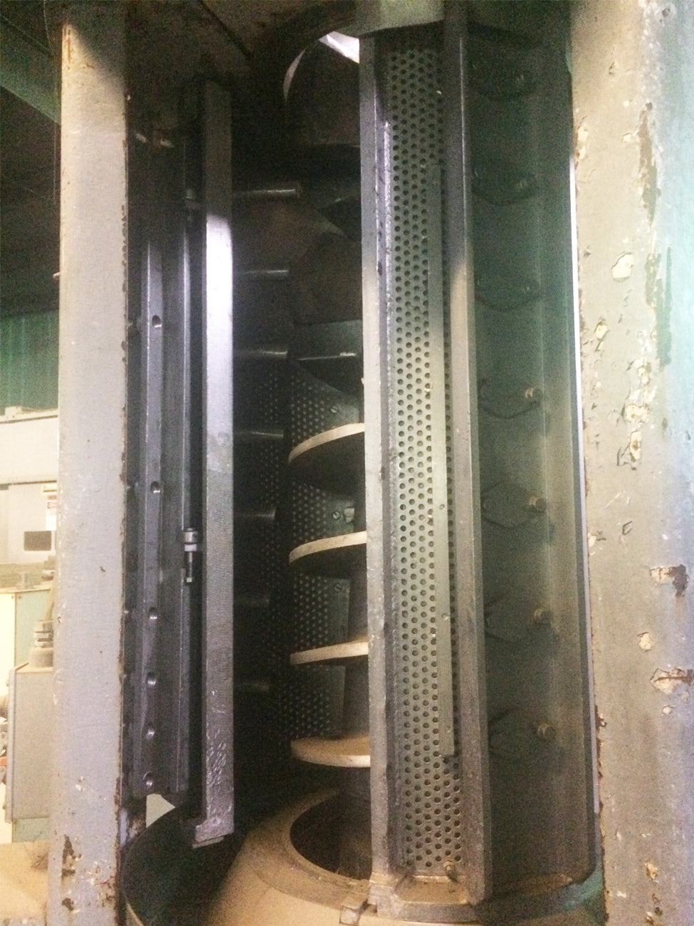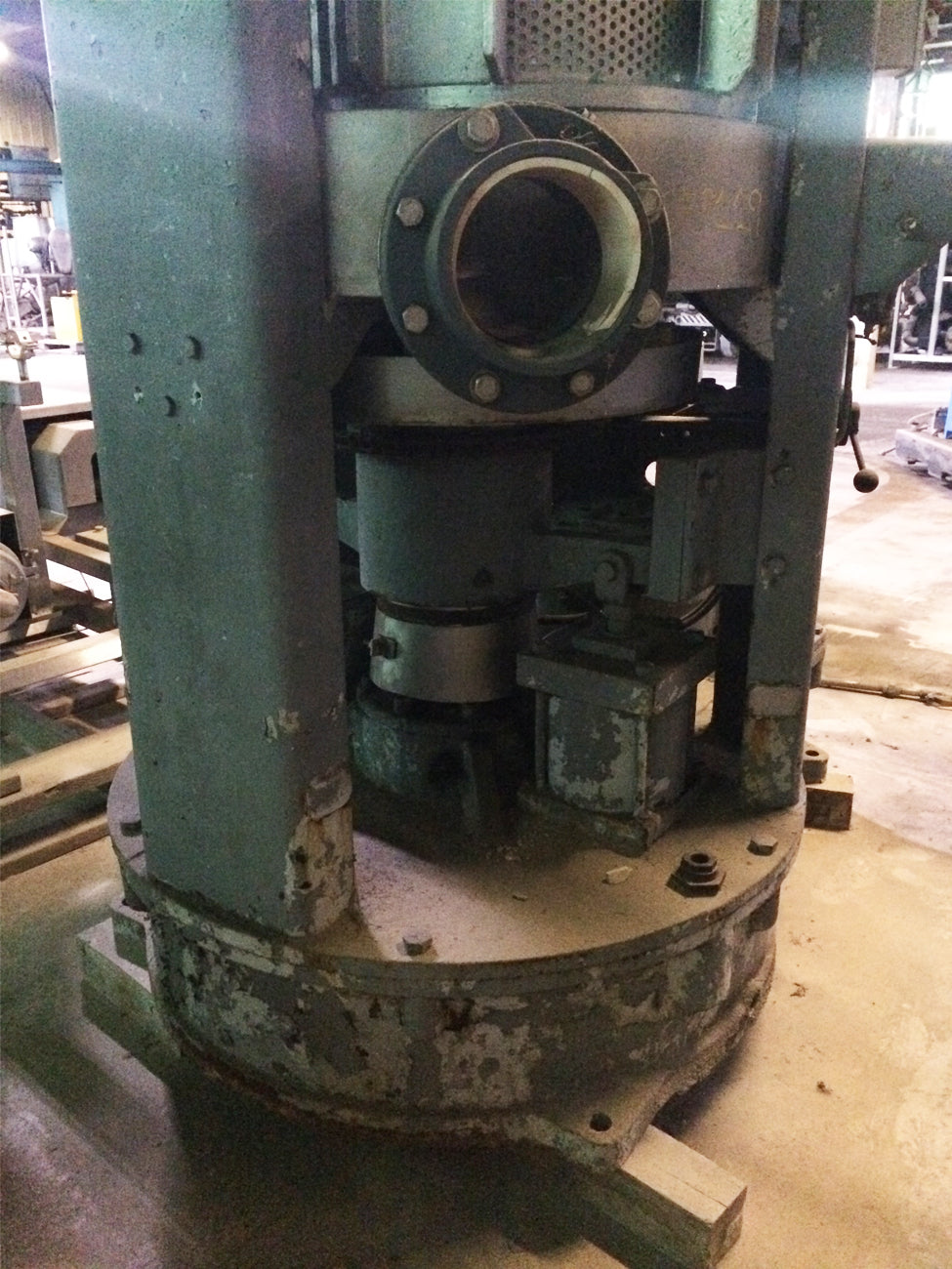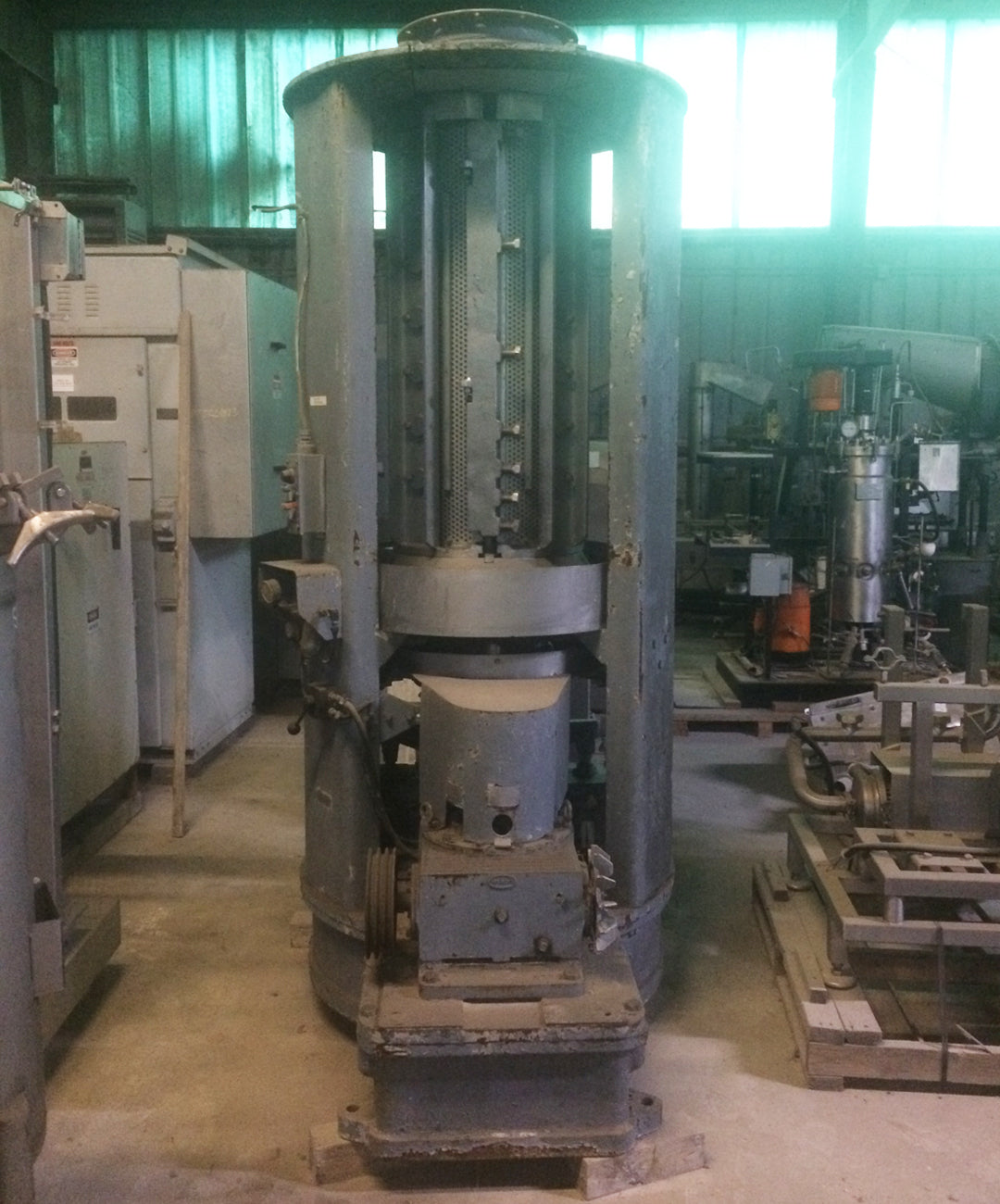 Prensa de jugo vertical Jones Beloit Pressmaster. Modelo 2510. N/S P-141. Con una construcción de acero inoxidable 304, esta prensa tiene (1) 16 pulgadas de diámetro. Entrada superior con un diámetro de 20 pulgadas. brida y (12) orificios de fijación para introducción de producto crudo. Prensa de producto de 21 pulg. de diámetro. x 47-1/2 pulg. H. 15-3/4 pulg. de diámetro. cuchillas para rebanar. La prensa consta de un diámetro de 15 pulgadas. criba interior con orificios pasantes de 1/4 pulg. y una criba exterior con un diámetro de 16 pulg. Canal de acumulación de jugo: 33 pulg. de diámetro. x 6 pulgadas de alto. El jugo sale a través de un diámetro de 6-1/2 pulgadas. Salida de PVC. La pulpa se acumula en un canal y se empuja hacia afuera por una salida de 12 pulgadas de ancho x 3 pulgadas de alto mediante paletas de 6 pulgadas de ancho x 4 pulgadas de alto. (2) Los actuadores Miller Power Fluid mueven el husillo verticalmente. Motor Delroyd, reconstruido en 1995 y reacondicionado en diciembre de 2000; impulsa un diámetro de 9-3/4 pulg. Polea de 3 correas. Construido como 100 y convertido a 125, construido para motor de 7,5 hp con husillo de 100 s. Clasificado de 1 a 12 rpm dependiendo del producto. Welches obtiene 20 toneladas por hora de uva Concord con prensa auxiliar a 7 rpm. La piña se pela a 5 rpm y de 10 a 12 toneladas por hora con un 35 % de humedad eliminada, lo que le da un 65 % de materia seca. Dimensiones totales: 61 pulgadas de largo x 44 pulgadas de ancho x 98 pulgadas de alto