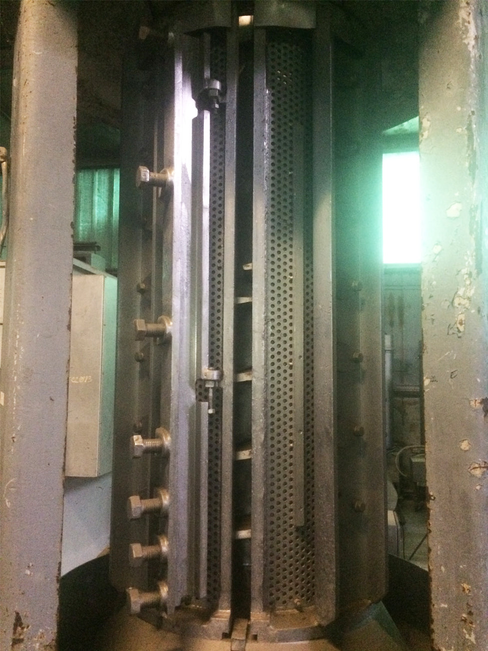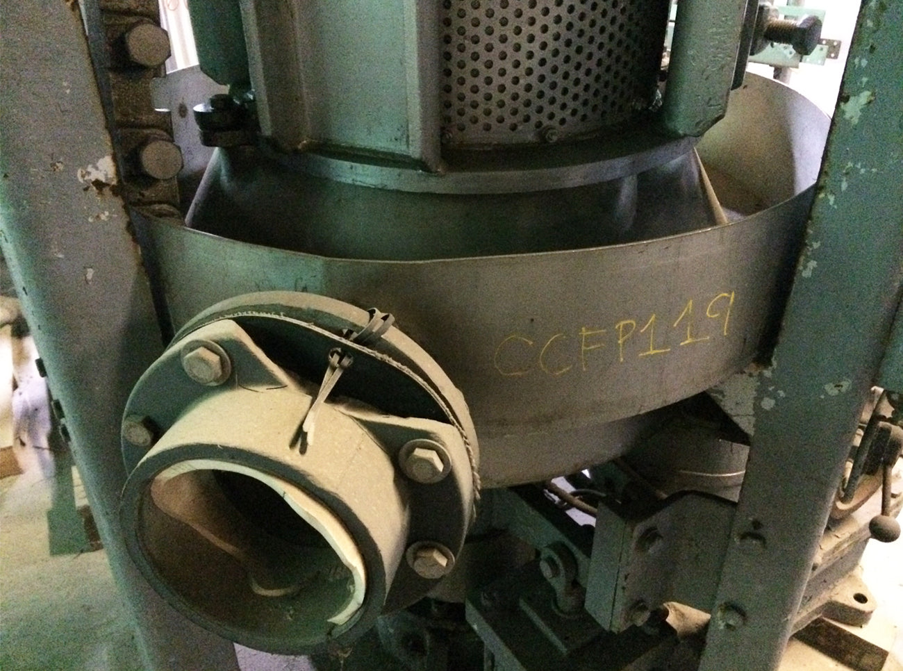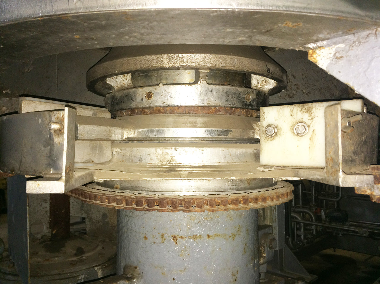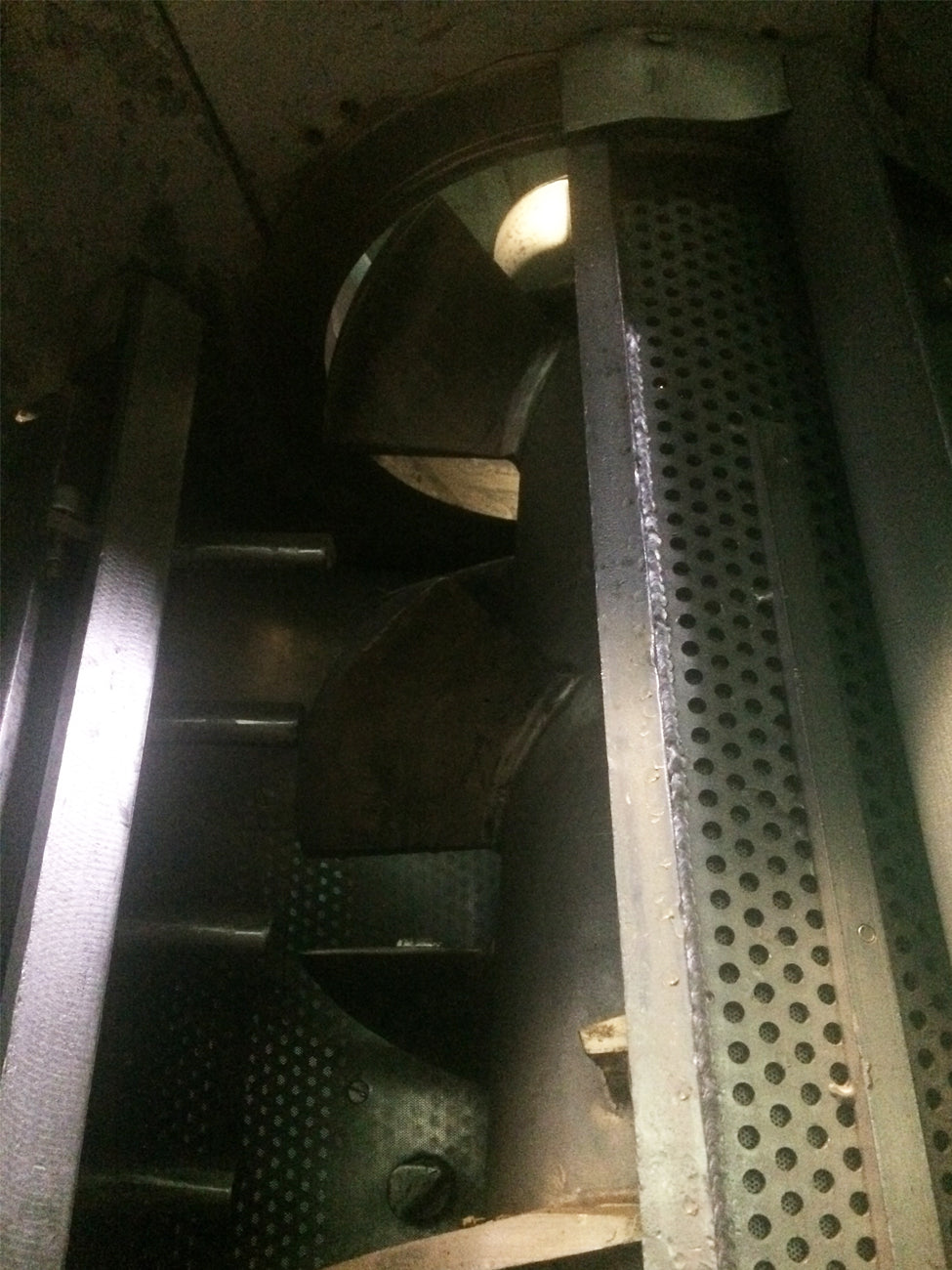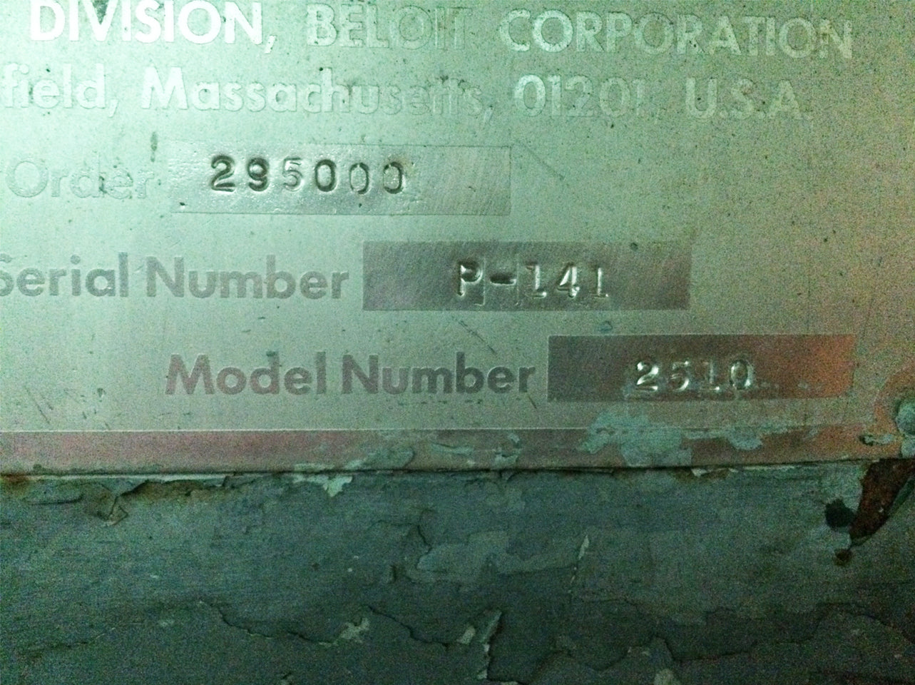 Prensa de jugo vertical Jones Beloit Pressmaster. Modelo 2510. N/S P-141. Con una construcción de acero inoxidable 304, esta prensa tiene (1) 16 pulgadas de diámetro. Entrada superior con un diámetro de 20 pulgadas. brida y (12) orificios de fijación para introducción de producto crudo. Prensa de producto de 21 pulg. de diámetro. x 47-1/2 pulg. H. 15-3/4 pulg. de diámetro. cuchillas para rebanar. La prensa consta de un diámetro de 15 pulgadas. criba interior con orificios pasantes de 1/4 pulg. y una criba exterior con un diámetro de 16 pulg. Canal de acumulación de jugo: 33 pulg. de diámetro. x 6 pulgadas de alto. El jugo sale a través de un diámetro de 6-1/2 pulgadas. Salida de PVC. La pulpa se acumula en un canal y se empuja hacia afuera por una salida de 12 pulgadas de ancho x 3 pulgadas de alto mediante paletas de 6 pulgadas de ancho x 4 pulgadas de alto. (2) Los actuadores Miller Power Fluid mueven el husillo verticalmente. Motor Delroyd, reconstruido en 1995 y reacondicionado en diciembre de 2000; impulsa un diámetro de 9-3/4 pulg. Polea de 3 correas. Construido como 100 y convertido a 125, construido para motor de 7,5 hp con husillo de 100 s. Clasificado de 1 a 12 rpm dependiendo del producto. Welches obtiene 20 toneladas por hora de uva Concord con prensa auxiliar a 7 rpm. La piña se pela a 5 rpm y de 10 a 12 toneladas por hora con un 35 % de humedad eliminada, lo que le da un 65 % de materia seca. Dimensiones totales: 61 pulgadas de largo x 44 pulgadas de ancho x 98 pulgadas de alto