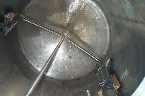 Procesador Cherry Burrell de 3000 galones, parte superior tipo domo, modelo PAEPCA, pared de presión de fondo cónico. Agitador de barrido ancho y lateral con palas raspadoras y deflector. Sprayball de 4 pulg., salida de abrazadera para uso con válvula de caldera operada por aire de 4 pulg.