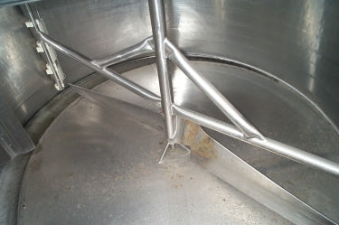 Procesador Mueller de acero inoxidable, 600 galones. Modelo PCP. N/S F-8572-2. Muro de presión, puente central con cubiertas superiores elevables. Agitador de barrido ancho y lateral con cuchillas raspadoras laterales y deflector. Válvula inoxidable de 2 pulg. Superficie de contacto con el producto tipo 316SS. Puede usarse como pasteurizador para procesamiento en tina o por lotes. Incluye motor y variador.