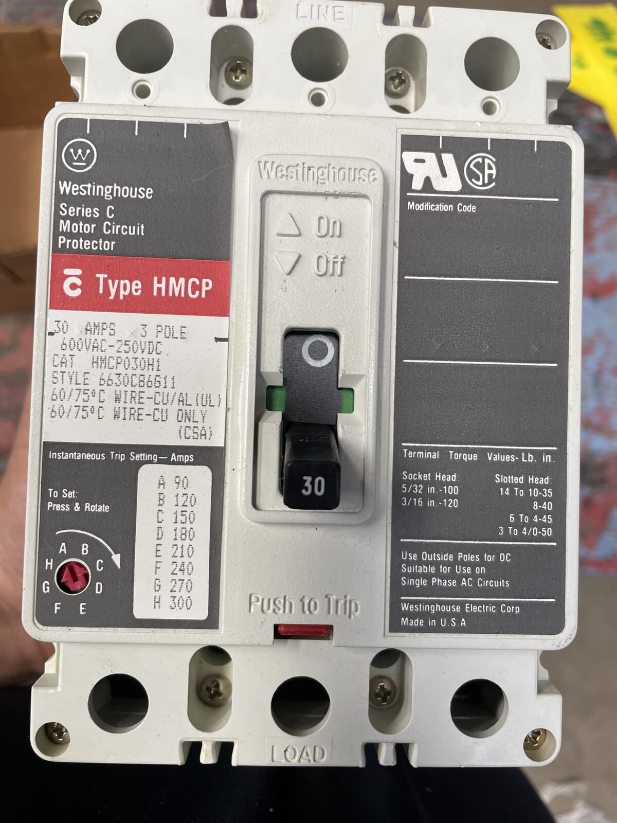 Protector de circuito de motor Westinghouse Serie C sin usar. Modelo: HMCP030H1. Estilo: 663C86G11. Voltaje Máximo: 600VAC-250VDC. Amperios de ajuste de disparo: 90 a 300 A. Motor FLA: 6,9-25,2. Amperios continuos: 30A. Tamaño de arranque: NEMA 1.
