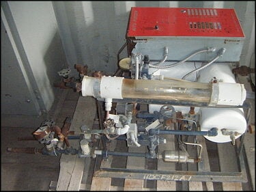 Purgador automático Hansen. Modelo: AP16. Fuente de alimentación: 120 V, 3,0 amperios, 60 Hz. SWP: 400 psig. Entradas: (1) 1/2 pulg. de diámetro. línea de agua, (1) 1/2 pulg. de diámetro. línea de líquido de alta presión, (1) línea de gas sucio de 1/2 pulg. desde condensadores y receptores de alta presión. Salidas: (1) 1 pulg. de diámetro. drenaje de agua, (1) 3/4 pulg. de diámetro. línea de succión al sistema. Dimensiones totales: 2 pies 2 pulgadas de largo x 1 pie 10 pulgadas de ancho x 4 pies de alto (H11).