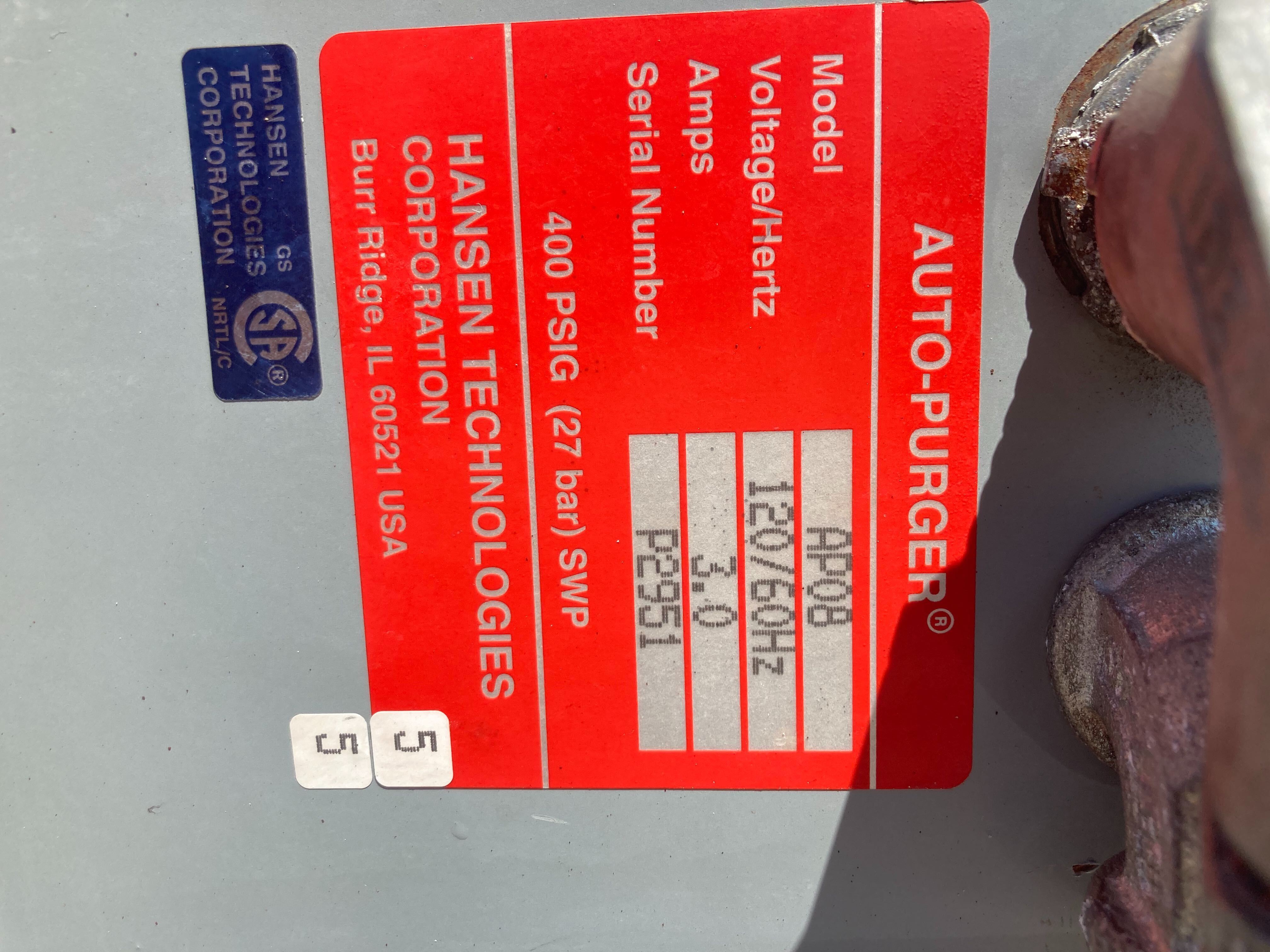 Purgador automático AP08 de Hansen Technologies. Modelo: AP08. Número de puntos de purga: 8. Refrigerante: R-717 (amoniaco). Fuente de alimentación: 120V/60Hz. 3,0 amperios. Cámara del evaporador. Receptor: 1,5 galones, dimensiones de pared recta: 5 pulgadas de diámetro. x 1 pie 8 pulg. L. Panel de control Hoffman. El Auto-Purger cuenta con arranque automático con controles electrónicos, burbujeador de agua automático, válvula de alivio y válvula de servicio de aislamiento. Esta unidad elimina rápida y eficientemente el aire de un sistema de refrigeración, lo que reduce los costos de energía de operar un sistema de refrigeración de amoníaco. Incluye. Dimensiones totales: 4 pies 7 pulgadas de largo x 3 pies 1 pulgada de ancho x 1 pie 5 pulgadas de alto (ACN185).
