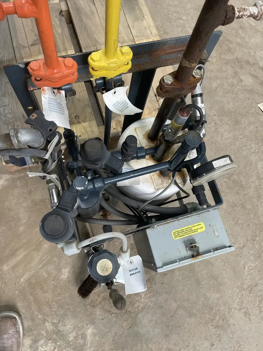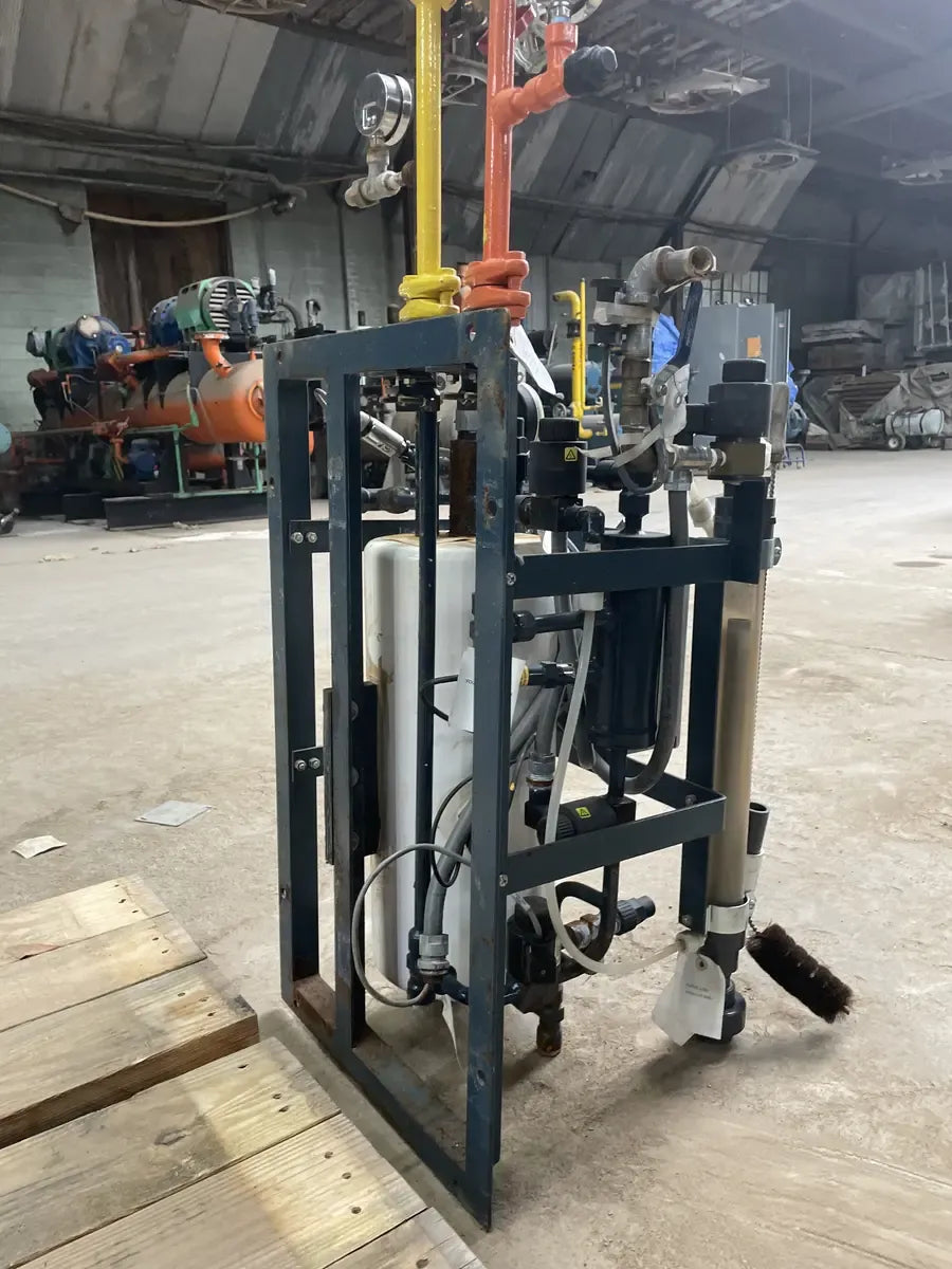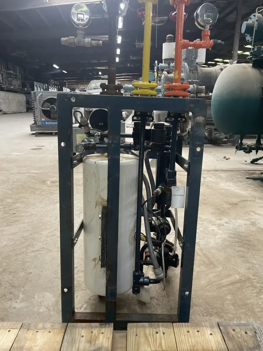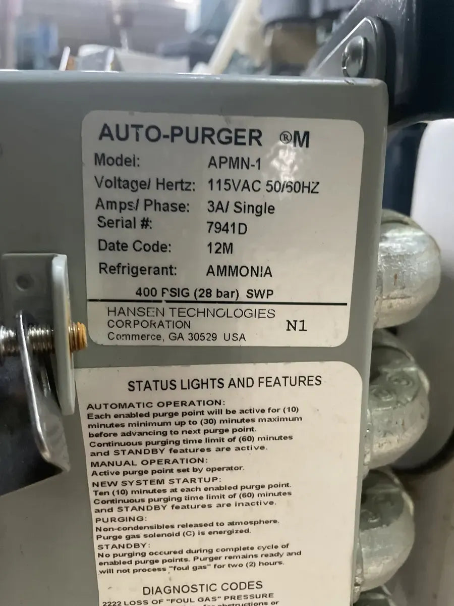 Purgador de refrigerante de gas (aire) no condensable Auto-Purger M. Modelo: APMN-1. Voltaje/Hercios: 115 VCA/60 HZ. Amperios/Fase: 3A/Simple. Número de serie: 7941D. Código de fecha: 12M. Refrigerante: Amoníaco. Presión máxima: 400 PSIG. Conexión de línea de succión (pulg.): 3/4. Conexión de línea de líquido de alta presión (pulg.): 1/2. Conexión de línea desde puntos de purga en condensadores y receptores de alta presión (pulg): 1/2. Puntos de Purga: 4. El APM cuenta con arranque automático con control electrónico. El APM incluye un burbujeador de agua automático y viene de serie con un gabinete de control NEMA 12, 13.