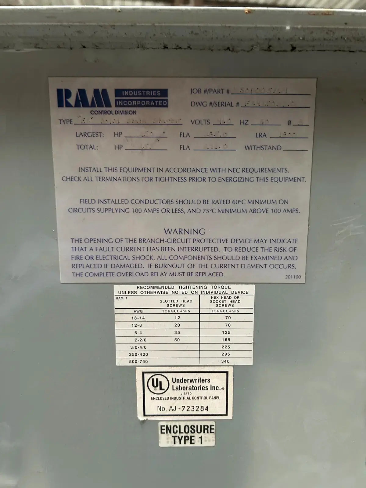 Arrancador de motor para compresor de tornillo Ram Industries (250 HP, 460 voltios, 60 Hz)