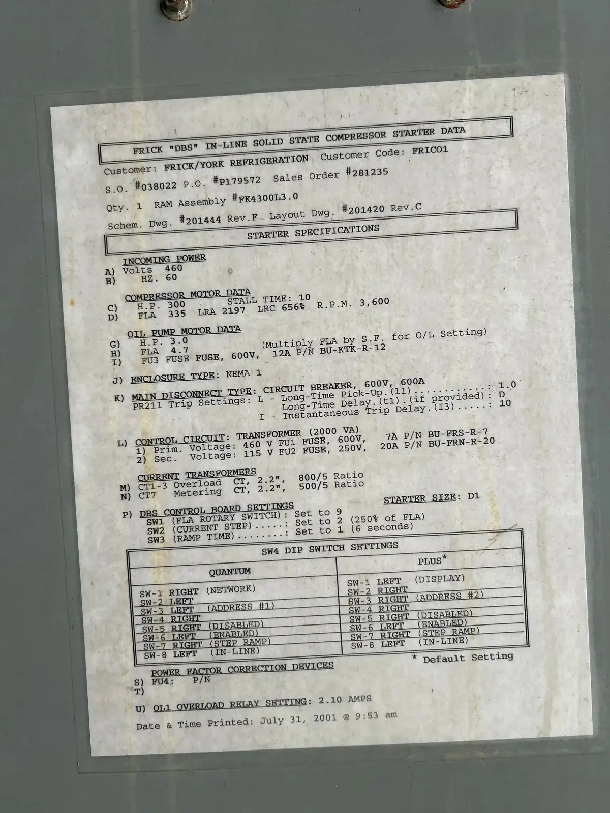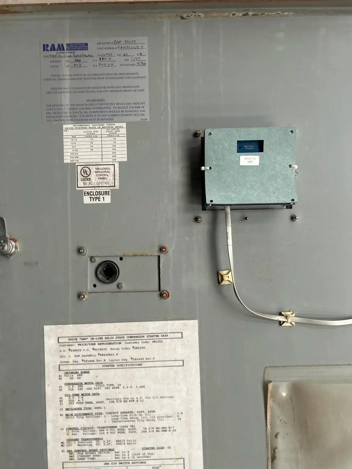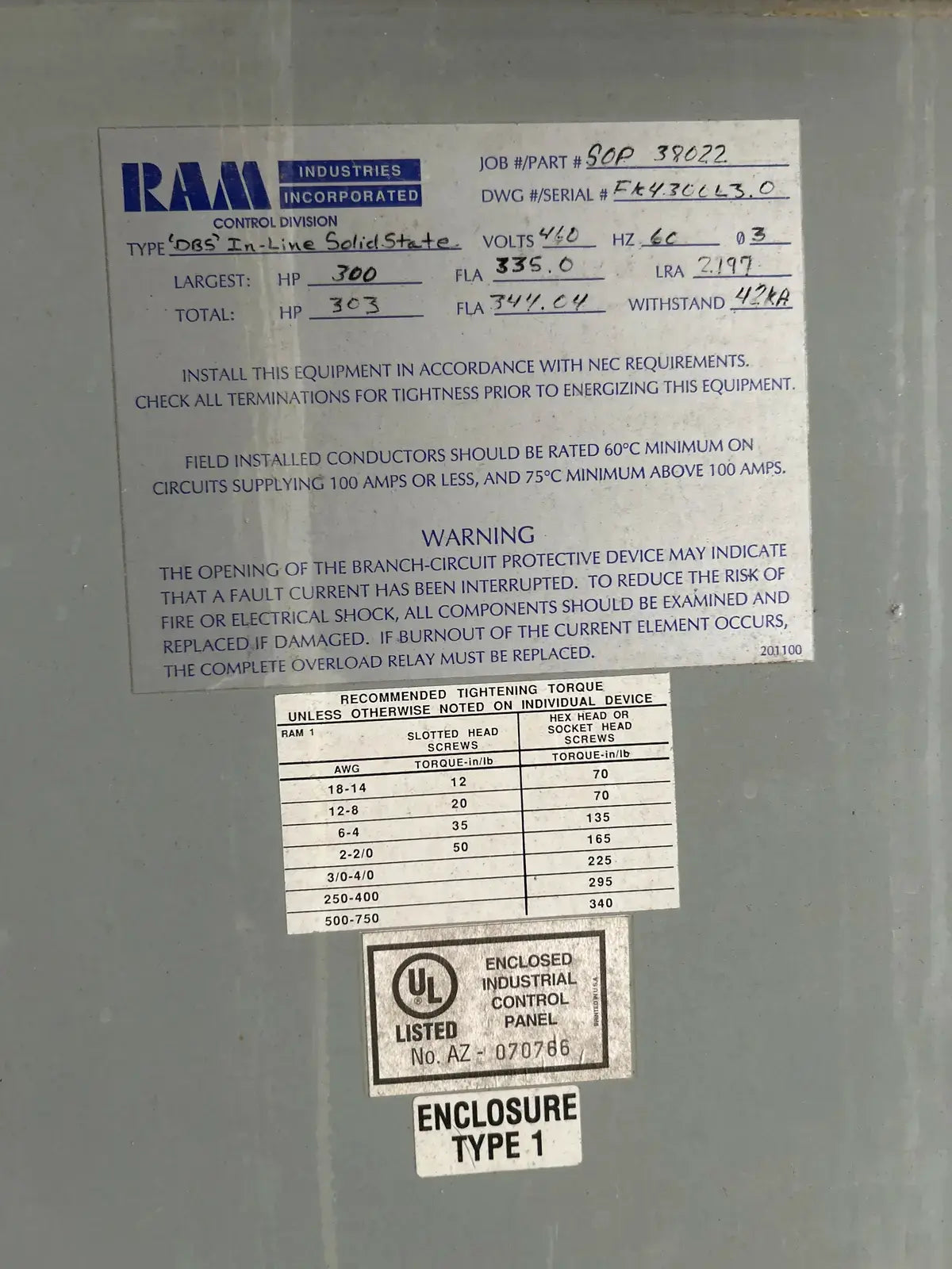 Arrancador de motor de compresor de tornillo de Ram Industries. Tipo: Arrancador de estado sólido en línea DBS. Número de trabajo/pieza: SOP-38022. Número de serie/DWG: FK4300L3.0. Potencia máxima: 300. Voltios: 460, Hz: 60, Fase 3. FLA: 335,0. LRA: 219,7. Total: HP: 303, FLA: 344,04, Resistencia: 42KA.