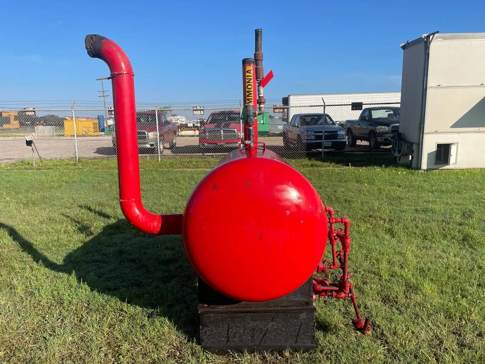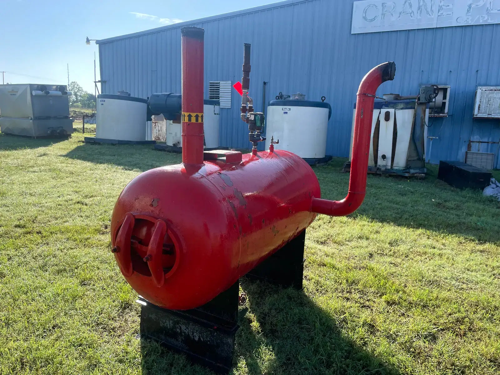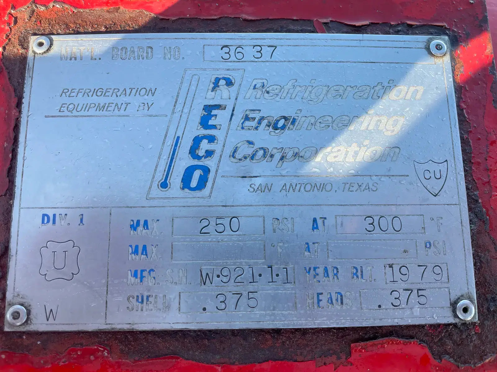 Receptor de amoniaco horizontal RECO. Junta Nacional: 3637. Número de serie: W92111. Año de construcción: 1979. MAWP: 250 PSI a 300 F. Carcasa: .375. Cabezas: .375. Dimensiones totales del recipiente: 30 de diámetro x 60 litros. Capacidad estimada: 250 galones.