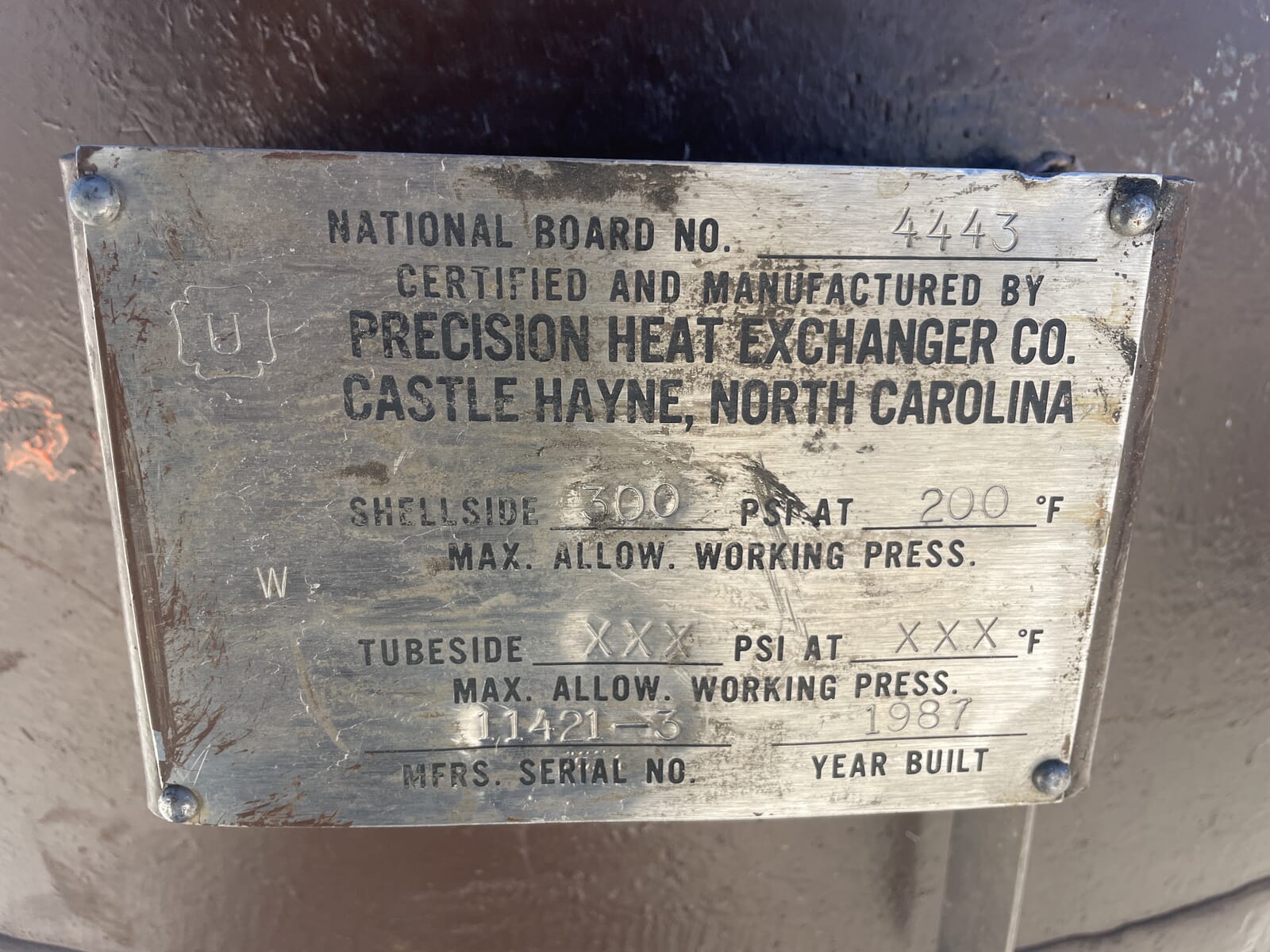 Receptor vertical del intercambiador de calor de precisión. Junta Nacional No: 4443. No de Serie: 11421-3. Año de construcción: 1987. Presión de trabajo máxima permitida: 300 PSI a 200 F. Dimensiones generales de envío: 63 largo x 63 ancho x 173 alto. Dimensiones estimadas del recipiente: 45 diámetro x 115 L. Capacidad estimada: 998 galones.