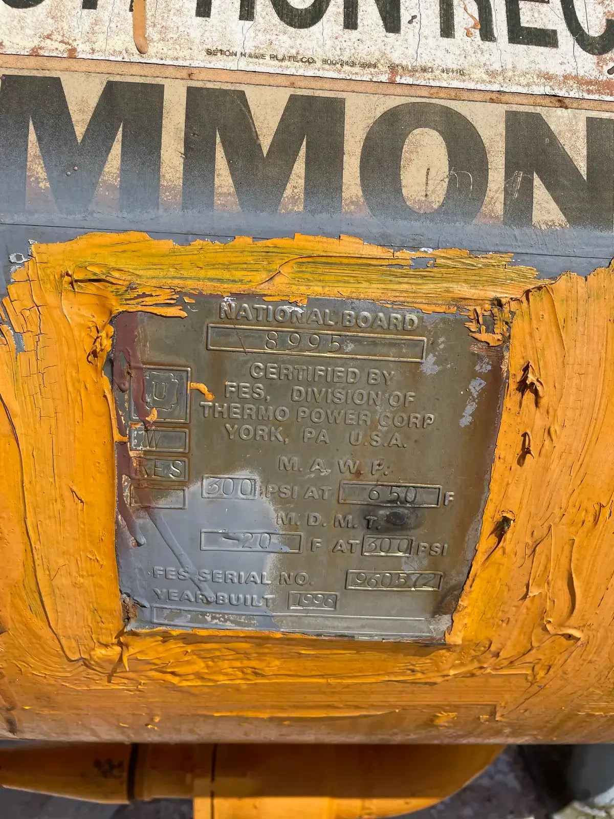 Receptor Termosifón Horizontal FES. Certificado por FES. Junta Nacional: 8995. MAWP: 300 PSI @ 650 F. MDMT: -20 F @ 300 PSI. Número de serie FES: 960572. Año de construcción: 1996.
