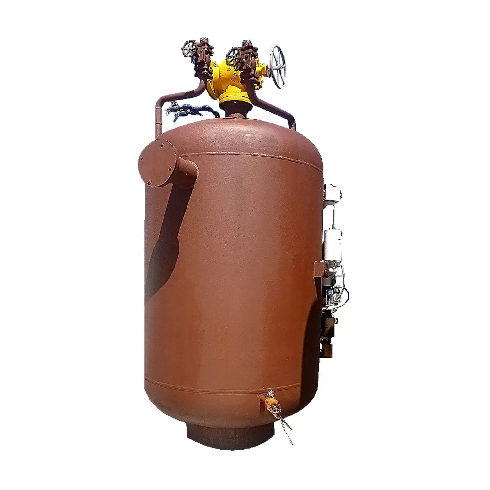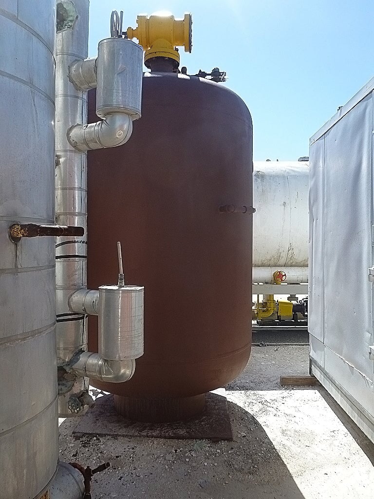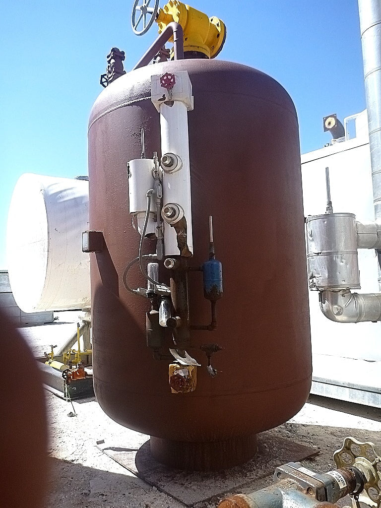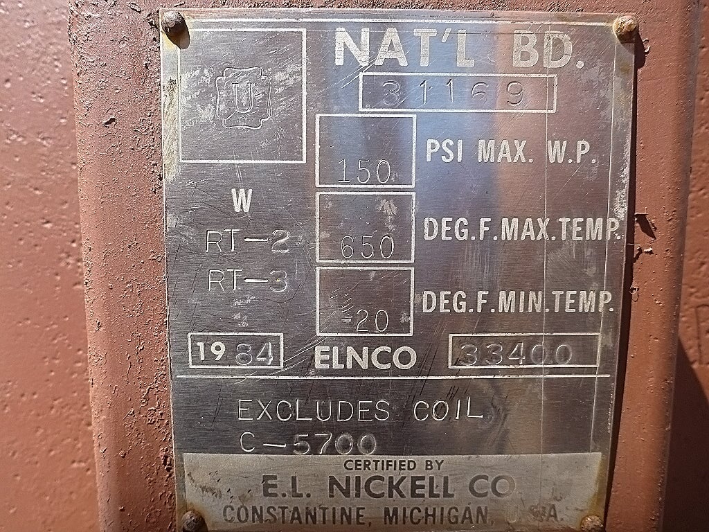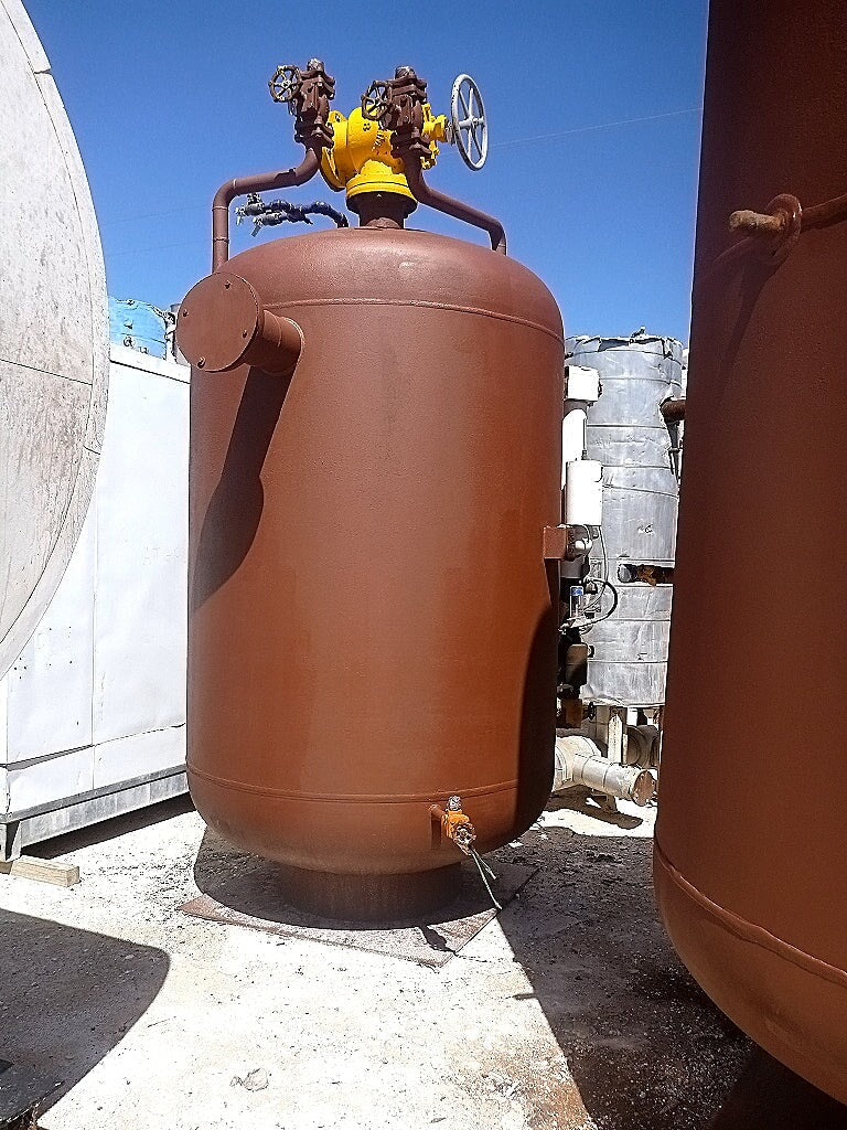 Receptor vertical de amoníaco EL Nickell. Nat. Bd. no: 33169. ELNCO: 33400. 150 Psi máx. WP 650ºF Máx. Temperatura. -20ºF mín. Temperatura. (2) Entrada/salida de 2-1/2 pulgadas con válvulas Henry Technologies. (1) Válvula de cierre Wolf Linde con brida de 8 pulg. (1) Entrada/salida lateral con brida de 8 pulg. (2) Entrada/salida de 1-1/2 pulg. (2) Juego de válvulas de alivio de seguridad de 150 psi. Dimensiones del tanque: 6 pies de diámetro. x 10 pies de alto de domo a domo. Longitud de la pared recta del tanque: 6 pies 8 pulgadas. Dimensiones totales: 7 pies 8 pulgadas de ancho x 6 pies de largo x 13 pies 4 pulgadas de alto.
