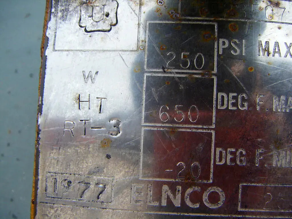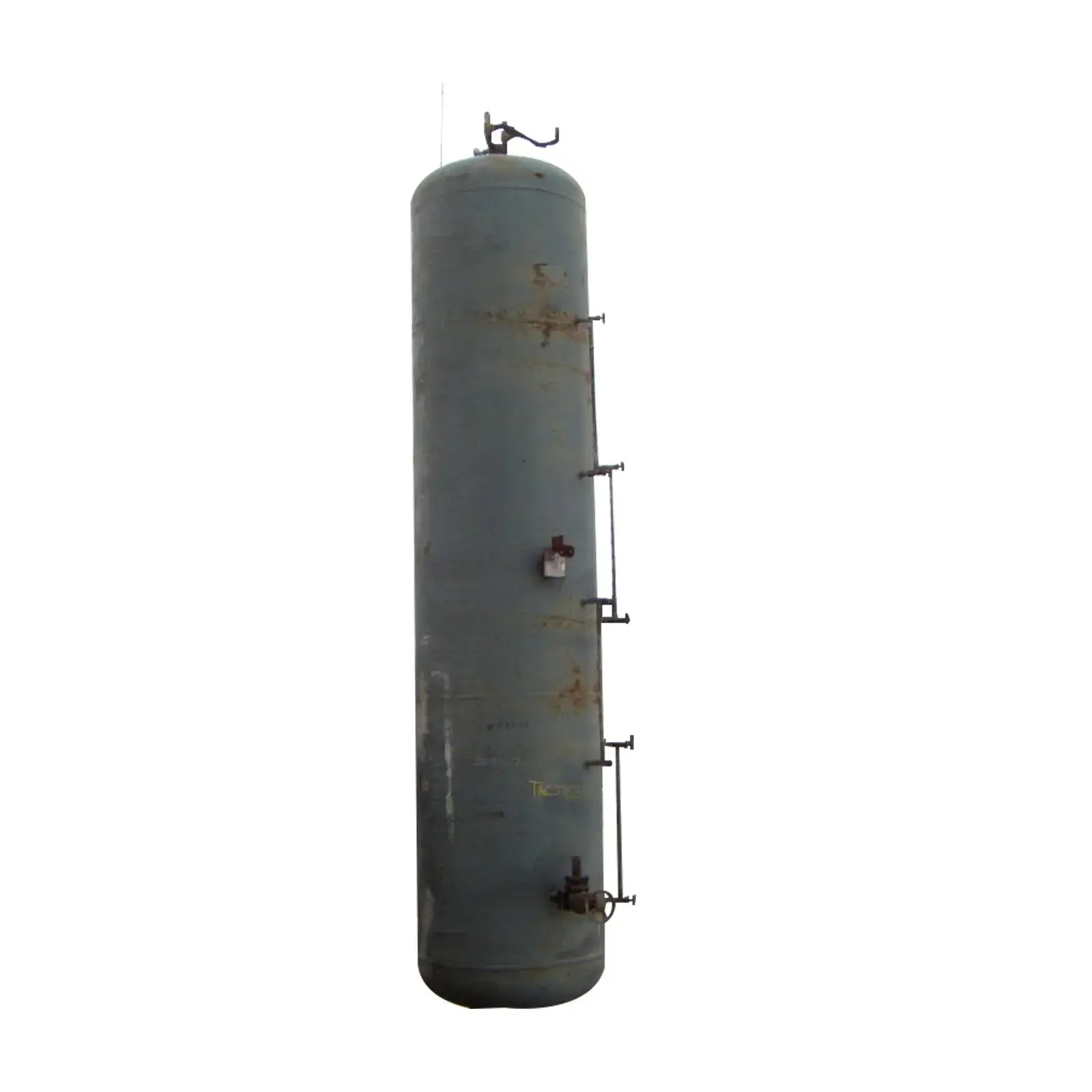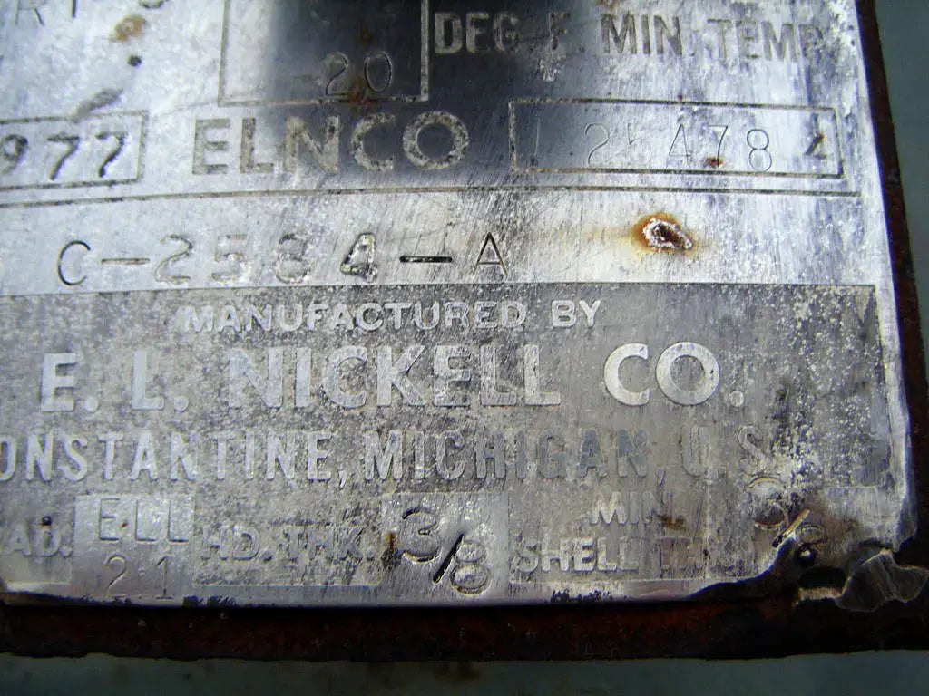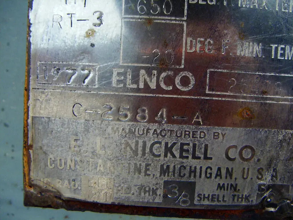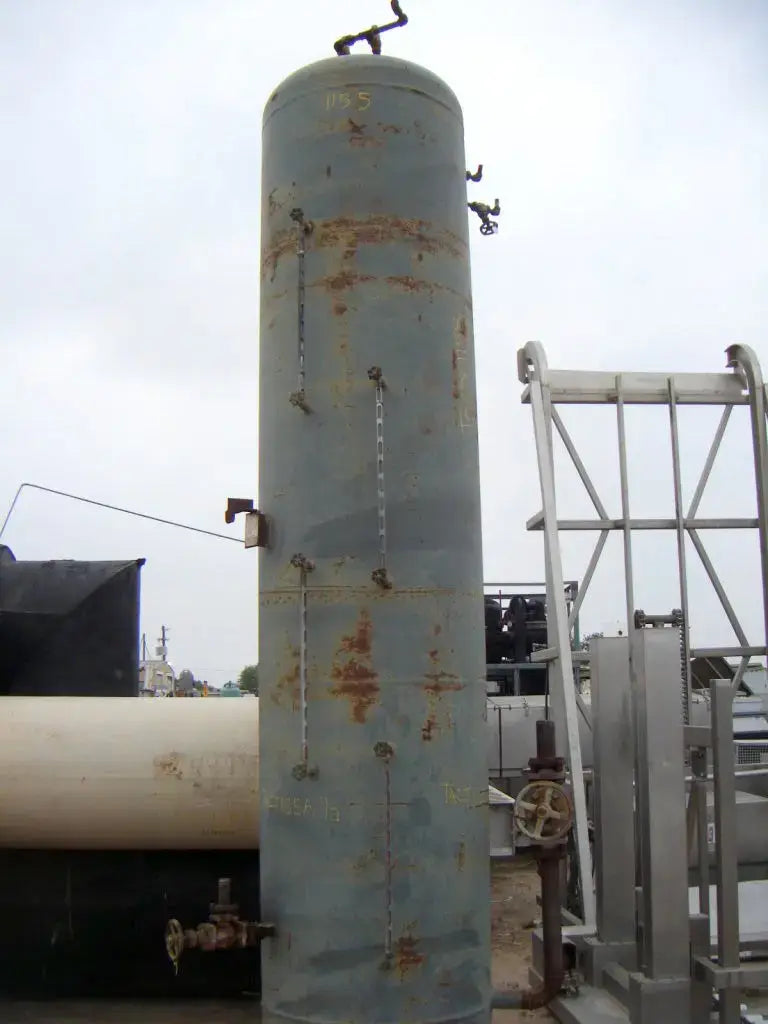 Receptor vertical EL Nickell Co. Modelo: C-2584-A. Capacidad aproximada: 745 galones. Longitud de la pared recta: 12 pies 2 pulgadas. Diámetro: 36 pulgadas. MAWP: 250 psi a 650 °F. MDMT: - 20°F a 250 psi. Grosor de la cabeza: 3/8 pulg. Grosor de la carcasa: 3/8 pulg. (4) tubos de nivel de mira. Entradas/salidas: (3) hembra NPT de ½ pulg., (1) válvula de 2-½ pulg., (1) macho NPT de 1 pulg. Dimensiones totales: 4 pies 11 pulgadas de largo x 3 pies 9 pulgadas de ancho x 16 pies de alto.