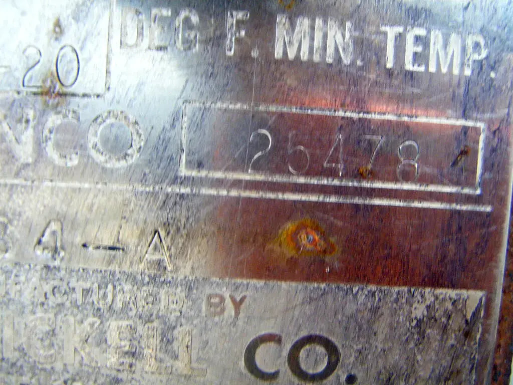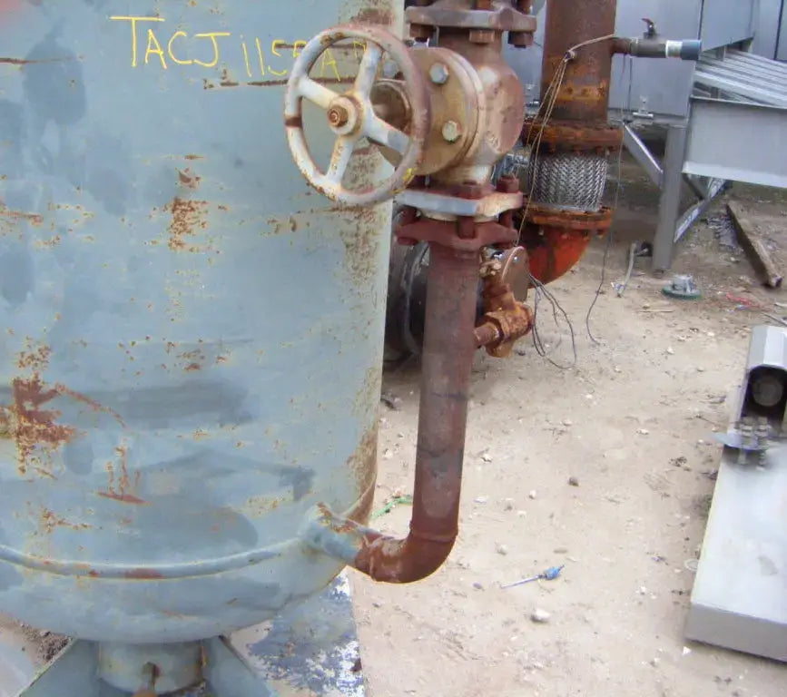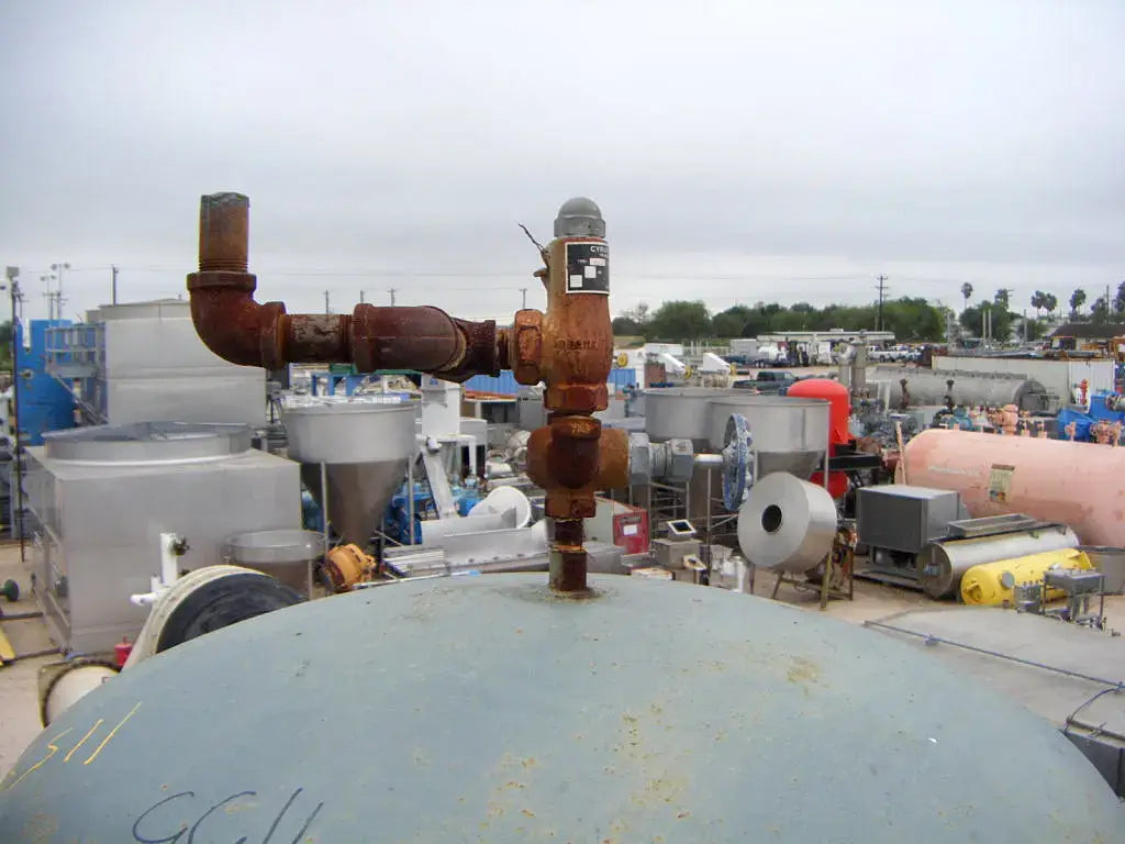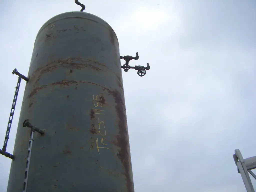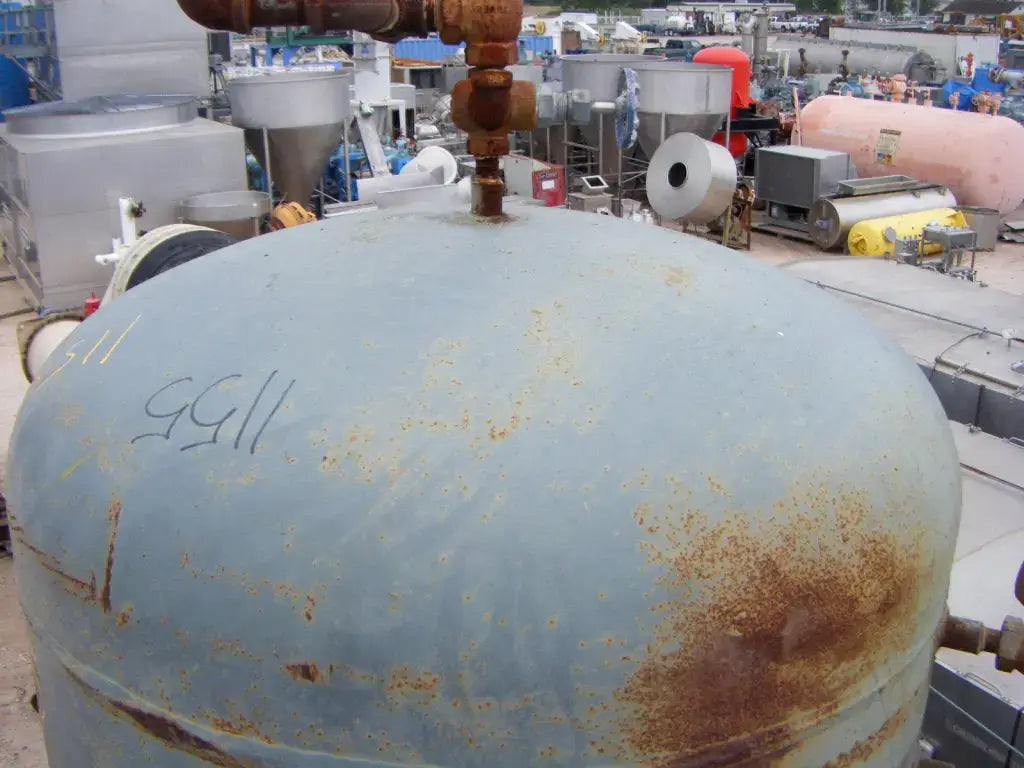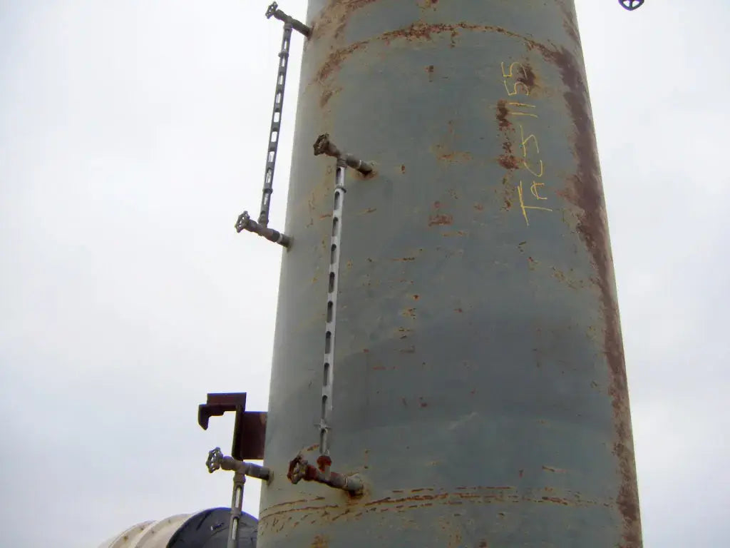 Receptor vertical EL Nickell Co. Modelo: C-2584-A. Capacidad aproximada: 745 galones. Longitud de la pared recta: 12 pies 2 pulgadas. Diámetro: 36 pulgadas. MAWP: 250 psi a 650 °F. MDMT: - 20°F a 250 psi. Grosor de la cabeza: 3/8 pulg. Grosor de la carcasa: 3/8 pulg. (4) tubos de nivel de mira. Entradas/salidas: (3) hembra NPT de ½ pulg., (1) válvula de 2-½ pulg., (1) macho NPT de 1 pulg. Dimensiones totales: 4 pies 11 pulgadas de largo x 3 pies 9 pulgadas de ancho x 16 pies de alto.