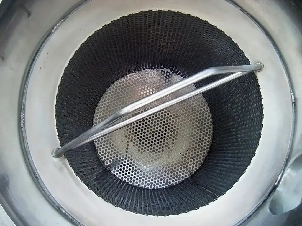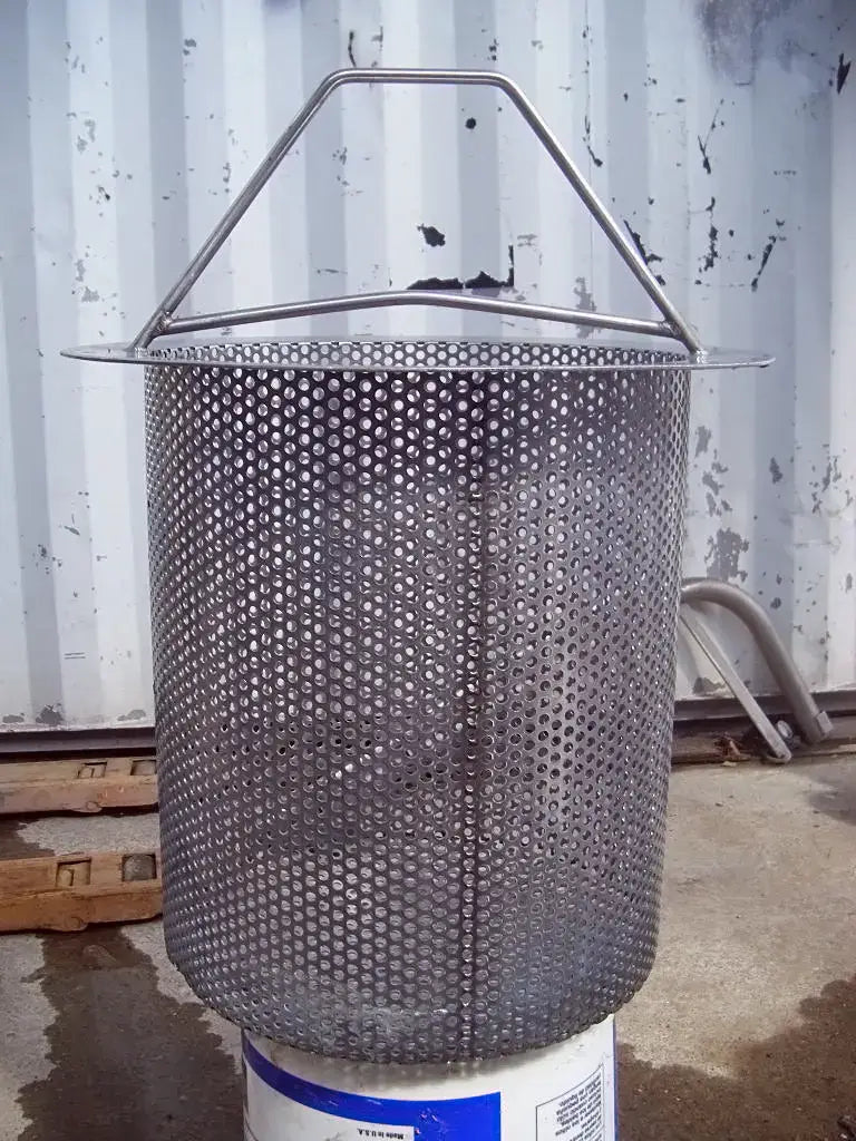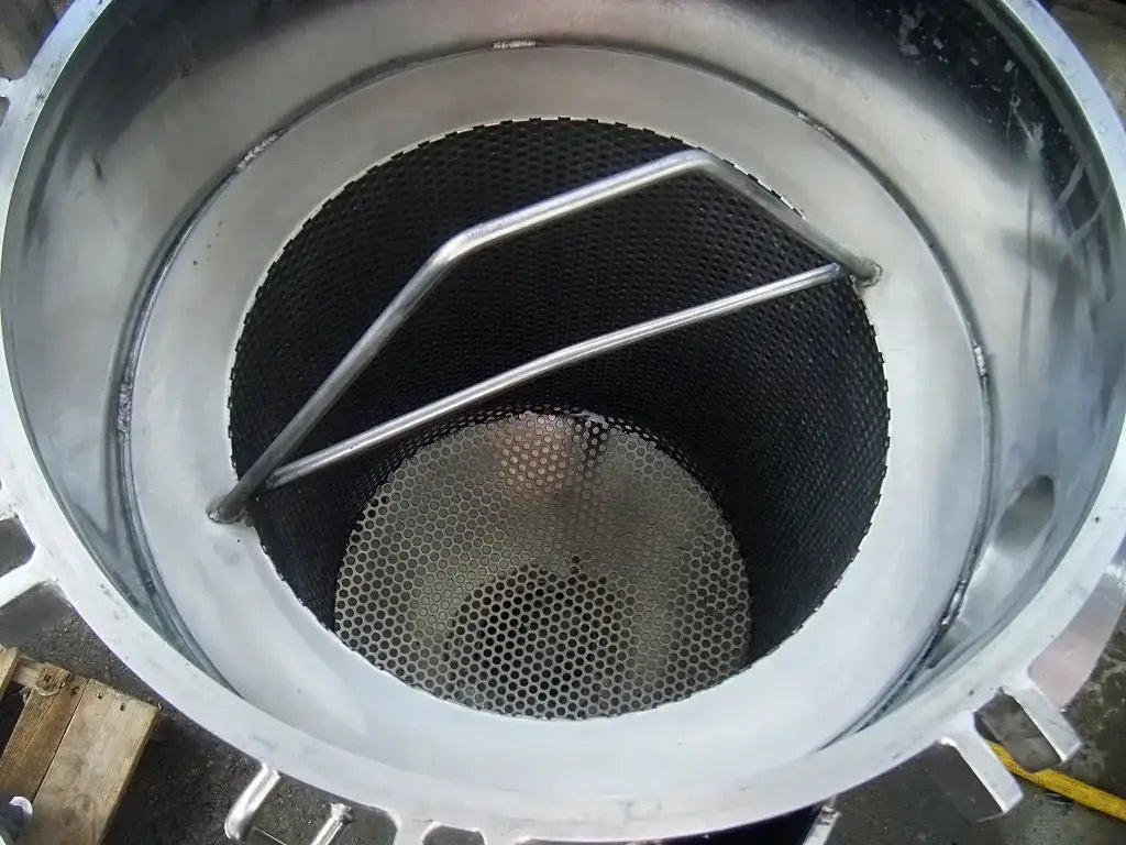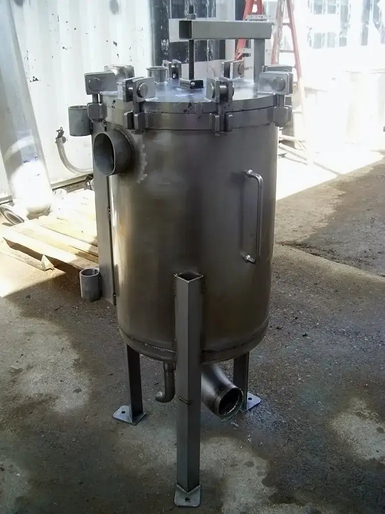 Recipiente a presión de acero inoxidable. Entradas/salidas: (2) puertos de 4 pulg. (1) Línea S de 2 pulgadas. (1) Puerto de 1-1/2 pulg. Dimensiones interiores del recipiente: 1 pie 6 pulgadas de diámetro. x 1 pie 11-1/8 pulg. pared recta. Dimensiones de la cesta perforada: 1 pie 1-3/8 pulg. de diámetro. x 1 pie 4 pulgadas de alto. Dimensiones totales: 2 pies 1 pulgadas de largo x 1 pie 10 pulgadas de ancho x 4 pies 6 pulgadas de alto.