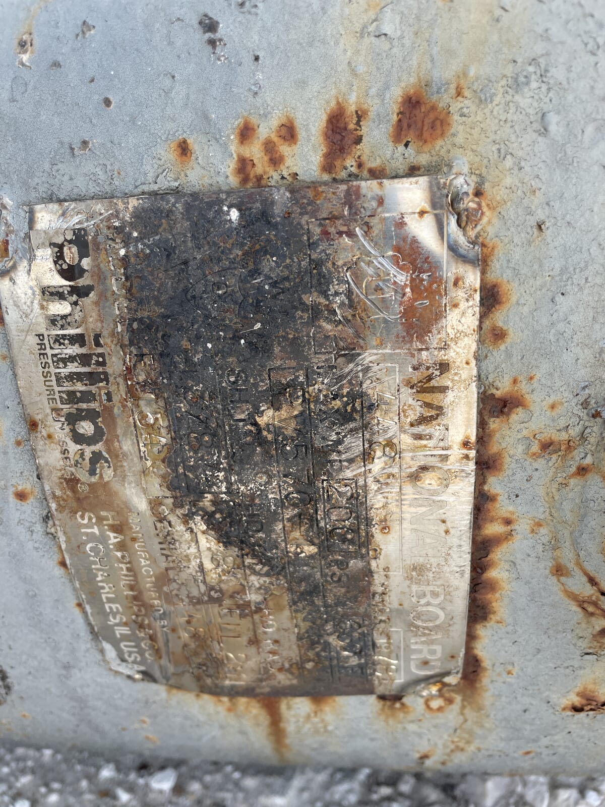 Recipiente a presión horizontal Phillips. Junta Nacional: 448. Número de serie: 448. Modelo: E1154. Presión máxima permitida: 200 PSI a 650 F. Año de construcción: 1979. Dimensiones totales del recipiente: 24 diámetro x 60 L. Capacidad total: 150 galones.