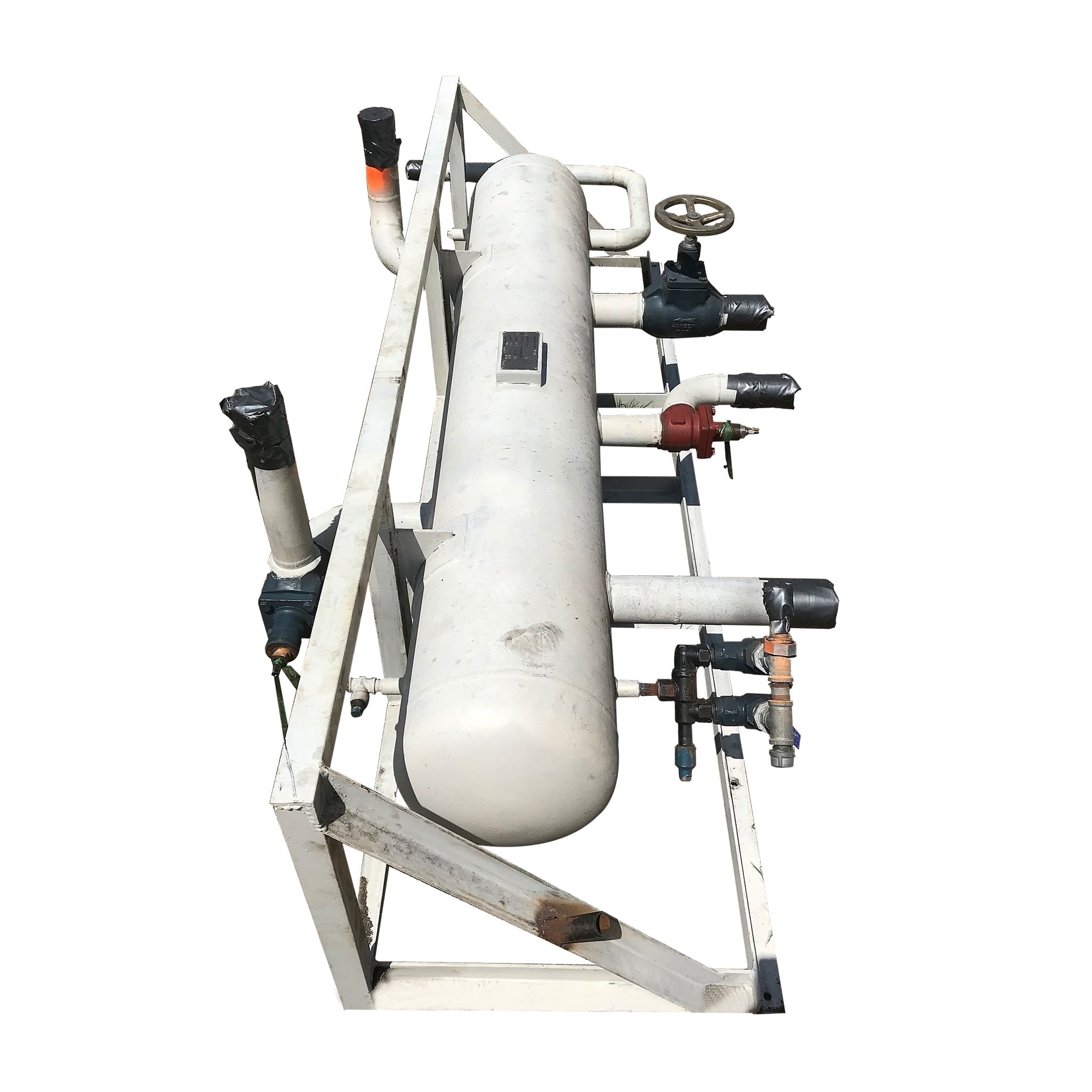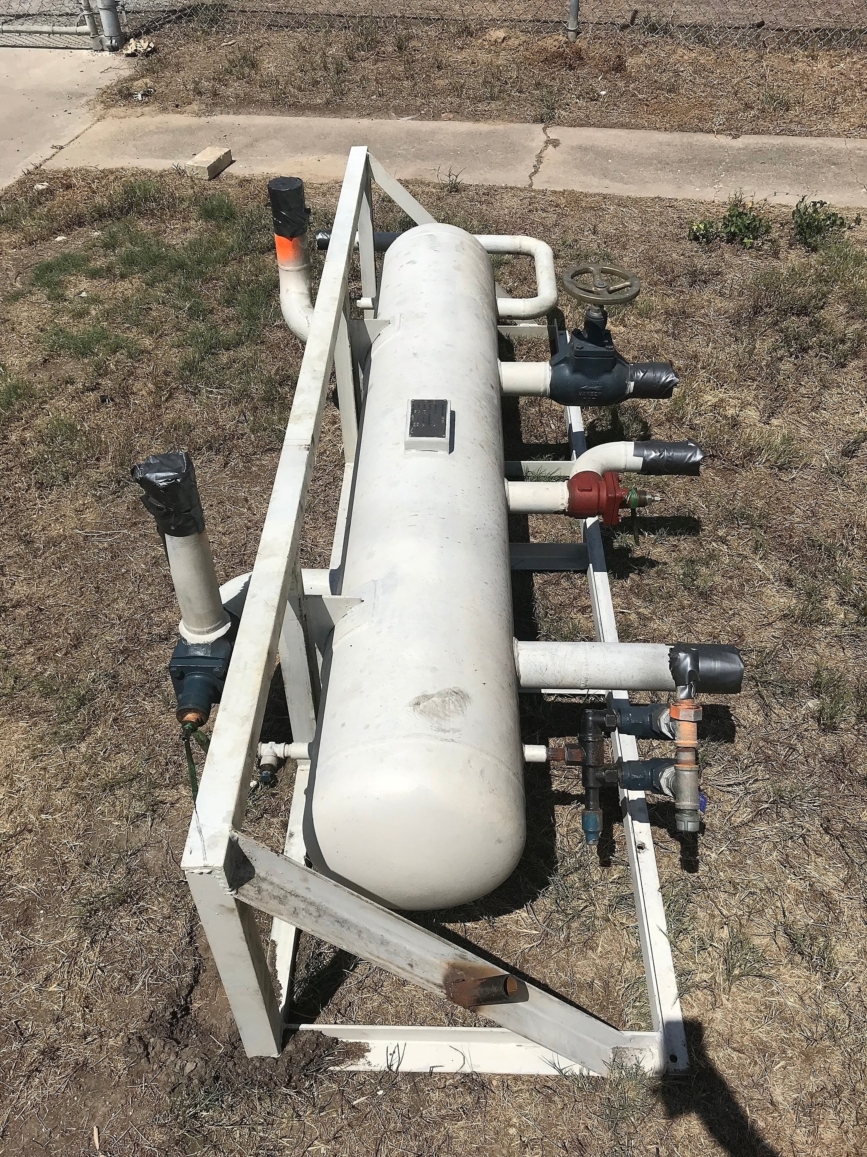 Recipiente refrigerante de amoniaco horizontal. Fabricado por fabricantes de costa. Serie: 1192. Año: 2001. MAWP: 196 PSI a 95F. MDMT: -20F a 196 PSI / -40F a 10,4 PSI. Nat'l Bd.: 1515. Dimensiones de las paredes laterales: 72 pulgadas de largo x 14 pulgadas de diámetro. Puertos (de izquierda a derecha, pulgadas): 3 superiores, 2, 2,5, 3, relieve 0,75, 3 inferiores, 2,5. Volumen aproximado: 50 galones.