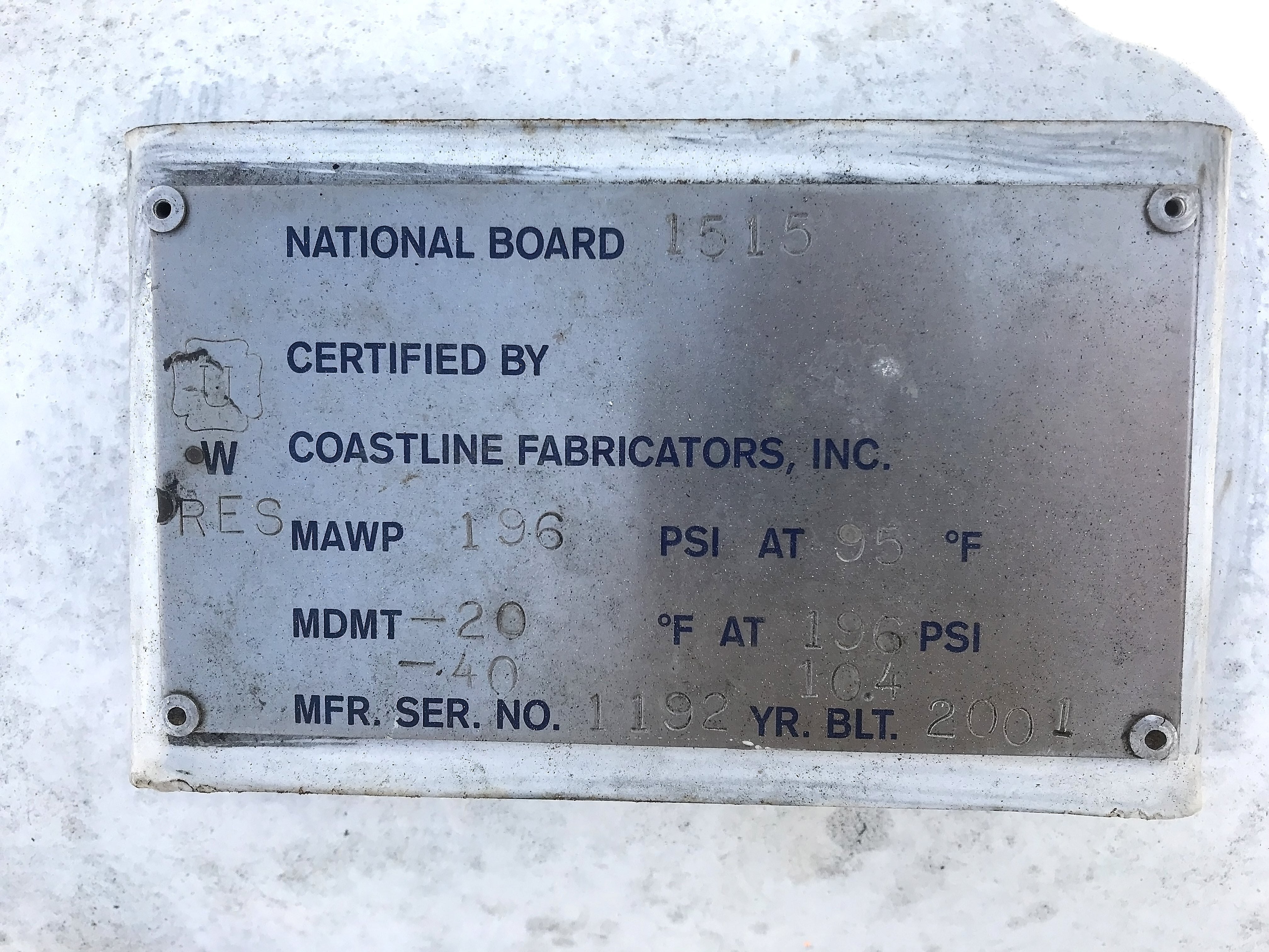 - Tanque MAWP (PSI a temperatura): 196 PSI at 95F