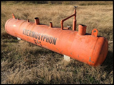 Recipiente termosifón de amoníaco. Certificado por EL NIckell Co., Inc. MAWP: 250 PSI a 650 F. MDMT: -20 °F a 250 PSI. Año: 1990. Serie: 40102. C-9060-A. Dimensiones de las paredes laterales: 105 pulgadas de largo x 23 pulgadas de profundidad. Volumen estimado: 200 galones. Longitud total: 120 pulgadas.