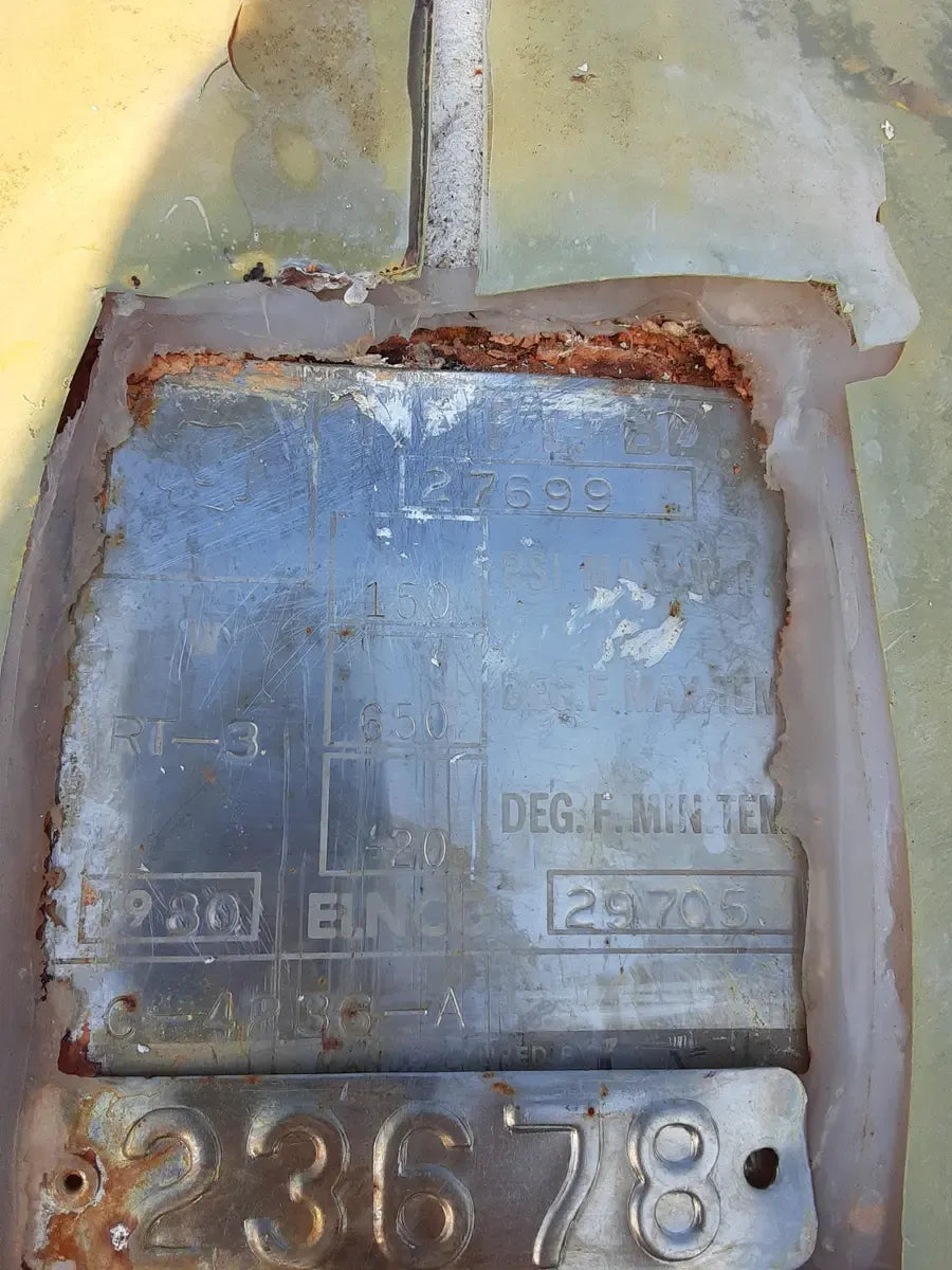 Número de serie del recirculador de amoníaco horizontal EL Nickell: 29705. Número de la Junta Nacional del tanque: 27699. MAWP del tanque (PSI a temperatura): 150 PSI a 650 F. MAWT del tanque (PSI a temperatura): -20 a 650 PSI. El refrigerante anterior era amoníaco (R717 | NH3). Fabricado en 1980.