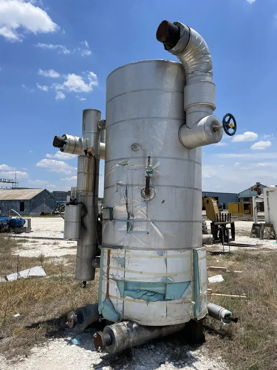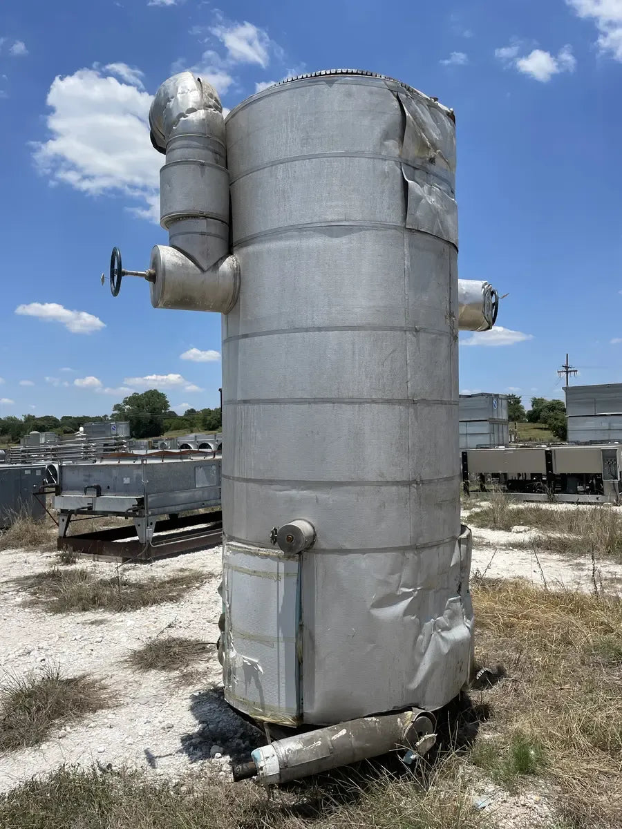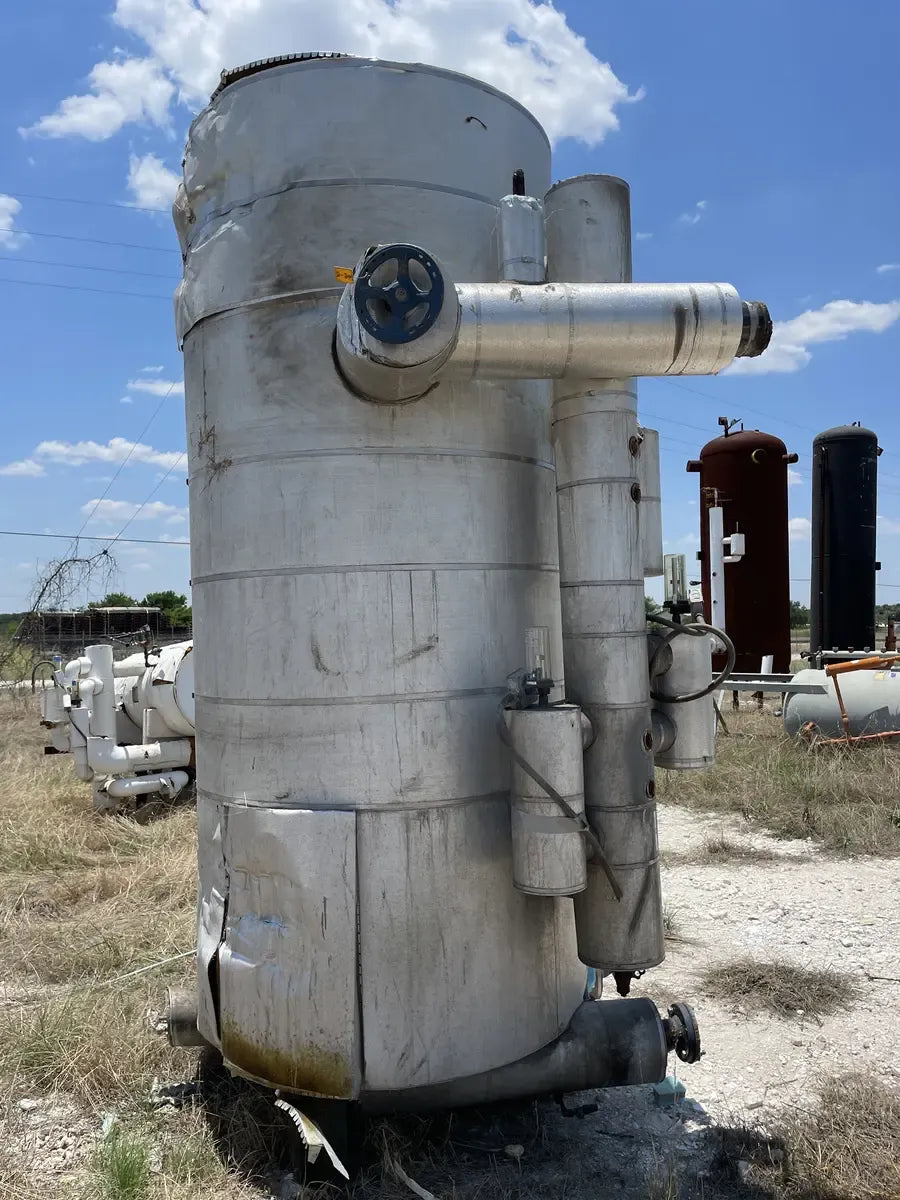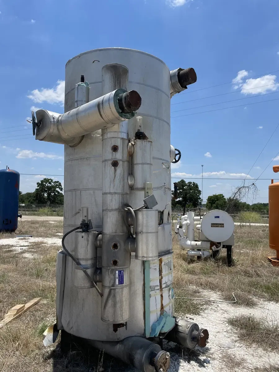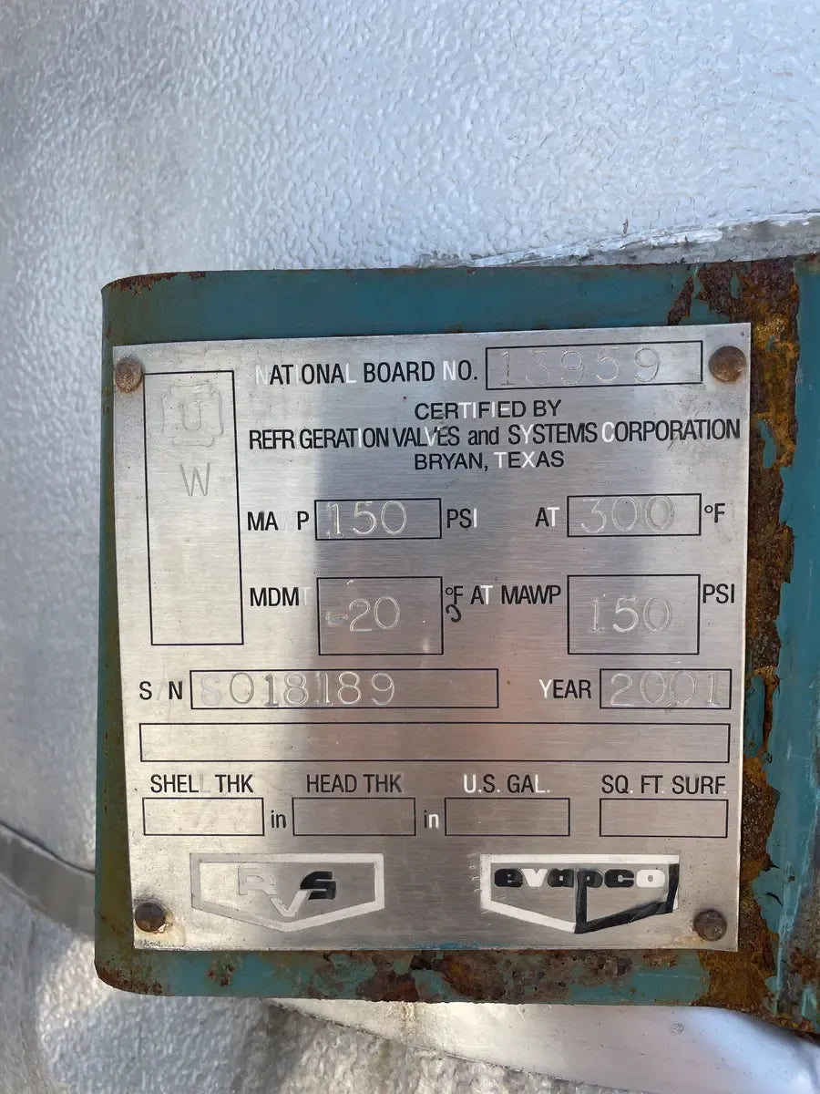 Recirculador de amoníaco vertical RVS (48 diámetro x 147 pulgadas). Estimado 1134 galones. (2) Bombas de 5 HP.) Número de serie: S018189. Número de la Junta Nacional del tanque: 13959. Capacidad estimada del tanque (galones): 1134. MAWP del tanque (PSI a temperatura): 150 PSI a 300 F. MAWT del tanque (PSI a temperatura): -20 F a 150 PSI. El refrigerante utilizado anteriormente fue amoniaco (R717 | NH3). Fabricado en 2002. Dimensiones de envío (pulgadas): 85 X 78 X 149. 1500 LB