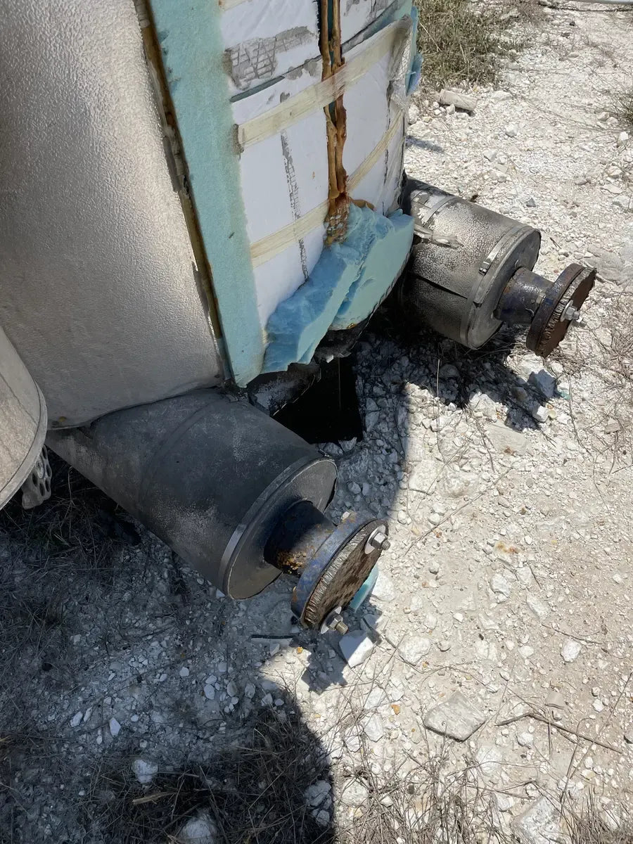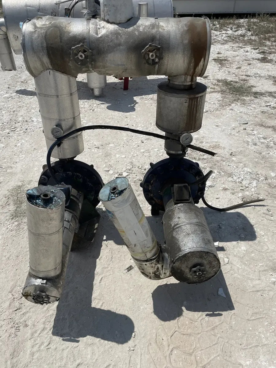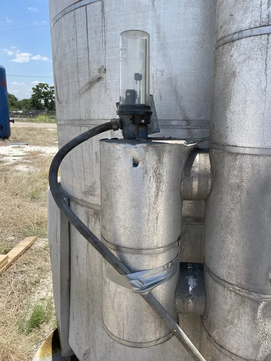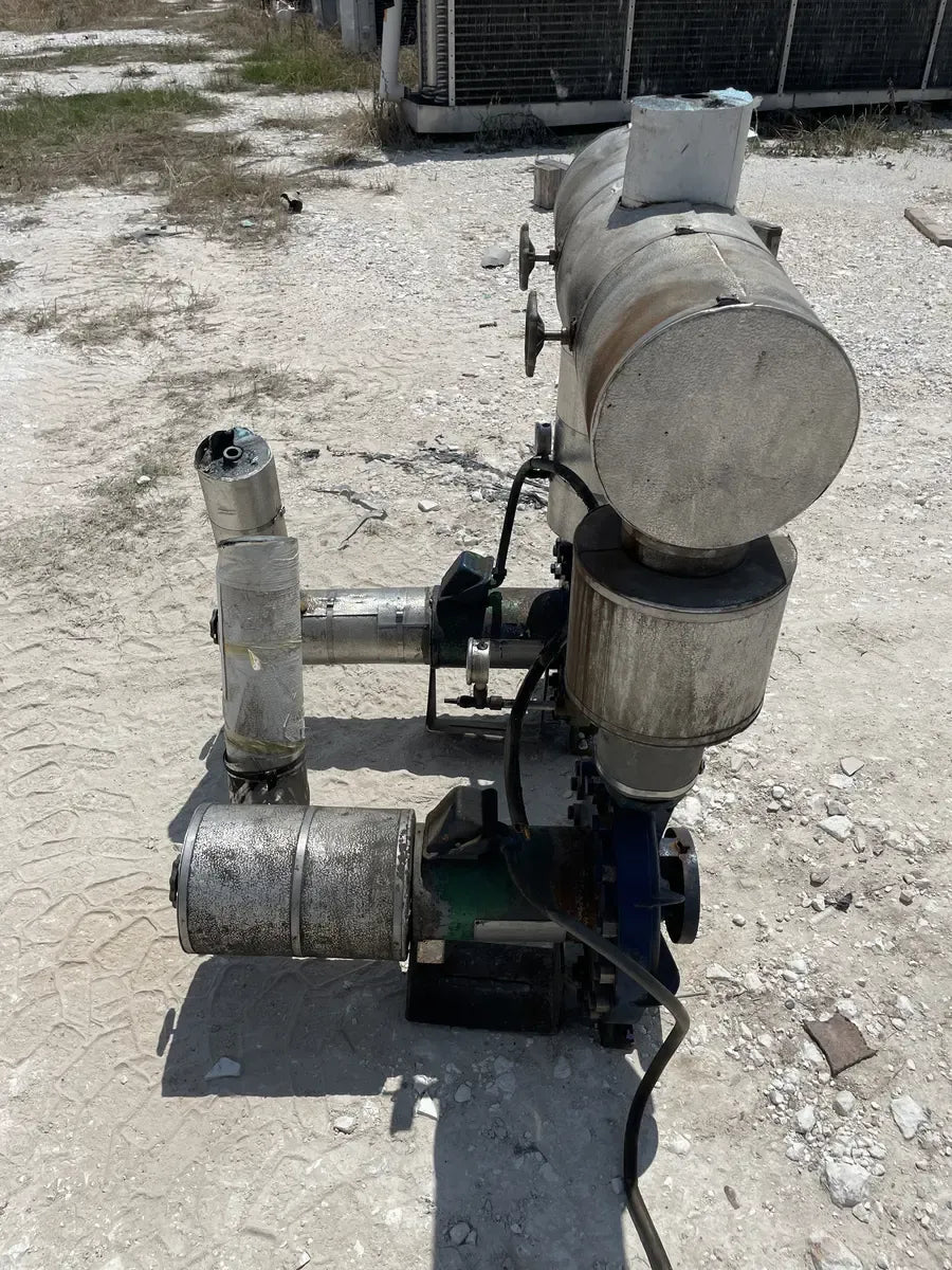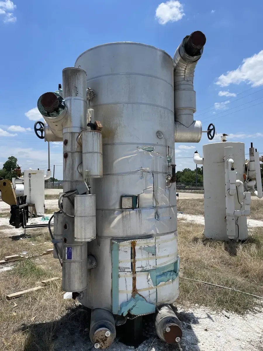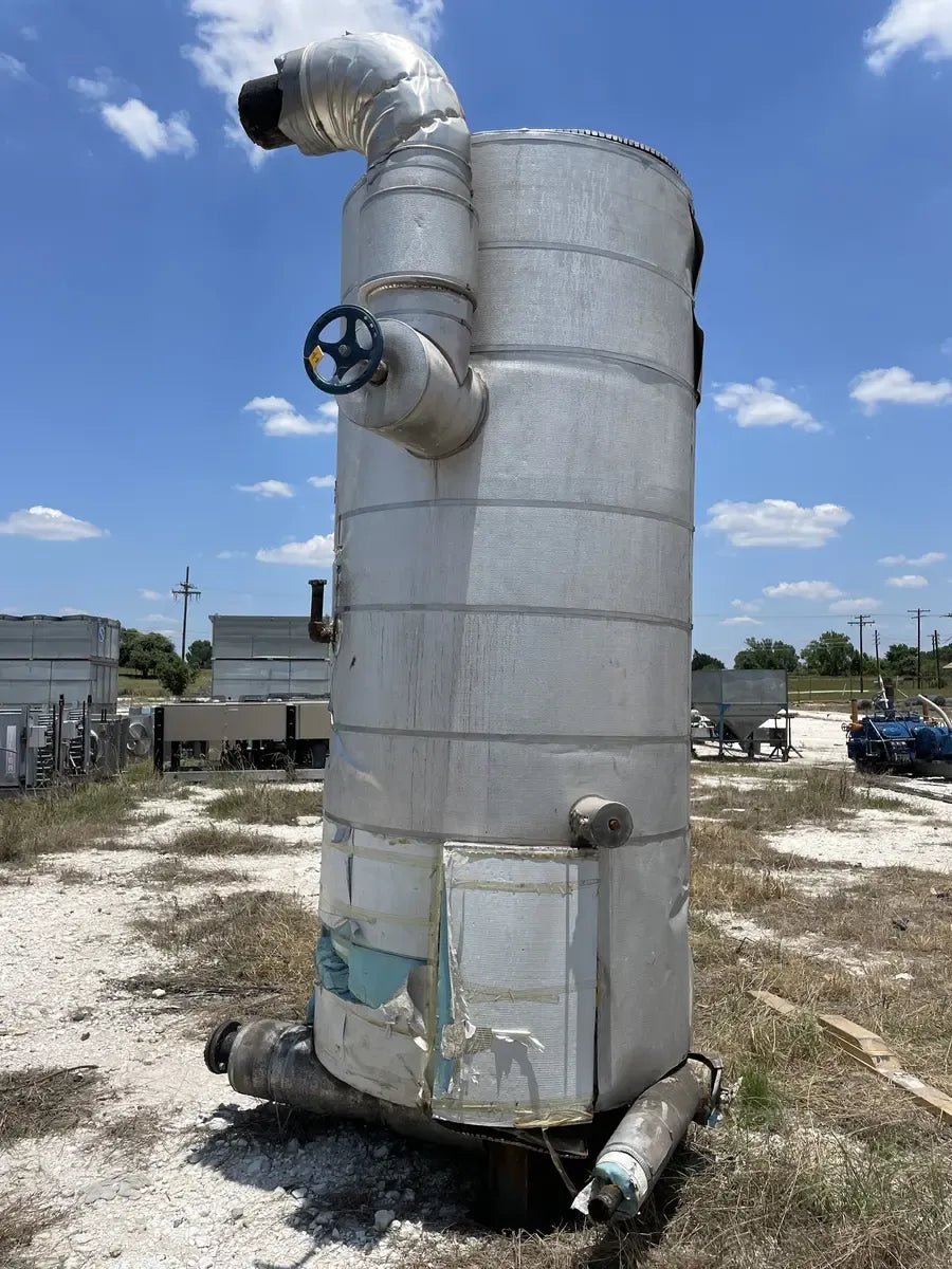 Recirculador de amoníaco vertical RVS (48 diámetro x 147 pulgadas). Estimado 1134 galones. (2) Bombas de 5 HP.) Número de serie: S018189. Número de la Junta Nacional del tanque: 13959. Capacidad estimada del tanque (galones): 1134. MAWP del tanque (PSI a temperatura): 150 PSI a 300 F. MAWT del tanque (PSI a temperatura): -20 F a 150 PSI. El refrigerante utilizado anteriormente fue amoniaco (R717 | NH3). Fabricado en 2002. Dimensiones de envío (pulgadas): 85 X 78 X 149. 1500 LB
