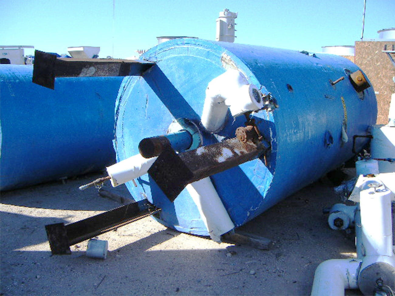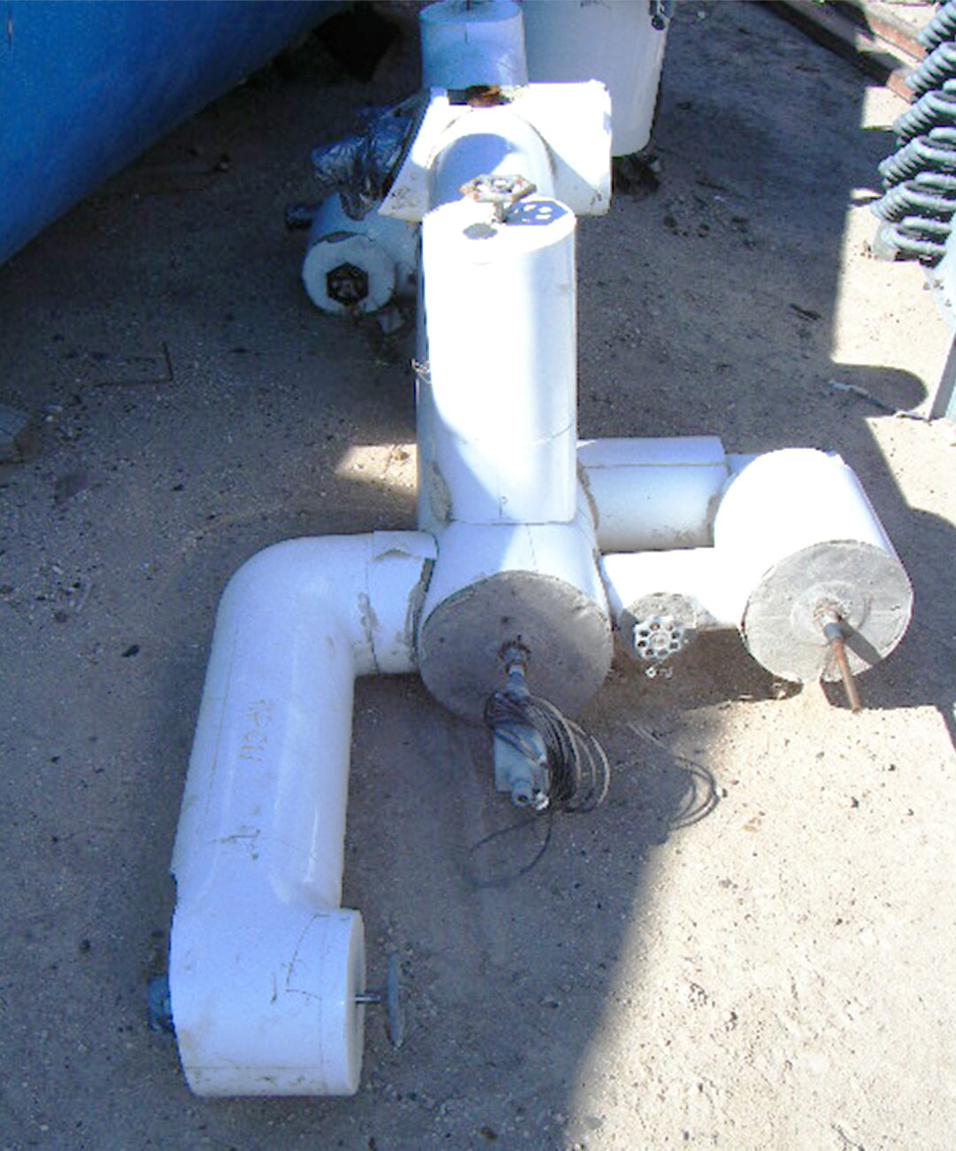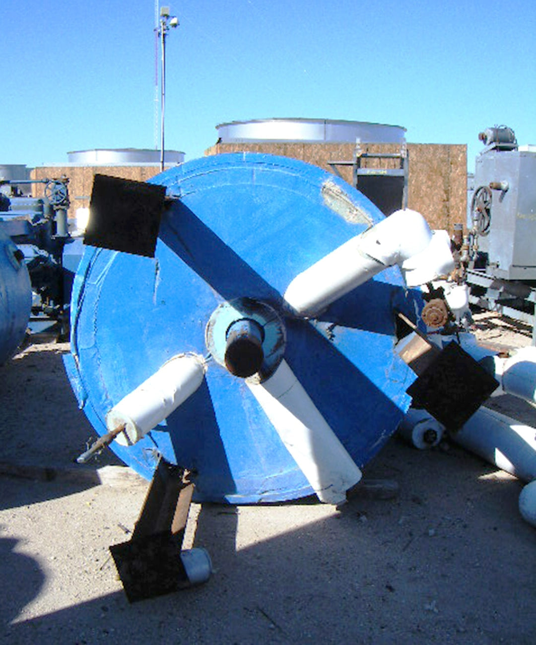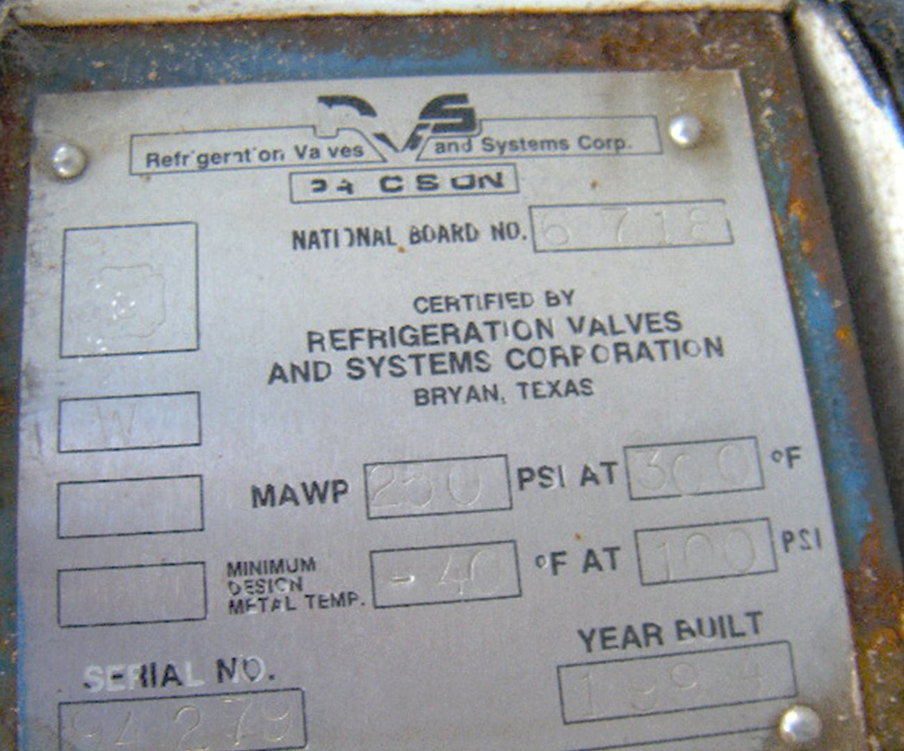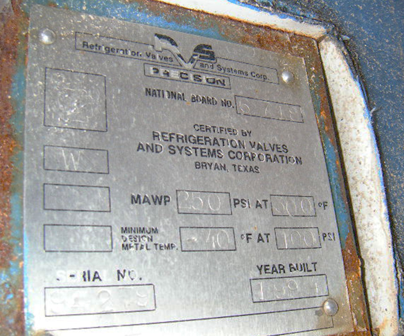 1994 Recirculador vertical de amoníaco RVS. Capacidad aproximada: 1,500 galones. Dimensiones interiores de pared recta: 60 pulg. de diámetro. x 12 pies H. Refrigerante: R-717 (Amoníaco). MAWP: 250 psi a 300°F. MDMT: - 40°F a 100 psi. Radio: extremos elípticos 2:1. Entradas: (1) 10 pulg. de diámetro. Puerto (entrada de succión), (1) 2 pulgadas de diámetro. Puerto (líquido de maquillaje), (1) 3 pulgadas de diámetro. puerto (alimentación líquida). Salidas: (1) 8 pulg. de diámetro. puerto (salida de succión), (2) 3/4 pulg. puertos (respiraderos), (1) 6 pulg. de diámetro. puerto (succión de la bomba). Panel de control con (9) pulsadores y (6) interruptores. Dimensiones del panel: 2 pies de largo x 11 pulgadas de ancho x 1 pie 5 pulgadas de alto. Panel de control Hoffman. Número de gato: A-1212CH. Dimensiones del panel: 1 pie 1 pulg. de largo x 6-1/2 pulg. de ancho x 1 pie 4 pulg. de alto. Dimensiones totales: 6 pies 8 pulg. de largo x 6 pies 6 pies de ancho x 17 pies. h.