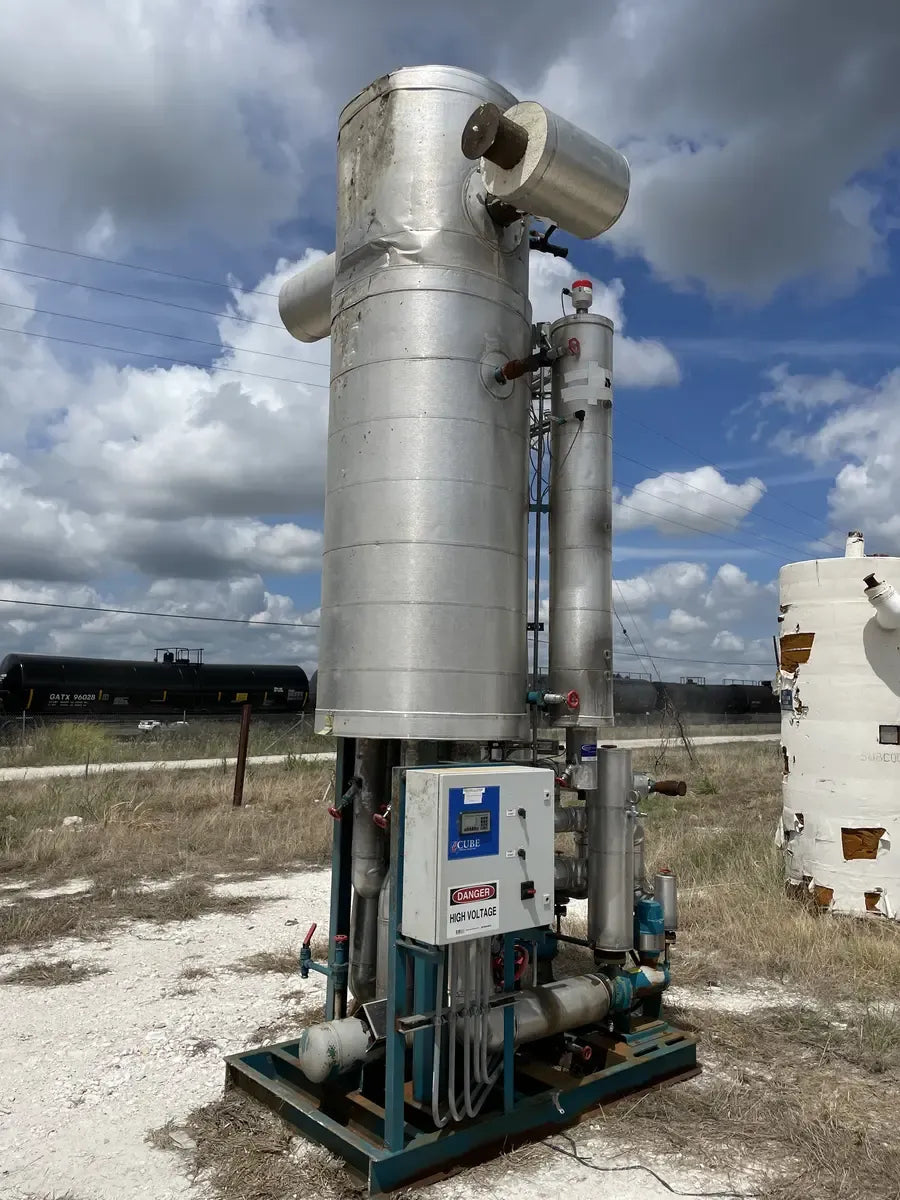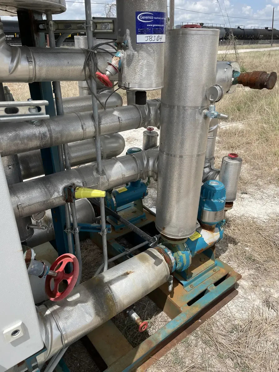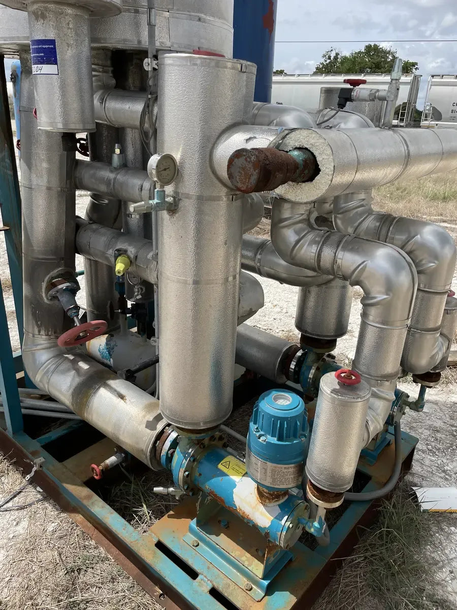 Recirculador de amoníaco vertical Delta Tee International. Certificado por Delta Tee Internacional. Junta Nacional: 3159. Número de serie: 17F2118PK1-V1. Modelo: LSP-3008-V. MAWP del lado de la carcasa (interno): 250 PSI a 300 F. MAWP del lado de la carcasa (externo): 15 PSI a 300 F. MDMT del lado de la carcasa -20 F a 250 PSI. Diámetro (pulg): 30. Longitud total (pulg): 115. Longitud de la carcasa (pulg): 96. (2) Bomba sin sello Nikkiso: Modelo: HQ21C-A3, cabezal: 137,5 pies, 16 GPM, salida: 3,2, HP:1, Voltios: 460, Hz: 60, RPM: 3400. El recirculador viene con un arrancador de control E Cube Micro-Systems. Separador de aceite Delta Tee International: Número de serie: 17F-STK1-005A Junta Nacional: 2993, Año de construcción: 2017. Certificado por Delta Tee International, Inc. MAWP lateral de la carcasa (interno): 450 PSI a 300 F, MAWP (externo): 15 PSI a 300 F. MDMT lateral de la carcasa: -50 F a 450 PSI.