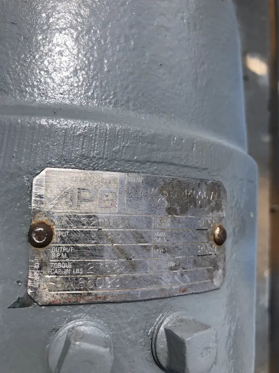 Dodge APG: Tamaño: 182DM3A, HP de entrada: 3,83, límite de torsión en libras: 2758, serie: M057544006AL, factor de servicio: 1,00. Recién pintado