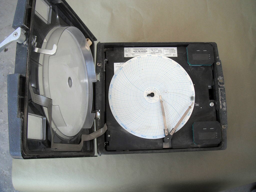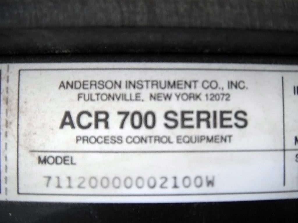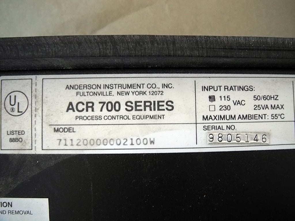 Registrador gráfico serie ACR 700 de Anderson Instrument Co. Modelo: 71120000002100W. Clasificación de entrada: 115 VCA. Clasificaciones de salida de relé: 115 VCA: 5,0 A resistivo 1/8 HP o 250 VA. Clasificación de la carcasa: NEMA 4. Fabricado en EE. UU. Dimensiones totales: 1 pie 5 pulgadas de largo x 5 pulgadas de ancho x 1 pie 2 pulgadas de alto.