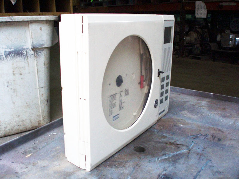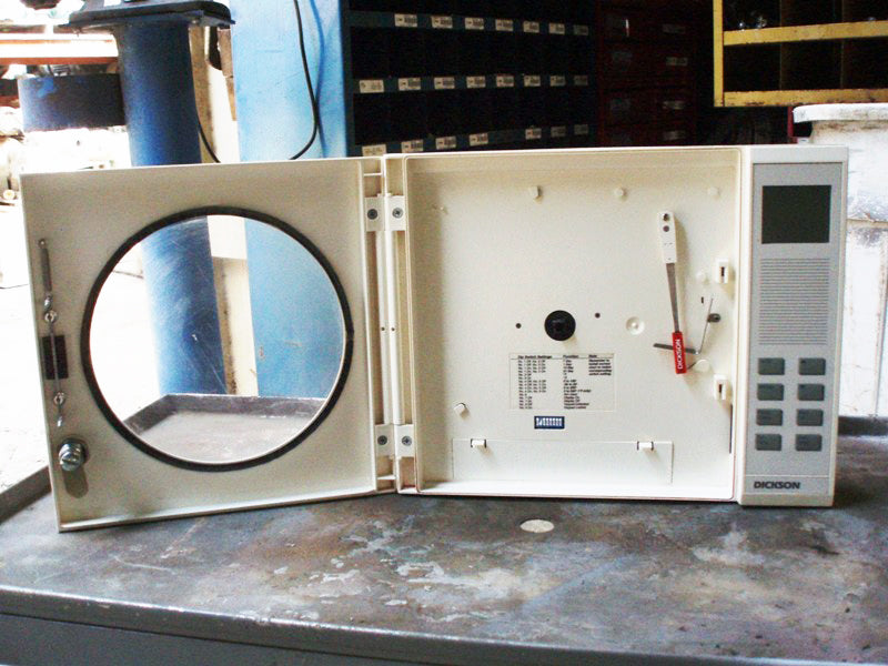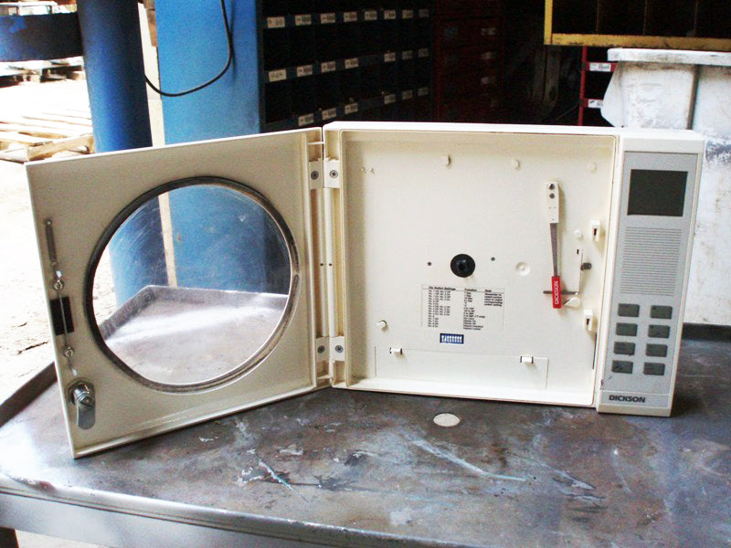 Registrador gráfico de temperatura Dickson. Modelo: KTX. N/S: 04072333. El registrador gráfico de temperatura DICKSON KTX cuenta con un gráfico grande de 8 pulgadas (200 mm) con el triple de área legible que cualquier registrador de 4 pulgadas (100 mm). Tiene múltiples rangos de temperatura seleccionables por el usuario, alarmas audiovisuales y extensiones de sonda disponibles para una flexibilidad incomparable. Dimensiones totales: 1 pie 1-1/4 pulgadas de largo x 2-5/8 pulgadas de ancho x 10-1/2 pulgadas de alto.