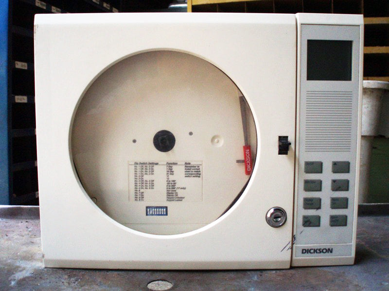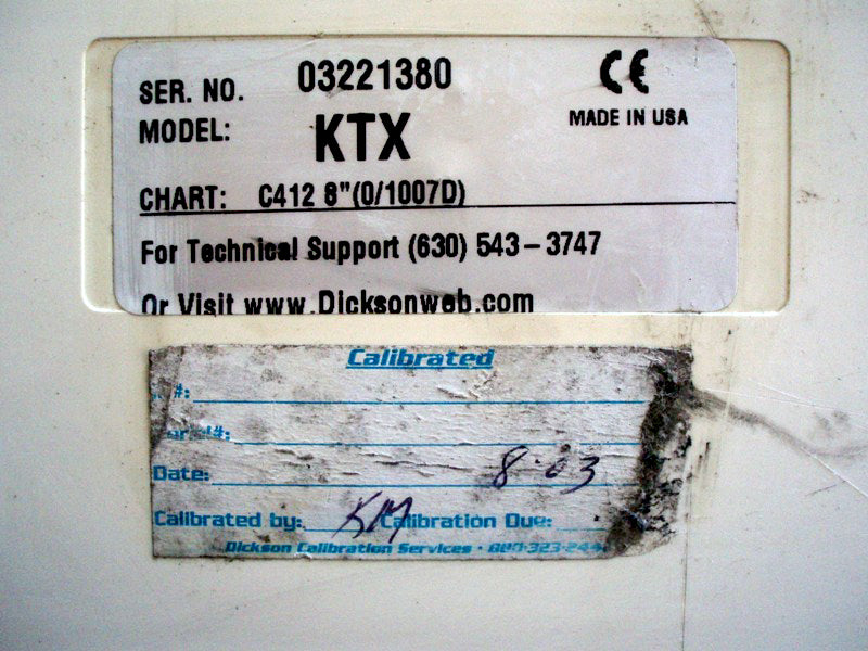 Registrador gráfico de temperatura Dickson. Modelo: KTX. S/N: 03221380. El registrador gráfico de temperatura DICKSON KTX cuenta con un gráfico grande de 8 pulgadas (200 mm) con el triple del área legible del gráfico de cualquier registrador de 4 pulgadas (100 mm). Tiene múltiples rangos de temperatura seleccionables por el usuario, alarmas audiovisuales y extensiones de sonda disponibles para una flexibilidad incomparable. Dimensiones totales: 1 pie 1-1/4 pulgadas de largo x 2-5/8 pulgadas de ancho x 10-1/2 pulgadas de alto.
