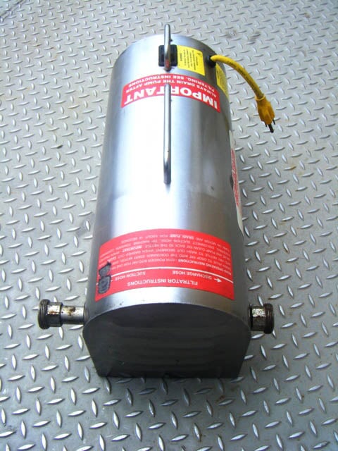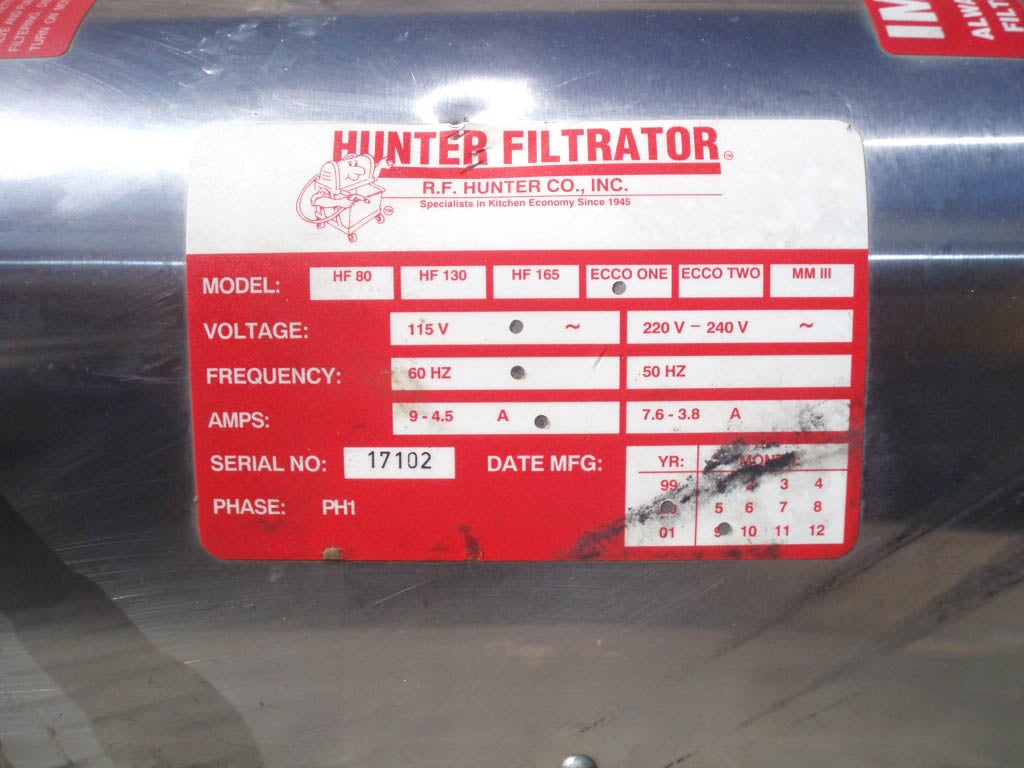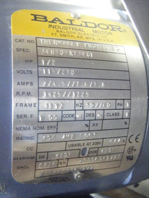 2000 RF Hunter Co., Inc. Unidad de potencia para un filtrador. Modelo: ECCO ONE. Motor eléctrico Baldor: ½ hp, 1425/1725 rpm, 115/230 V, 9/4.5//7.6/3.8 amperios, 50/60 Hz, 1 Fase. Esta es una sección de potencia para una unidad de filtrado diseñada para manejar aceites comestibles a alta temperatura. Con esta unidad de potencia se pueden utilizar contenedores de aceite de varios tamaños. Entradas/salidas: (2) ¾ pulg. MNPT. Dimensiones totales: 1 pie 4 pulgadas. Largo x 10-¾ pulgadas de ancho x 10 pulgadas de alto (ACN9).
