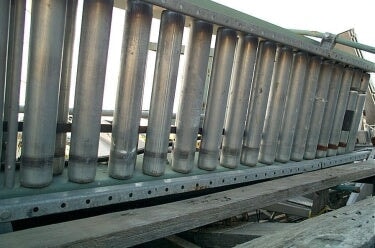 Rodillos Hytrol, 74 pulgadas de largo, 16 pulgadas de ancho. Con transmisión, sin motor y sin información sobre la transmisión. La cadena calibre 50. El eje de la transmisión es de 1 pulg. donde la cadena mide ¾ pulg. y tiene una polea de 6 pulg. Dimensiones totales: 120 pulgadas de largo, 16 pulgadas de ancho, 39 pulgadas de alto. Los rodillos miden 2-3/4 pulgadas de largo, 2 pulgadas de ancho. Los rodillos son impulsados por una correa.