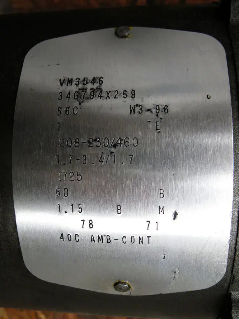 Bomba centrífuga Armstrong. Modelo: H67BF. S/N: 8309. Motor eléctrico Baldor: 1 Hp, 1725 Rpm, 208-230/460 V, 3.7-3.4/1.7 A, 60 Hz, Trifásico. Entrada/salida: (2) 2 pulg. de diámetro. bridas interiores, con (4) 1/2 pulg. de diámetro. Orificios de montaje, 3 pulgadas adyacentes, 4 pulgadas opuestas. Dimensiones totales: 1 pie 10 pulgadas de largo x 1 pie 3 pulgadas de ancho x 1 pie de alto.