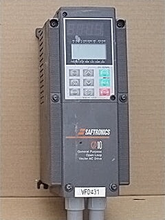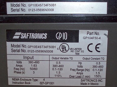 Controlador de velocidad variable Saftronics. Modelo: GP10E4ST34F50B1. Entrada: 380-480 V, 1,63 amperios, 50/60 Hz, trifásica. Salida TQ variable/constante: 0,5 hp, 380-460 V, 0,1-120 Hz, 1,5 amperios.