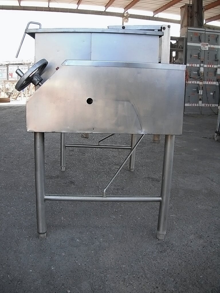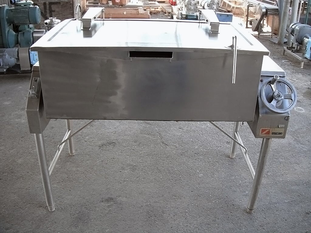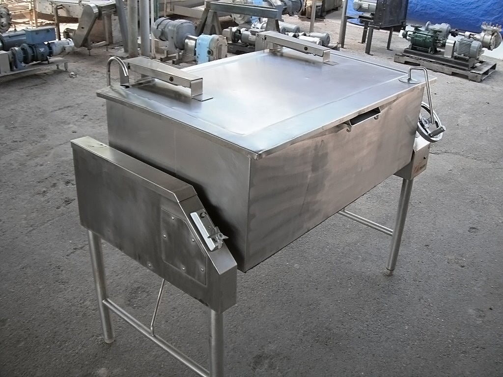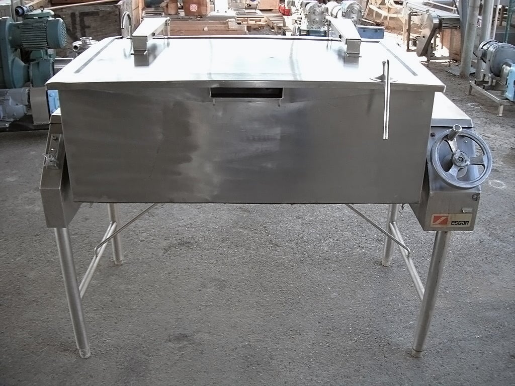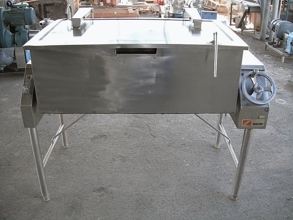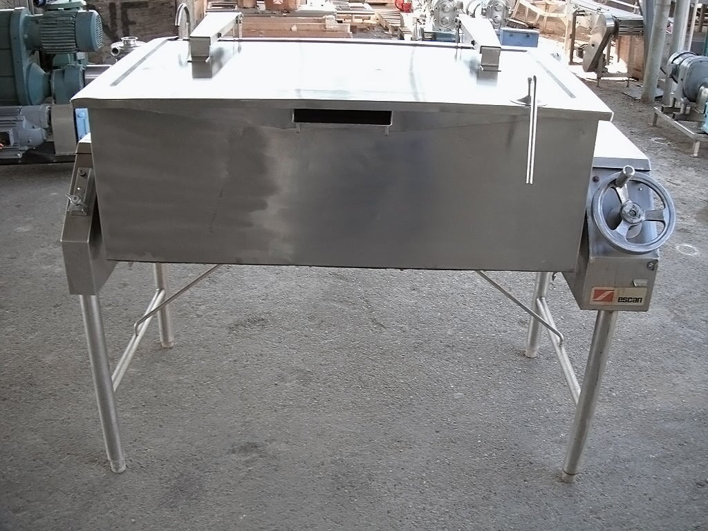Sartén Eléctrica. Capacidad de 40 galones. Dimensiones interiores: 43 pulgadas de largo x 23 pulgadas de ancho x 12 ½ pulgadas de alto. La altura interior del pico vertedor es de 10 ½ pulgadas. El pico vertedor mide 8 pulgadas de ancho. Tapa abatible. Grifo. Mecanismo de inclinación manual con mango de 8 pulg. de diámetro. Dimensiones totales: 4 pies 9 pulgadas de largo x 2 pies 11 pulgadas de ancho x 3 pies 10 pulgadas de alto.