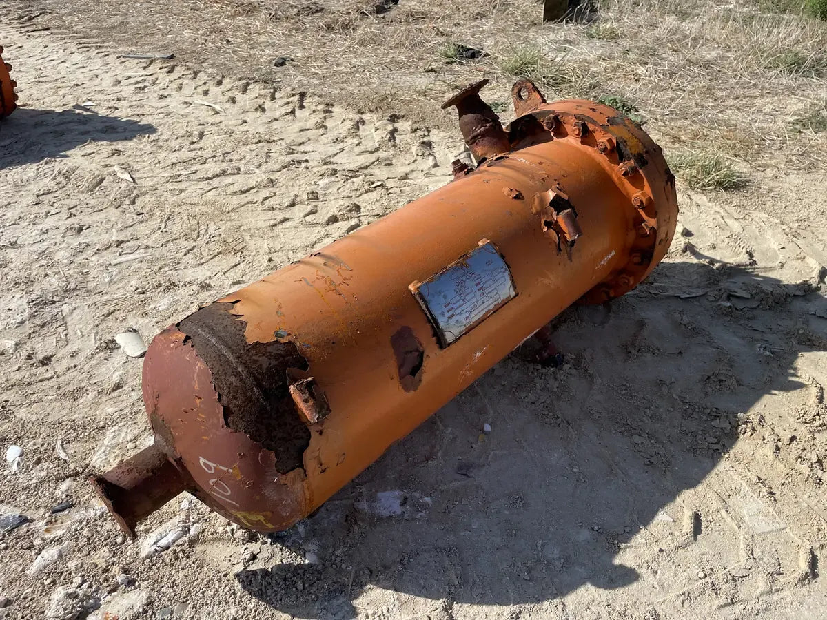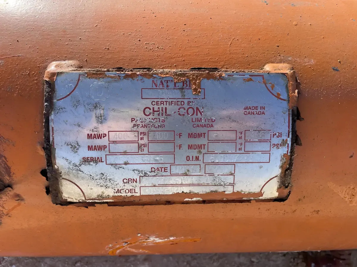 Separador de aceite horizontal Chil-Con COSR-070 (12-3/4 pulg. x 32-5/8 pulg. 20 galones) Número de serie: C970855A-5. Número de la Junta Nacional del tanque: 7950. Capacidad estimada del tanque (galones): 20. MAWP del tanque (PSI a temperatura): 399 PSI a 400 F. MAWT del tanque (PSI a temperatura): -20 F a 400 PSI. El refrigerante anterior era amoniaco (R717 | NH3). Fabricado en 1997. Dimensiones de envío (pulgadas): 42 x 17 x 17. 650 LB