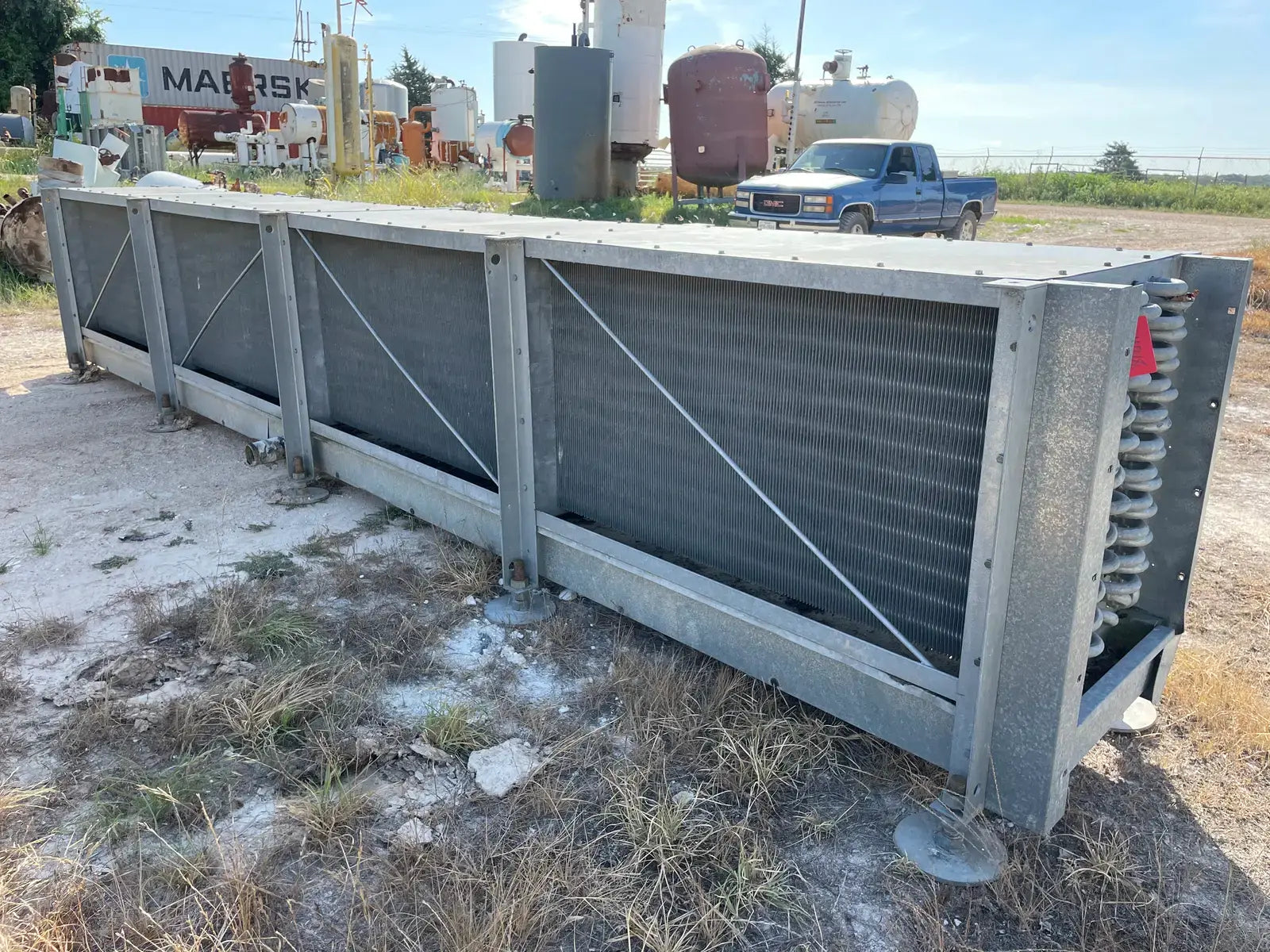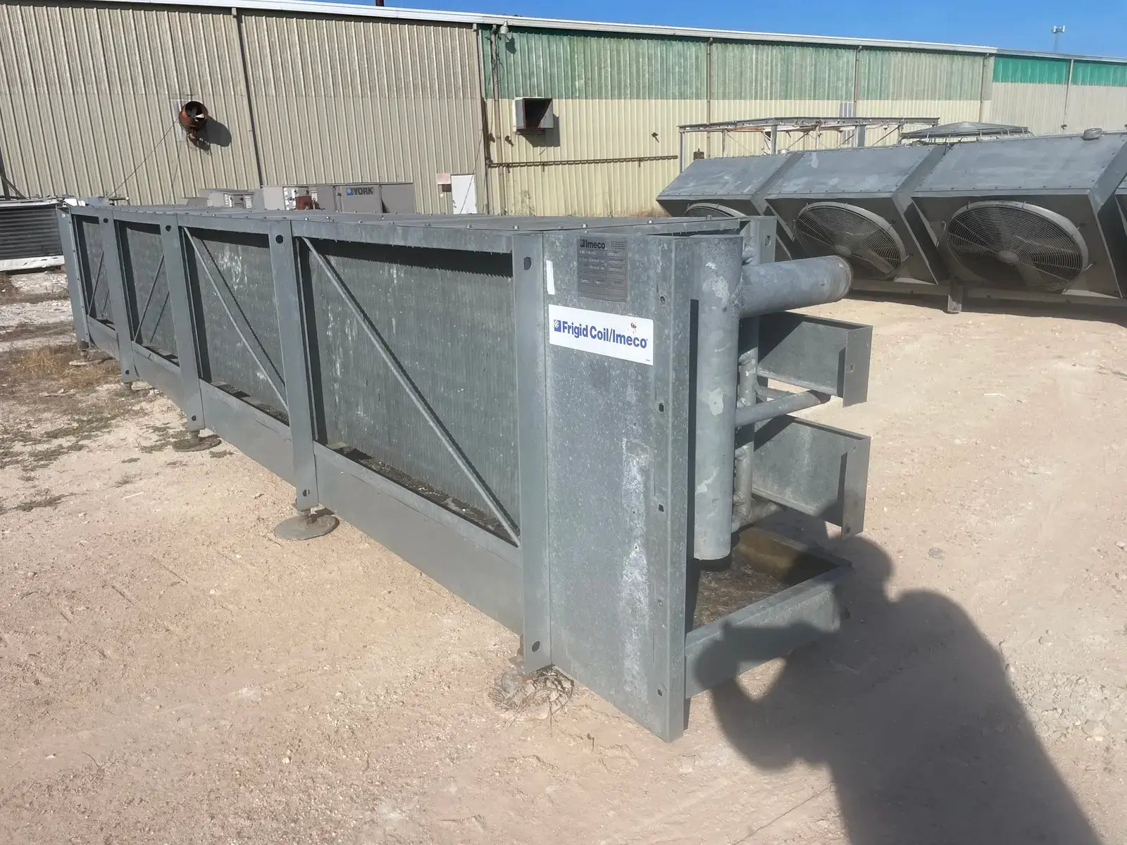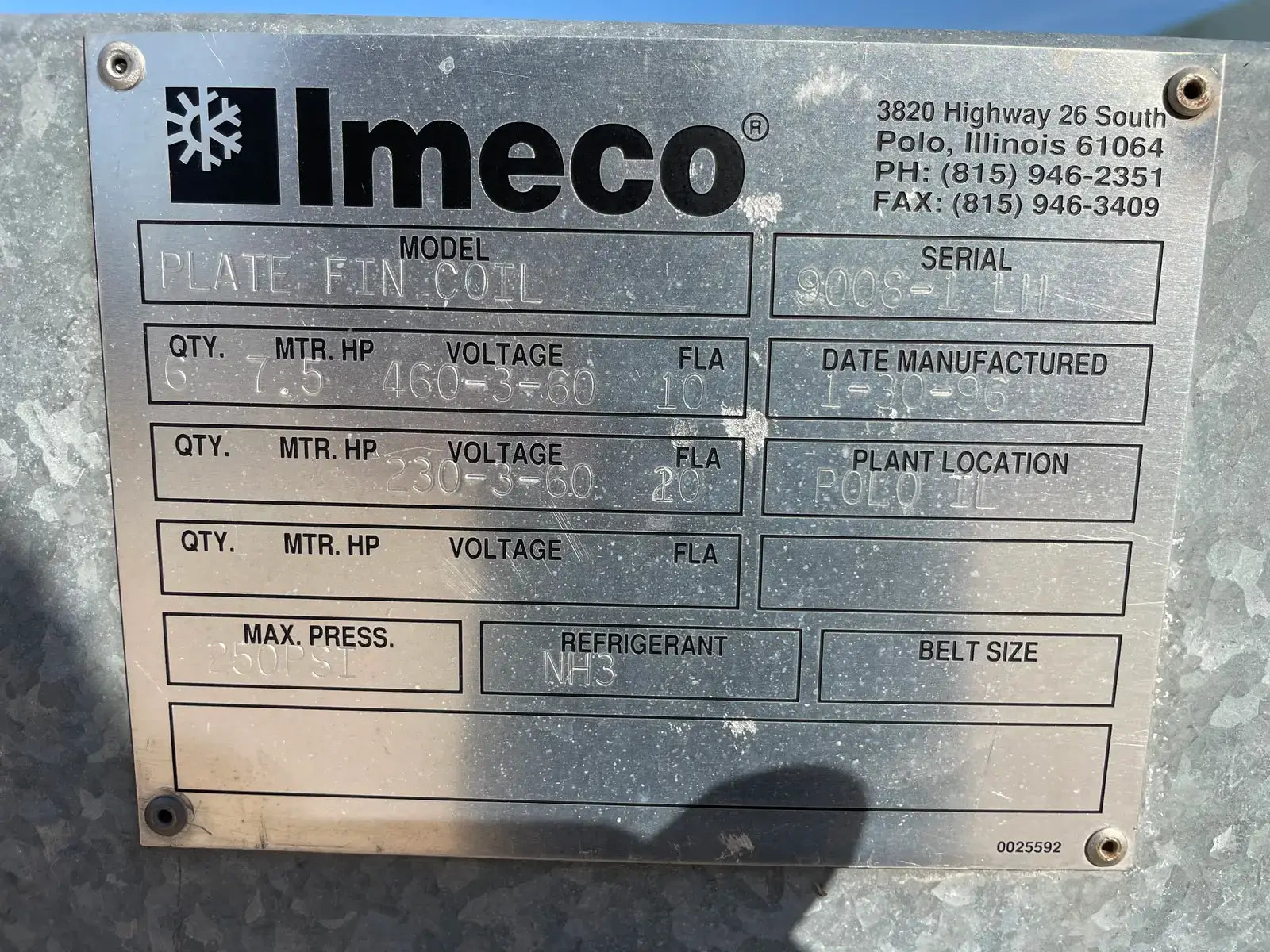 Serpentín de amoníaco de baja temperatura serie ICB de Imeco. Modelo: Serpentín de aletas de placa. N.º de serie: 9008-1 LH. Fecha de fabricación: 30-1-1996. Presión máxima: 250 PSI. Refrigerante: NH3.