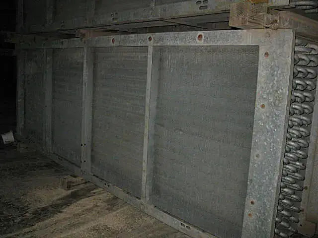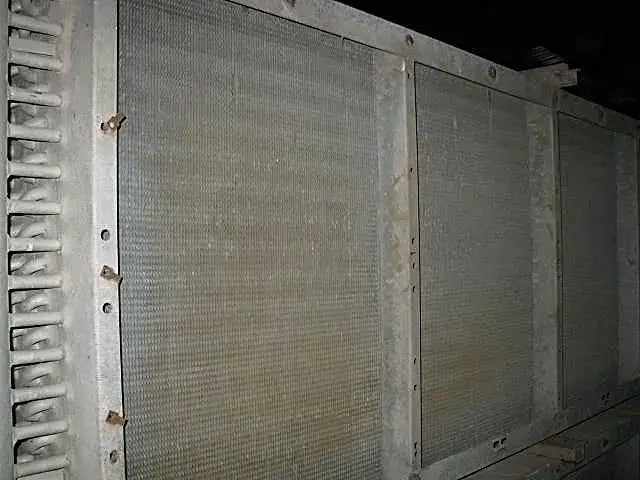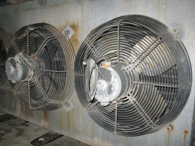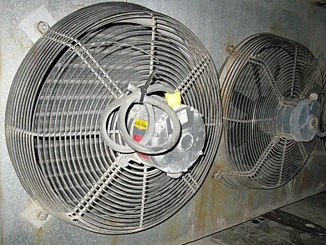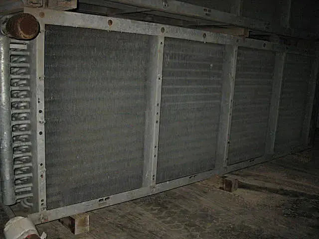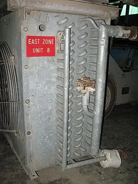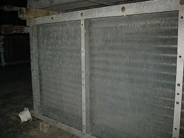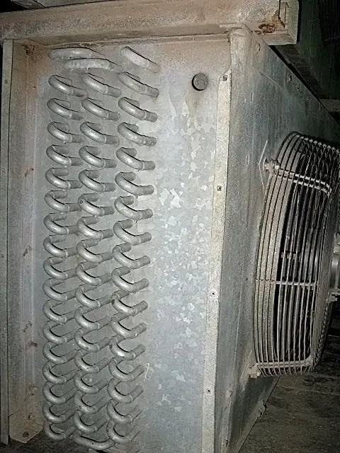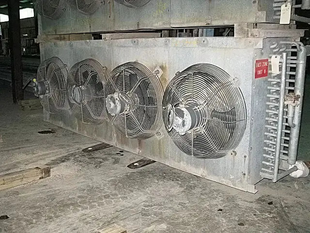 Evaporador de amoníaco Krack de 4 ventiladores. Refrigerante: R-717 (Amoníaco). Material de construcción: acero galvanizado. Serpentín: 6 filas de tubos de ¾ de pulgada de diámetro con (4) aletas por pulgada. (4) ventiladores de 26 pulgadas de diámetro. (4) motores de ventilador: ½ hp, 208-230/460 V, 1140 rpm, 60 Hz, trifásicos. Entradas: (1) 2-1/2 pulg. Salidas: (1) 1 pulg. Dimensiones totales aproximadas: 10 pies 2-1/4 pulg. de largo x 1 pie 4-1/4 pulg. de ancho x 3 pies 4 pulg. H.
