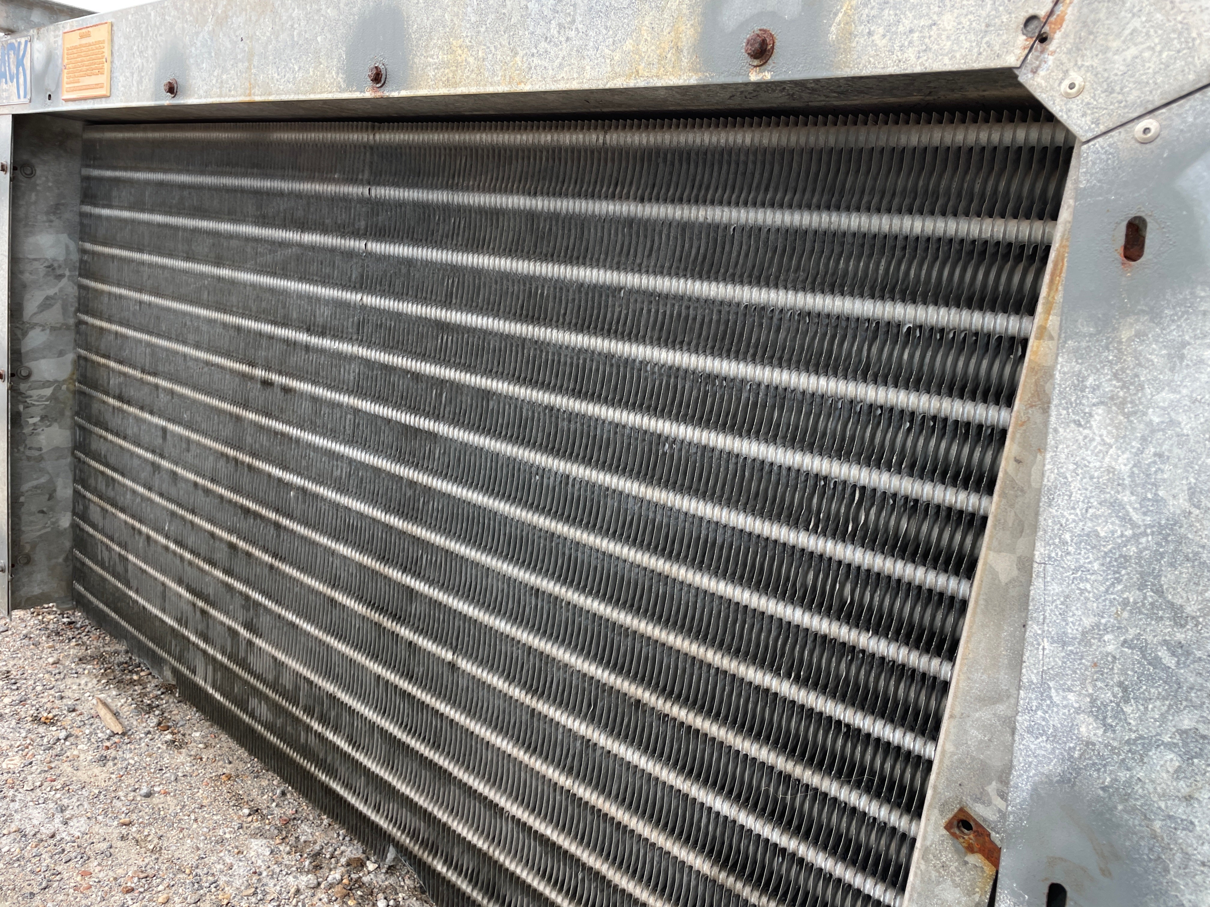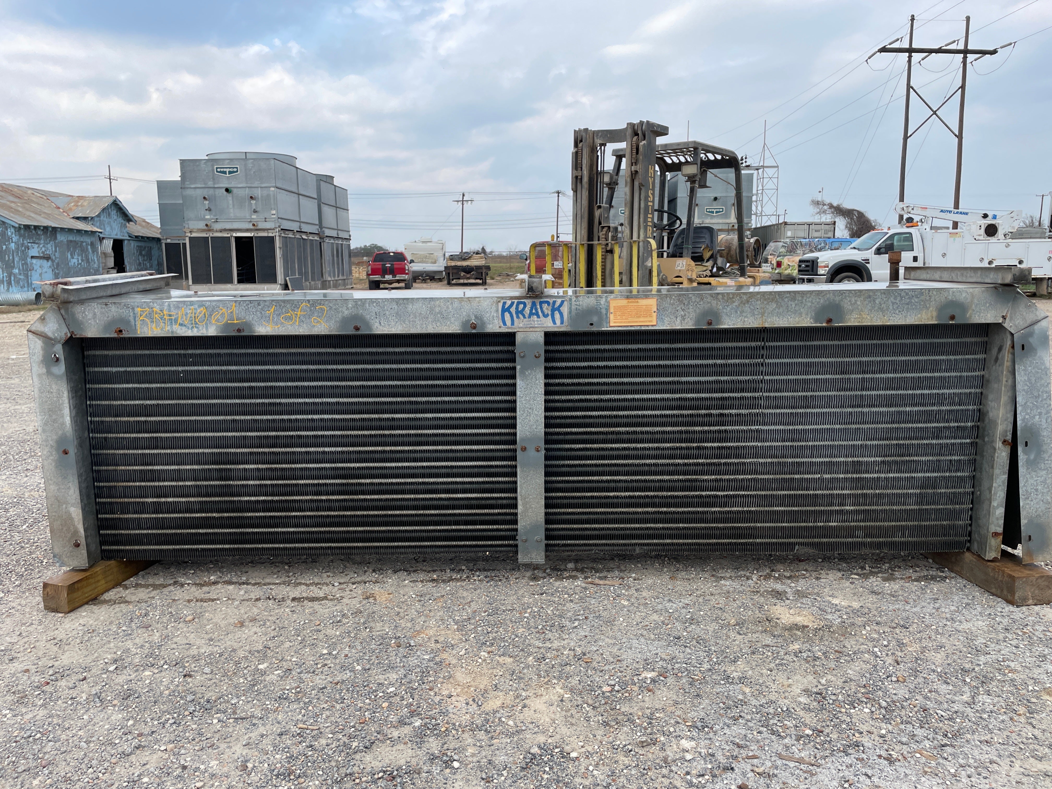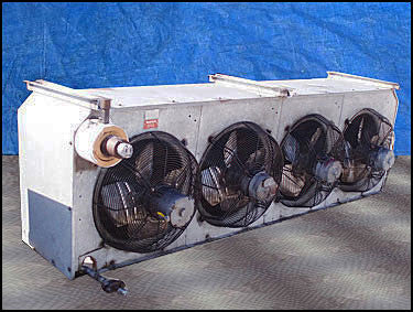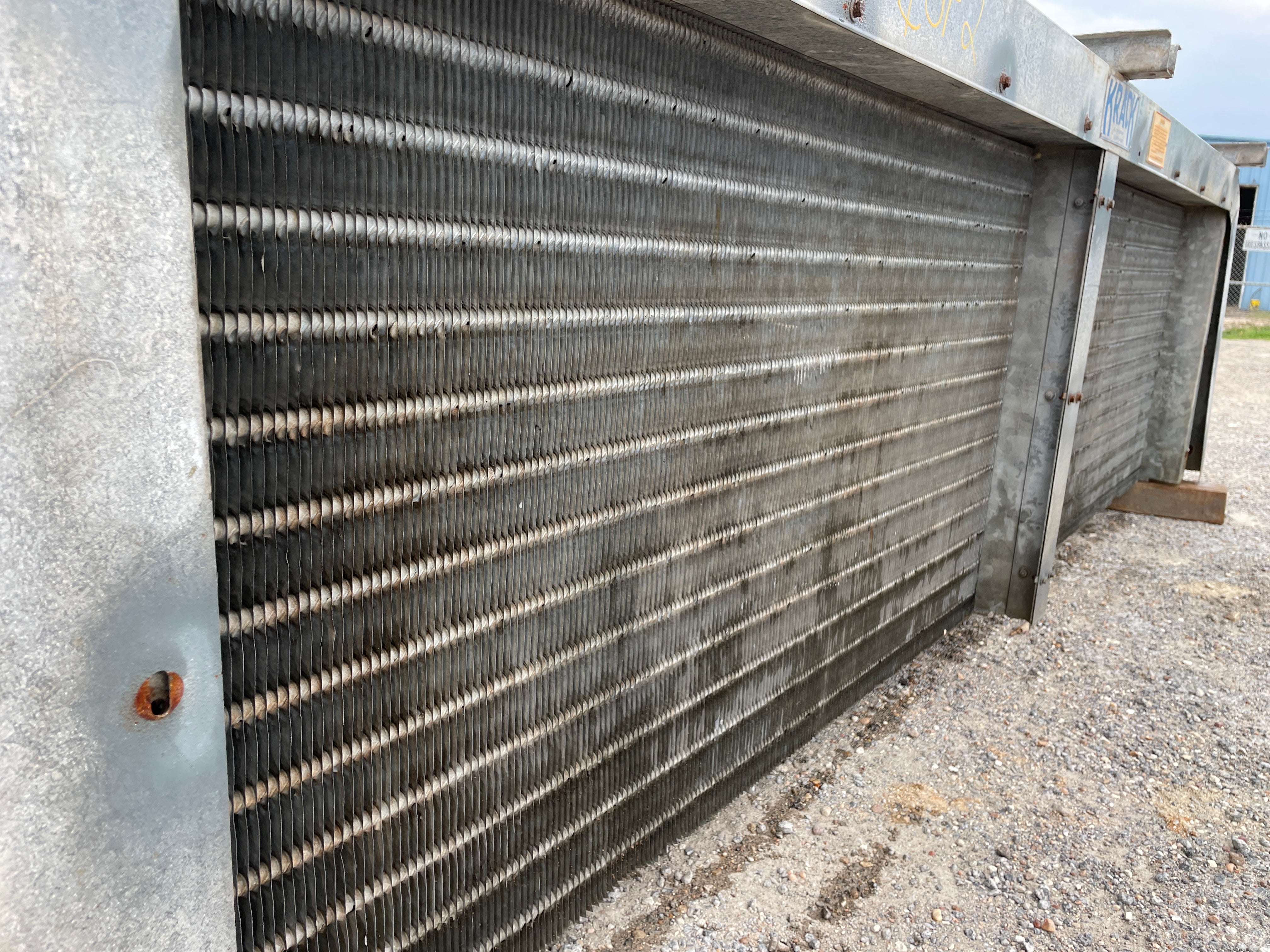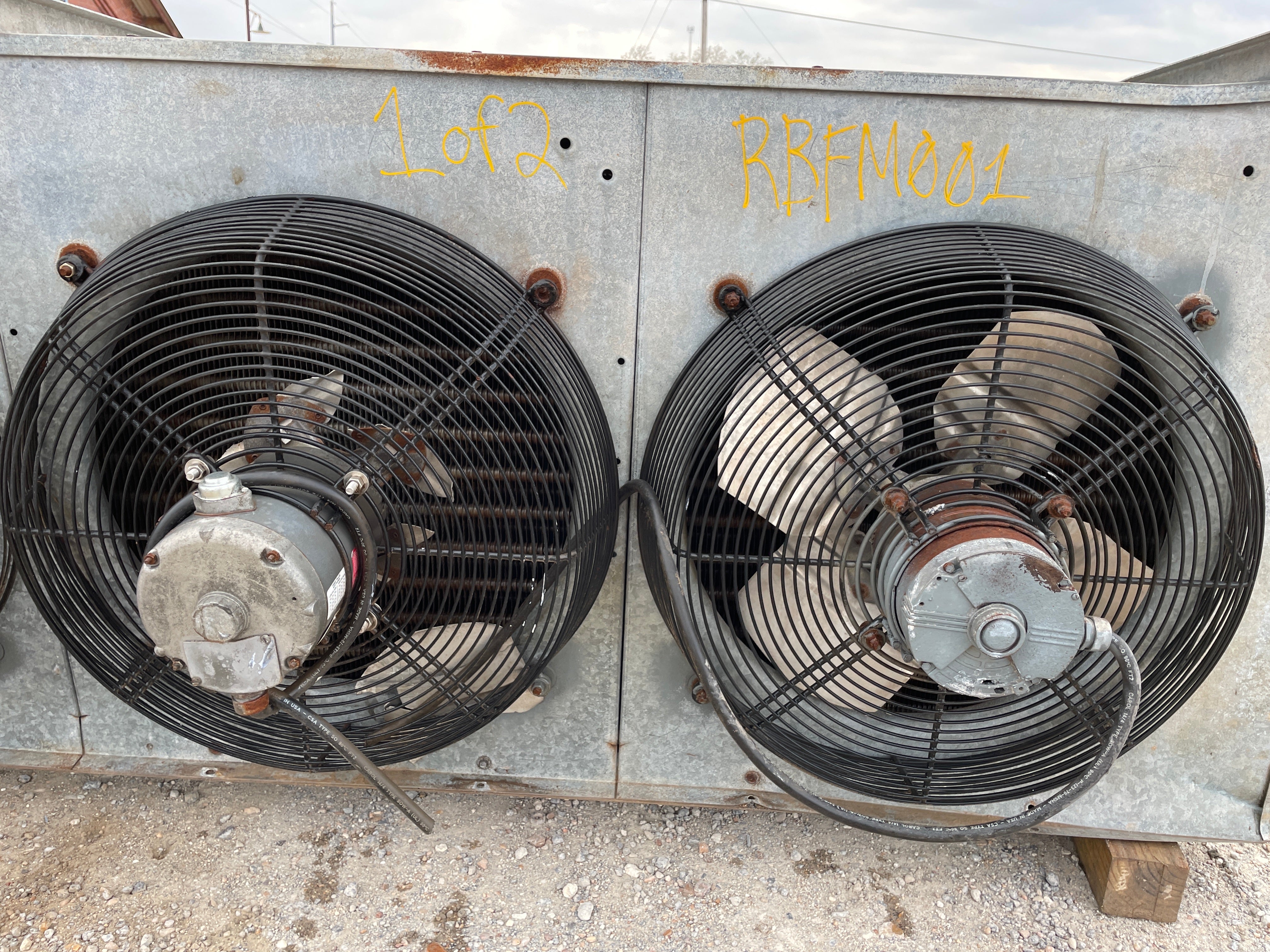 (2) Evaporador de amoníaco Krack de 4 ventiladores. Modelo: SHG-6850-RBA. S/N: 302443-A 10, 302443-B 10. Refrigerante: R-717 recirculado (amoniaco). Capacidad nominal: 82.300 Btuh con 10˚F TD o 6,86 toneladas. Diseño psig: 302. Material del tubo de construcción: acero galvanizado. Número de ventiladores: 4. Diámetro del ventilador: 1 pie 10 pulg. Material de construcción de las aletas: acero galvanizado. Aletas por pulgada: 3. (2) Motor industrial Baldor, 1/3 hp, 1140 rpm, 208-230/460 V, 1,7-1,6/0,5 amperios, 60 Hz, trifásico. (2) Motor eléctrico Franklin, 1/3 hp, 1140 rpm, 208-230/460 V, 2,24-1,96/1,0 amperios, 60 Hz, trifásico. Entradas: (1) 2 ½ pulg. de diámetro. puerto, (1) 1 ½ diá. puerto. Salidas: (1) 1 pulg. de diámetro. puerto. Dimensiones totales: 10 pies de largo x 3 pies 1 pulgada de ancho x 3 pies 2 pulgadas de alto (H15).