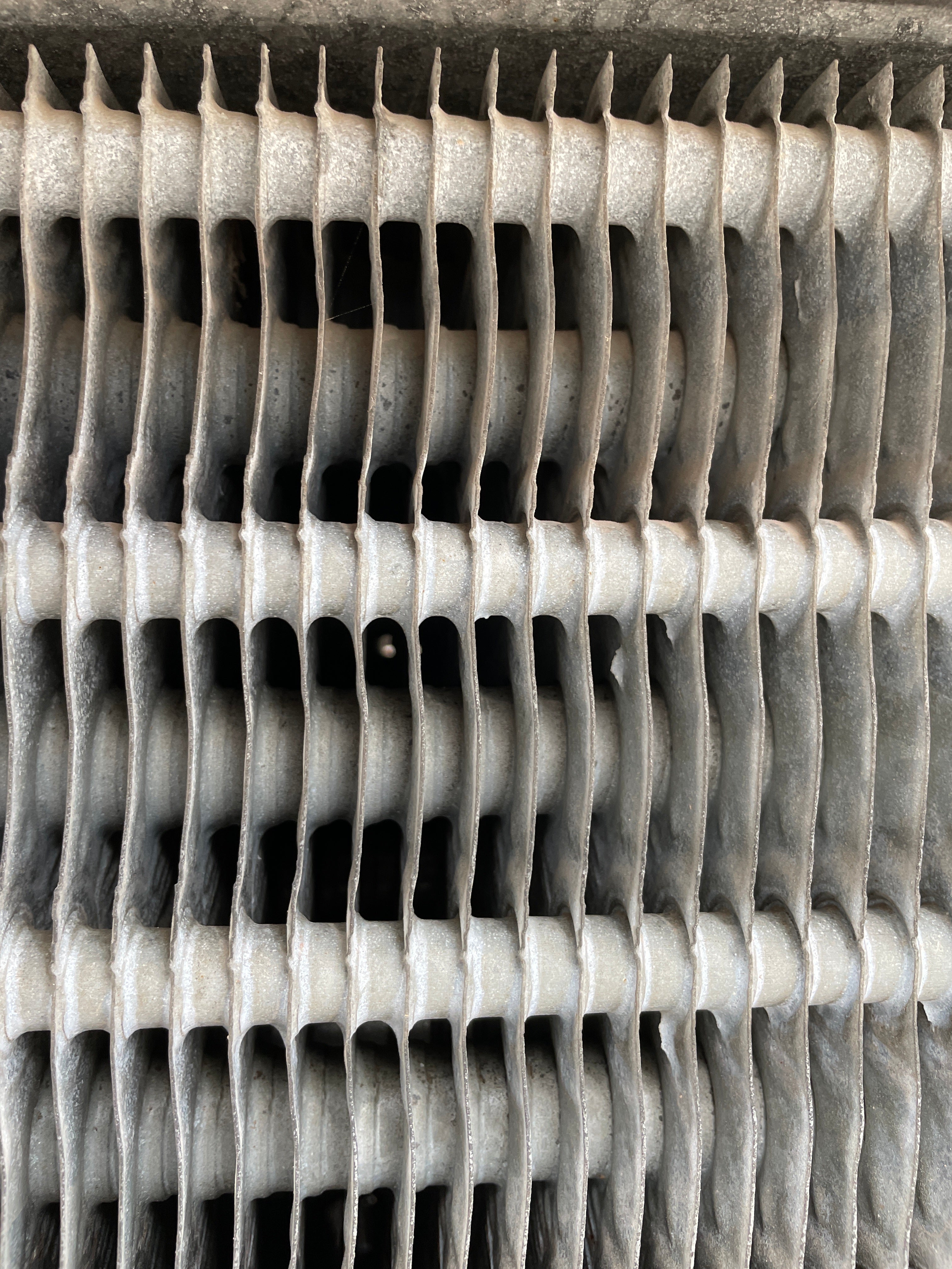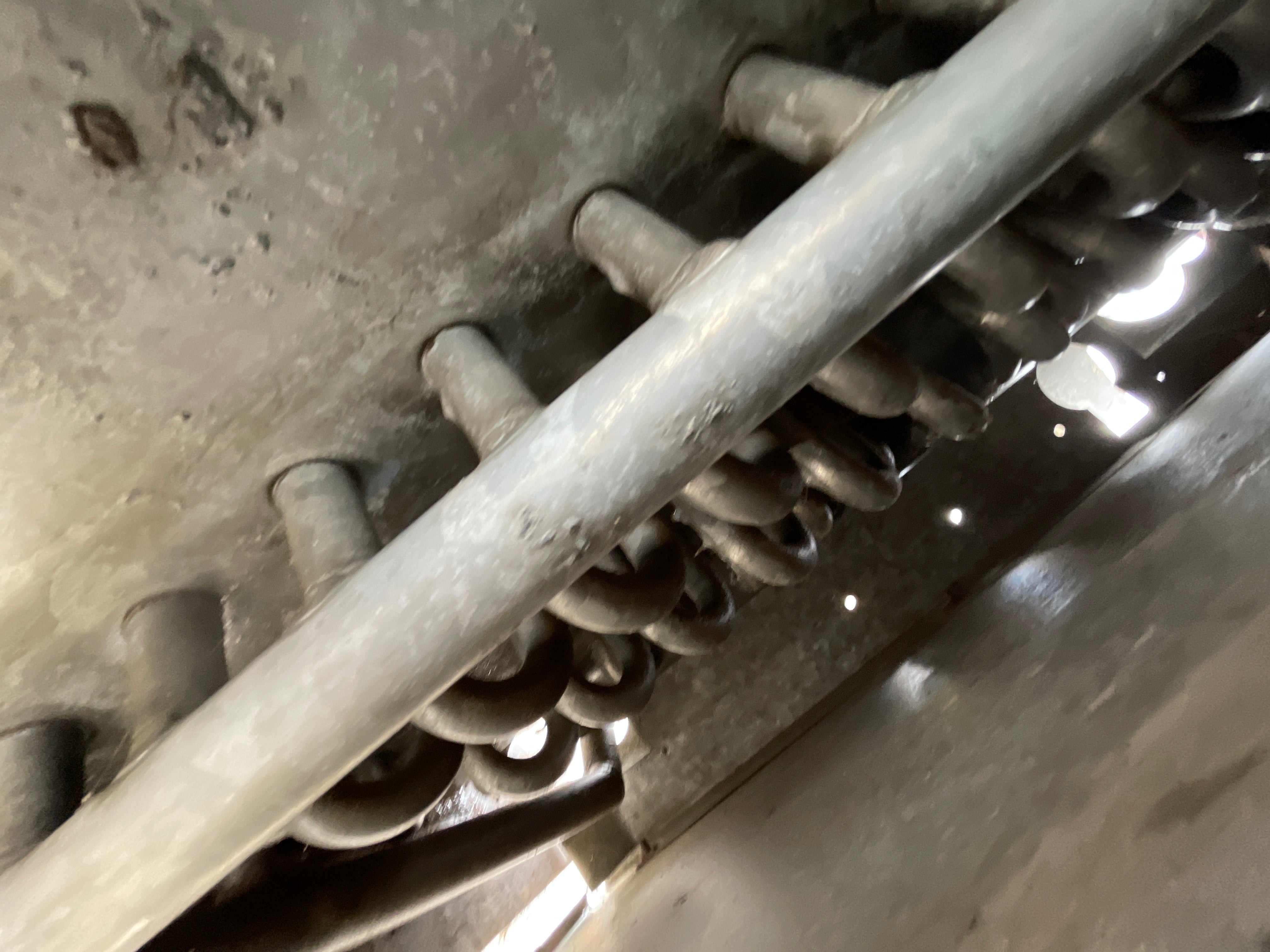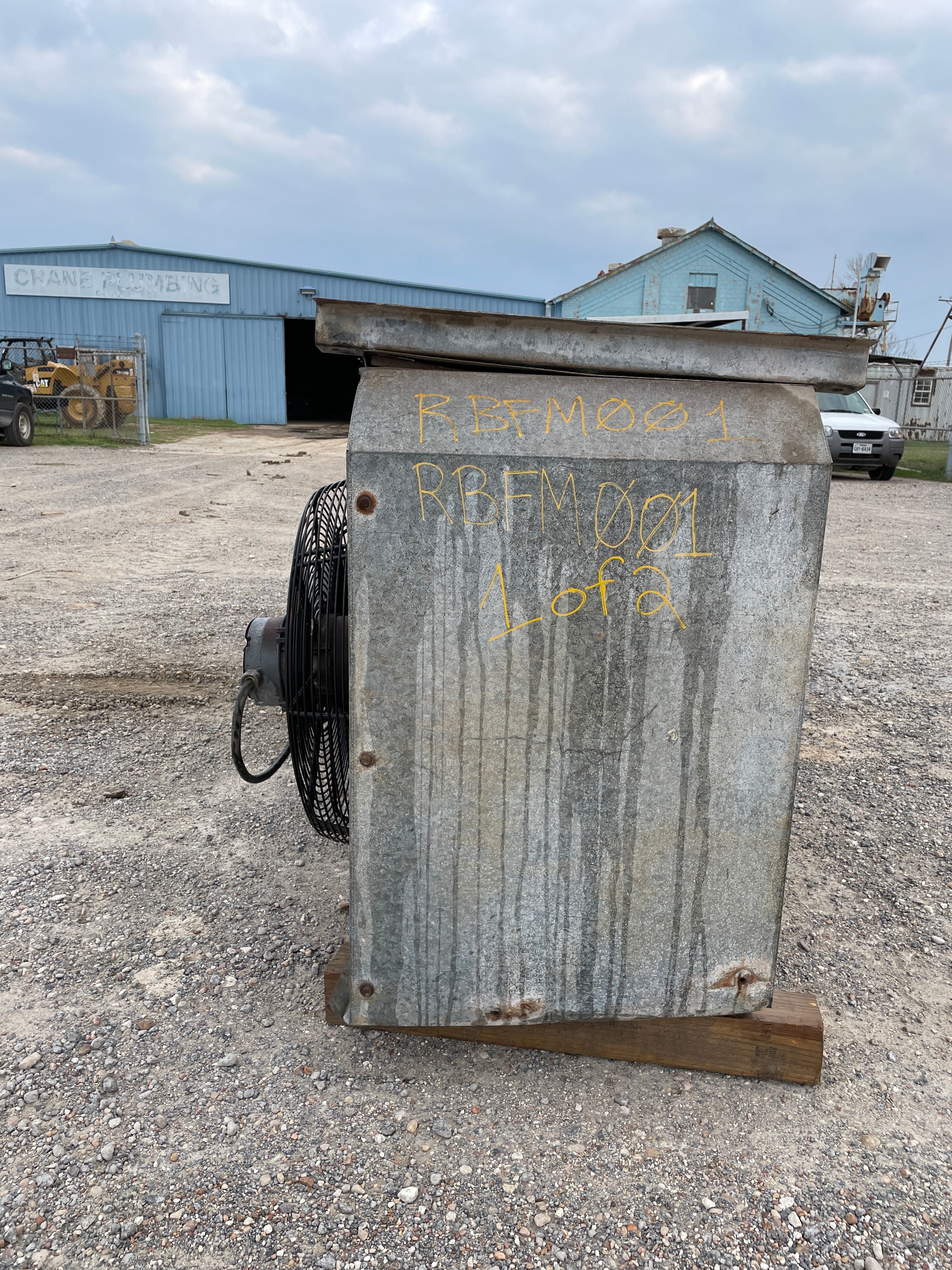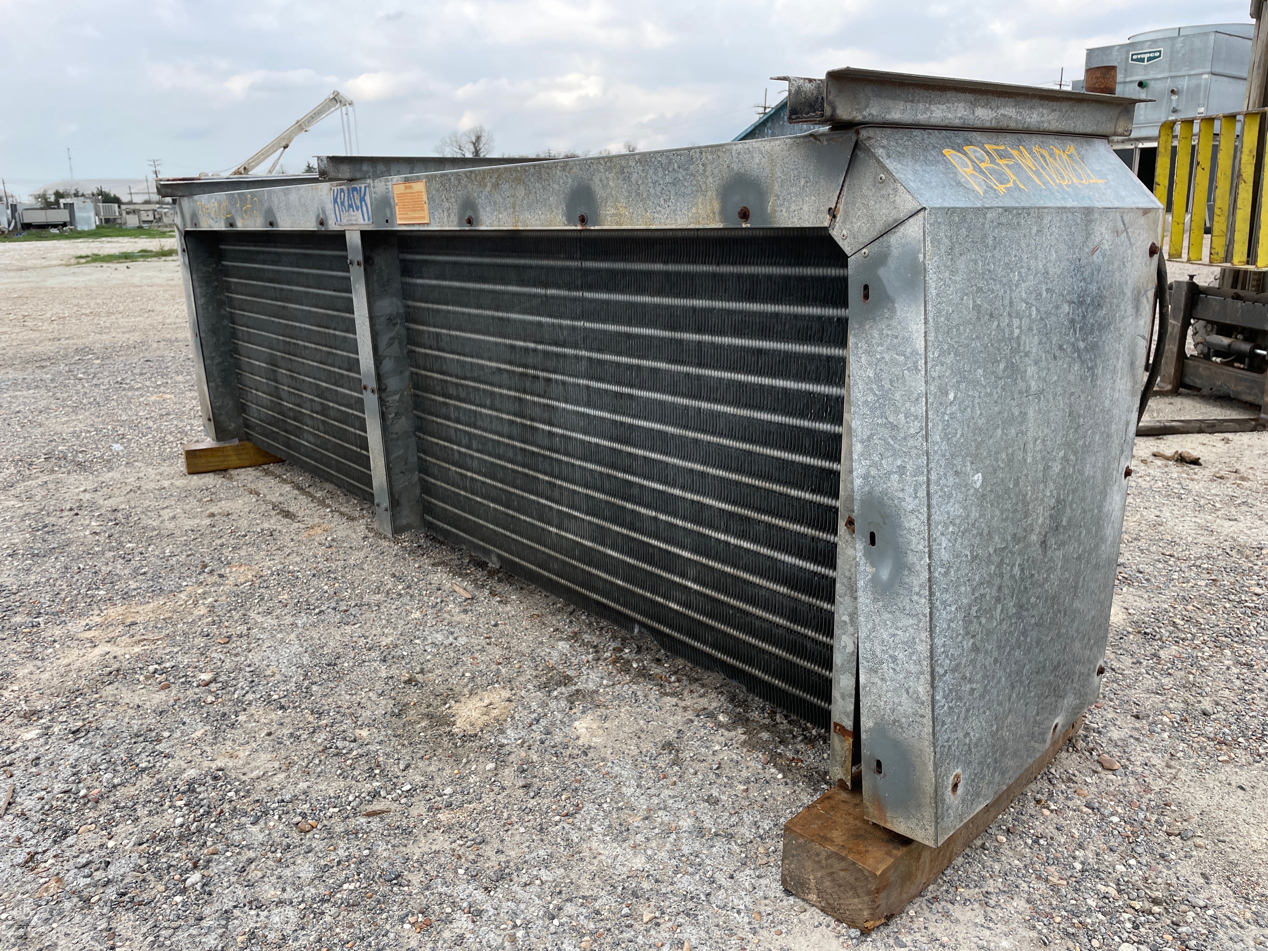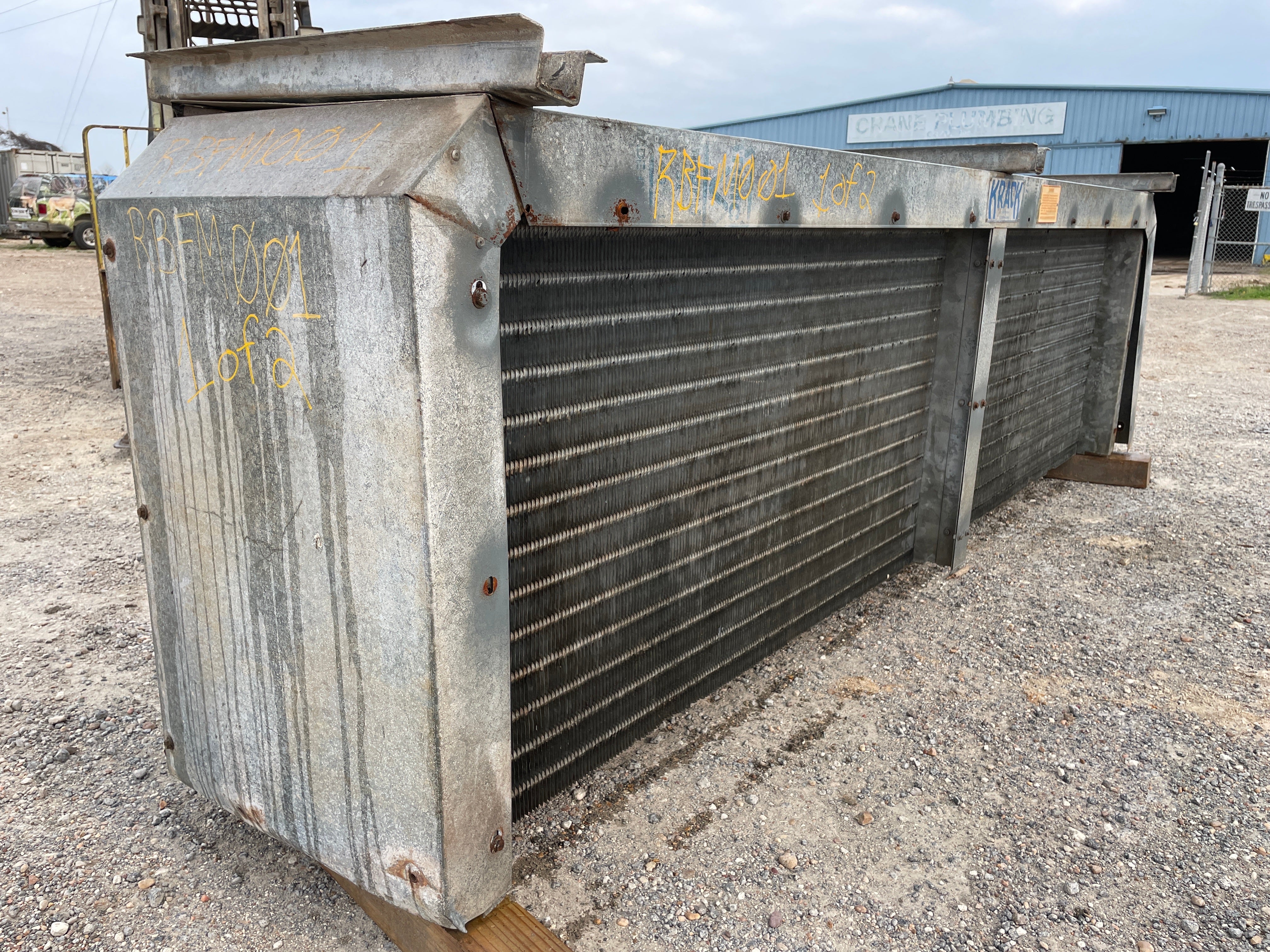 (2) Evaporador de amoníaco Krack de 4 ventiladores. Modelo: SHG-6850-RBA. S/N: 302443-A 10, 302443-B 10. Refrigerante: R-717 recirculado (amoniaco). Capacidad nominal: 82.300 Btuh con 10˚F TD o 6,86 toneladas. Diseño psig: 302. Material del tubo de construcción: acero galvanizado. Número de ventiladores: 4. Diámetro del ventilador: 1 pie 10 pulg. Material de construcción de las aletas: acero galvanizado. Aletas por pulgada: 3. (2) Motor industrial Baldor, 1/3 hp, 1140 rpm, 208-230/460 V, 1,7-1,6/0,5 amperios, 60 Hz, trifásico. (2) Motor eléctrico Franklin, 1/3 hp, 1140 rpm, 208-230/460 V, 2,24-1,96/1,0 amperios, 60 Hz, trifásico. Entradas: (1) 2 ½ pulg. de diámetro. puerto, (1) 1 ½ diá. puerto. Salidas: (1) 1 pulg. de diámetro. puerto. Dimensiones totales: 10 pies de largo x 3 pies 1 pulgada de ancho x 3 pies 2 pulgadas de alto (H15).