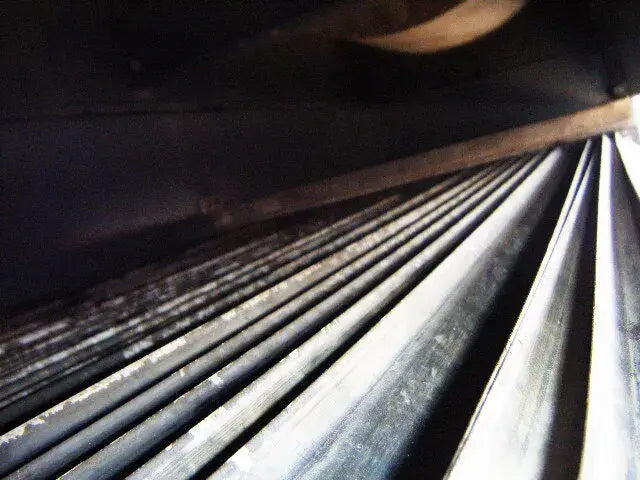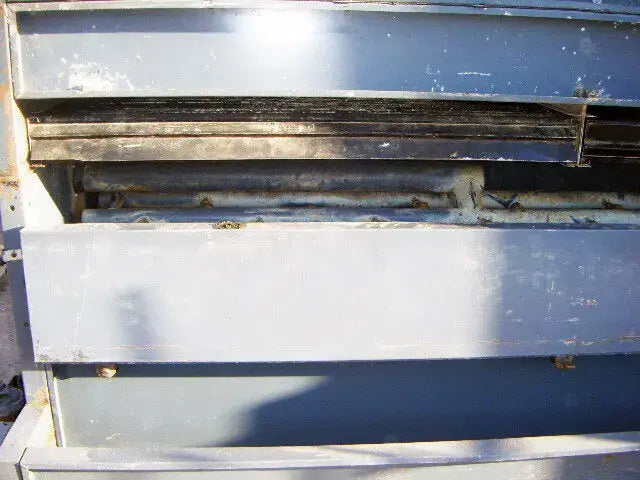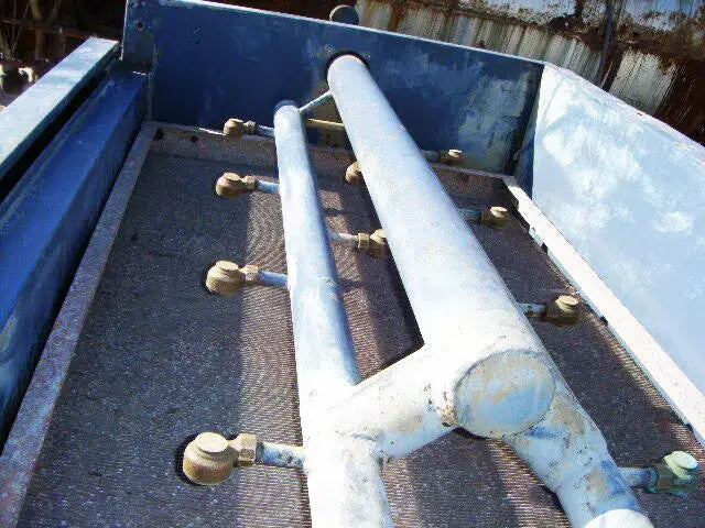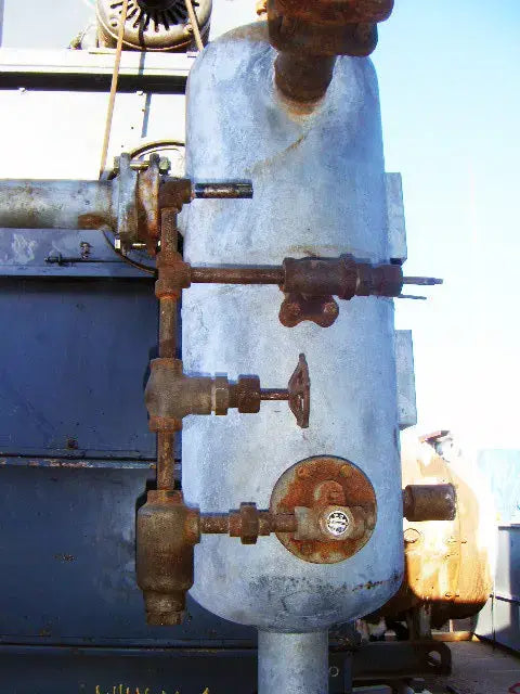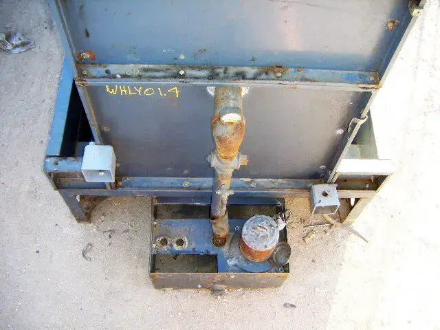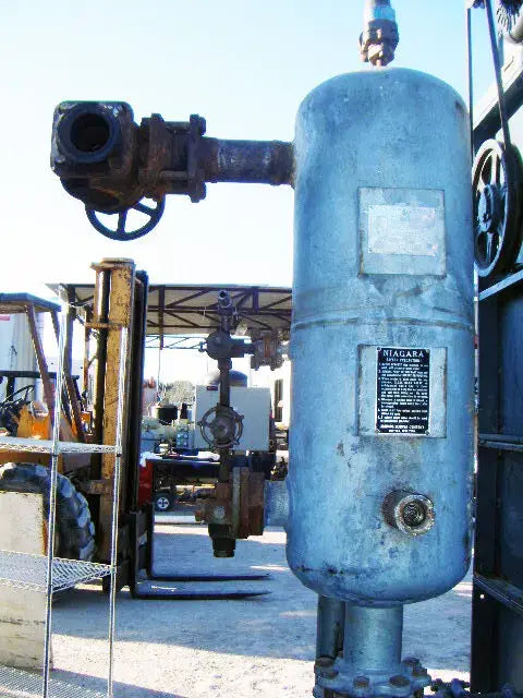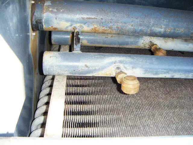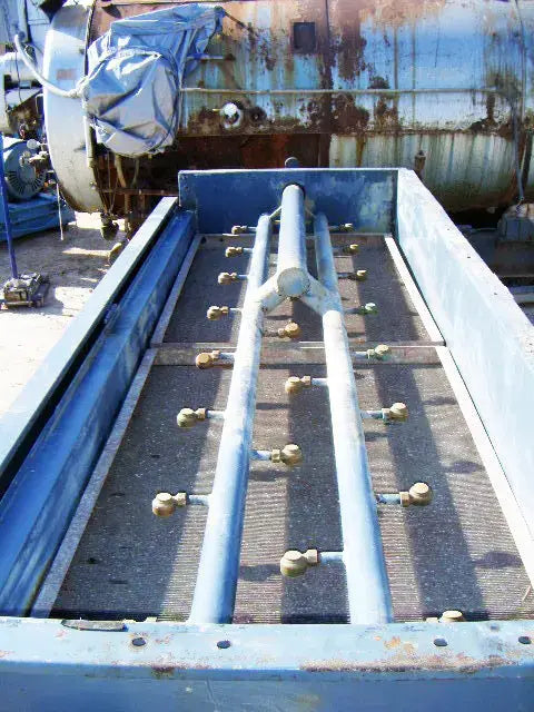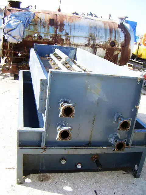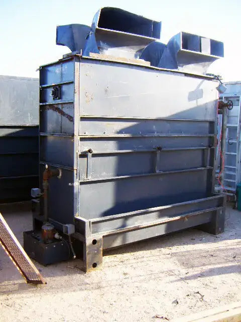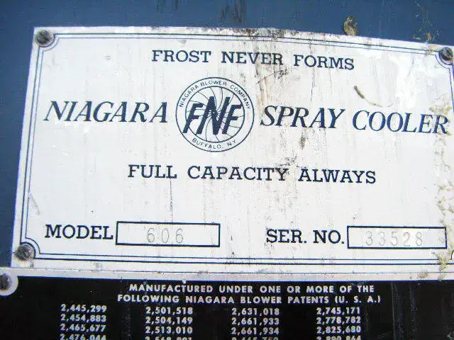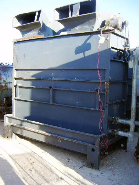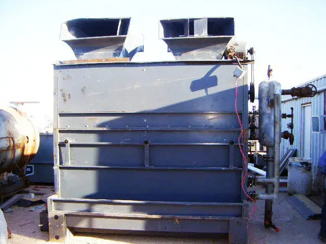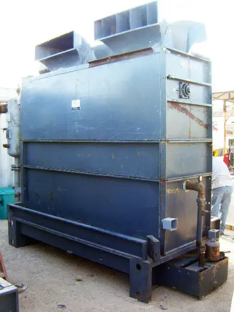 Evaporador enfriador por pulverización Niagara No-Frost. Modelo: 606. Refrigerante: usado por última vez con R-717 (amoniaco). (2) Ventiladores centrífugos. Motor Lincoln, 7,5 hp, 1450 rpm, 21/10,5 amperios, 208-230/460 V, 60 Hz, trifásico. Motor de bomba estadounidense: 3450 rpm, 2,7/1,35 amperios, 220/440 V, 60 Hz, trifásico. Proceso: Los ventiladores centrífugos extraen aire a través de un serpentín con circulación de refrigerante. El serpentín se rocía continuamente con una solución de glicol que elimina la humedad del aire que pasa a través del serpentín, lo que evita la acumulación de escarcha. Utilizado anteriormente en un congelador de lonja. Entradas: (2) 4 pulg. de diámetro. puertos, (1) 2 pulg. de diámetro. puerto, (1) 3 pulg. de diámetro. puerto. Salidas: (2) 4 pulg. de diámetro. puertos, (1) 2 pulg. de diámetro. puerto. Dimensiones totales: 14 pies x 2 pulgadas de largo x 5 pies de ancho x 10 pies 8 pulgadas de alto.