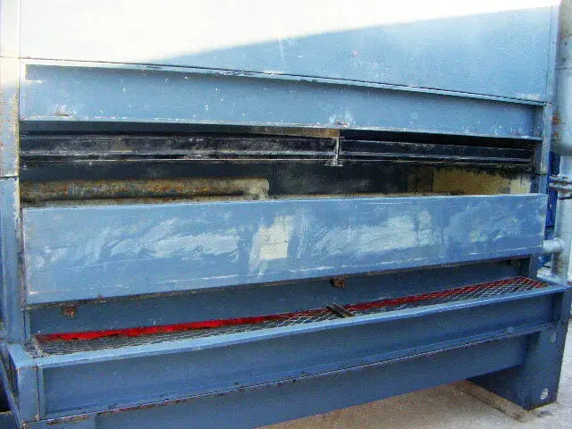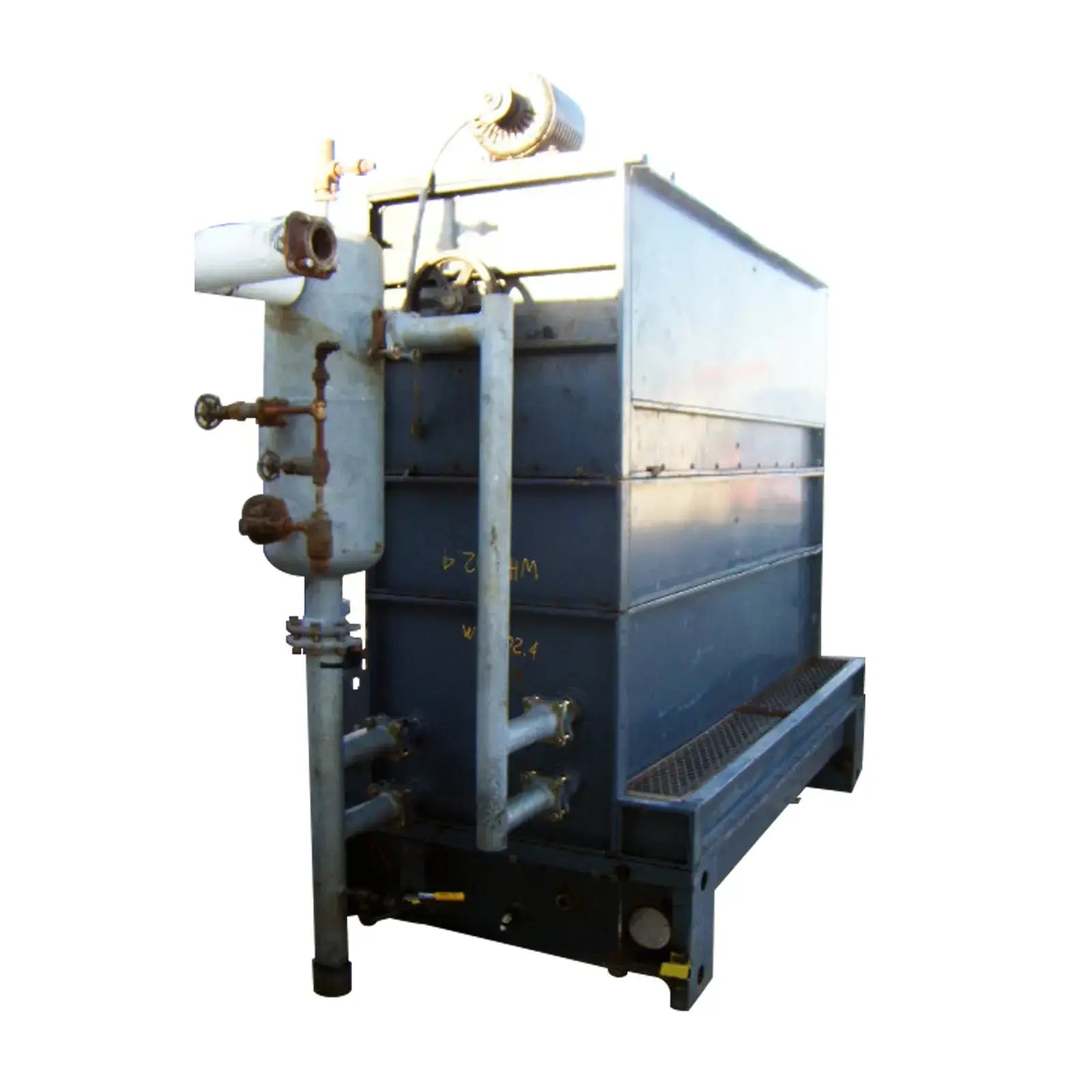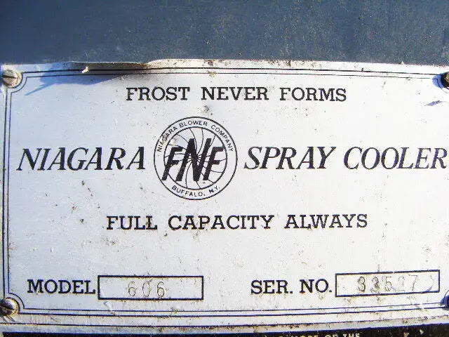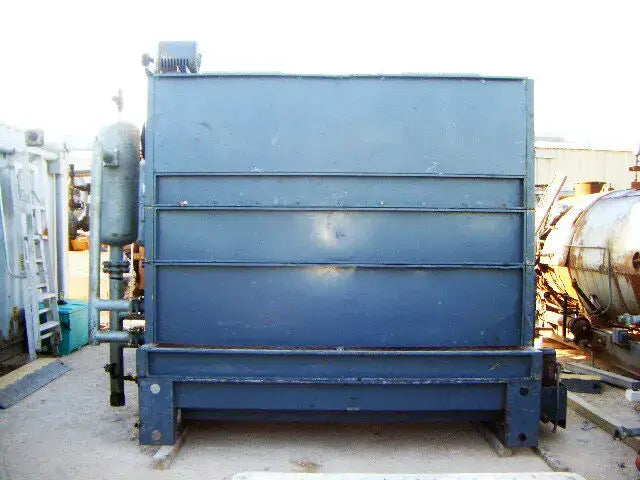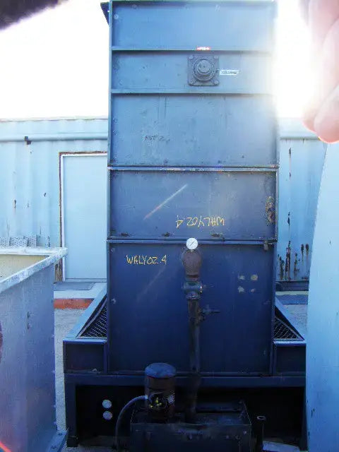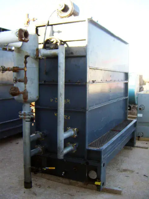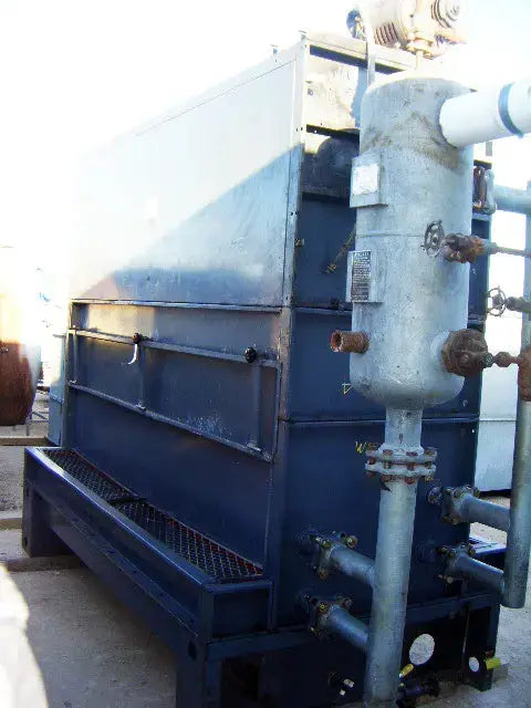 Evaporador enfriador por pulverización Niagara No-Frost. Modelo: 606. Refrigerante: usado por última vez con R-717 (amoniaco). (2) Ventiladores centrífugos. Motor Lincoln, 7,5 hp, 1450 rpm, 21/10,5 amperios, 208-230/460 V, 60 Hz, trifásico. Motor de bomba estadounidense: 3450 rpm, 2,7/1,35 amperios, 220/440 V, 60 Hz, trifásico. Proceso: Los ventiladores centrífugos extraen aire a través de un serpentín con circulación de refrigerante. El serpentín se rocía continuamente con una solución de glicol que elimina la humedad del aire que pasa a través del serpentín, lo que evita la acumulación de escarcha. Utilizado anteriormente en un congelador de lonja. Entradas: (2) 4 pulg. de diámetro. puertos, (1) 2 pulg. de diámetro. puerto, (1) 3 pulg. de diámetro. puerto. Salidas: (2) 4 pulg. de diámetro. puertos, (1) 2 pulg. de diámetro. puerto. Dimensiones totales: 14 pies x 2 pulgadas de largo x 5 pies de ancho x 10 pies 8 pulgadas de alto.